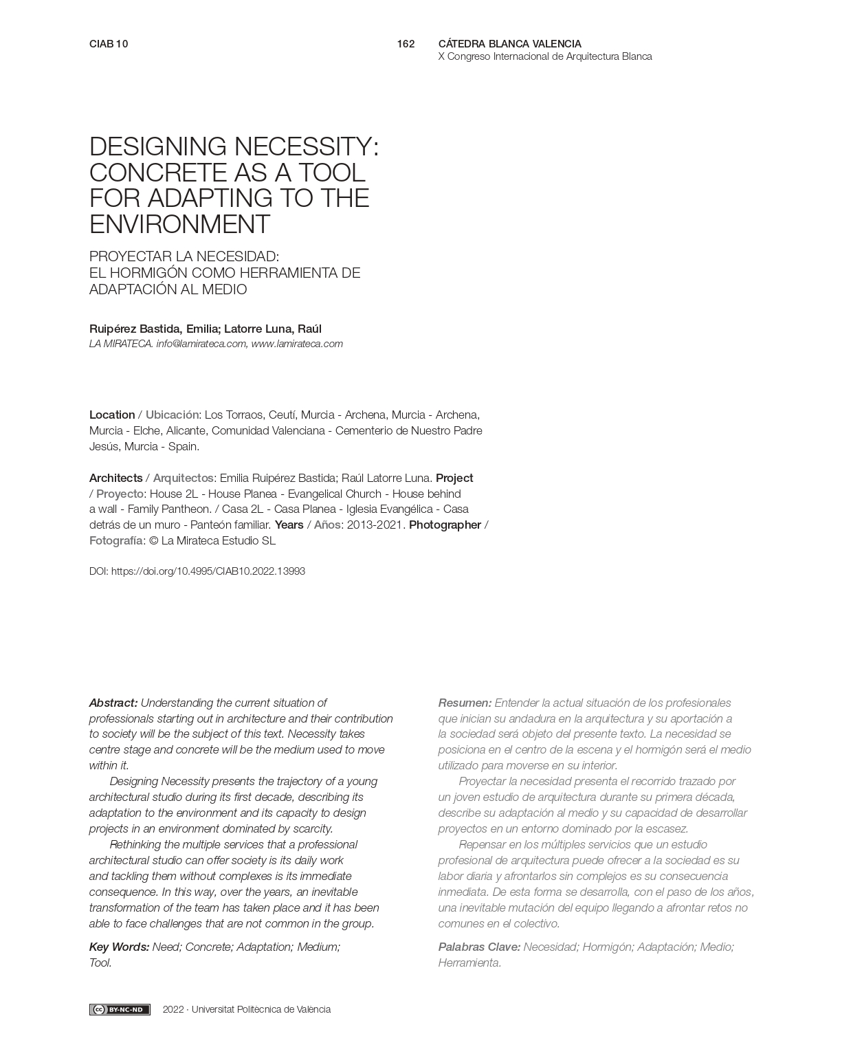 Entender la actual situación de los profesionales que inician su andadura en la arquitectura y su aportación a la sociedad será objeto del presente texto. La necesidad se posiciona en el centro de la escena y el hormigón será el medio utilizado para moverse en su interior. Proyectar la necesidad presenta el recorrido trazado por un joven estudio de arquitectura durante su primera década, describe su adaptación al medio y su capacidad de desarrollar proyectos en un entorno dominado por la escasez. Repensar en los múltiples servicios que un estudio profesional de arquitectura puede ofrecer a la sociedad es su labor diaria y afrontarlos sin complejos es su consecuencia inmediata. De esta forma se desarrolla, con el paso de los años, una inevitable mutación del equipo llegando a afrontar retos no comunes en el colectivo.