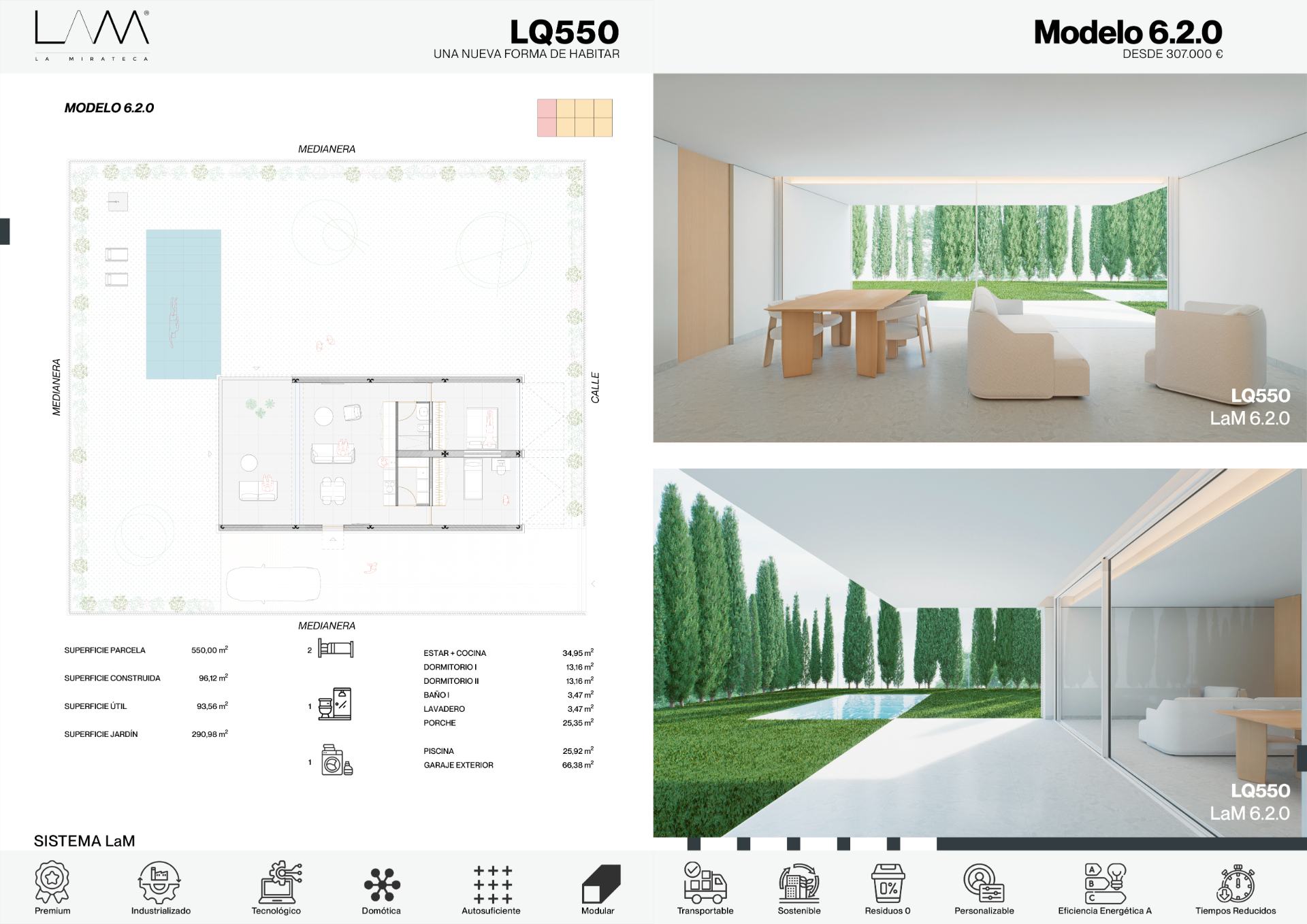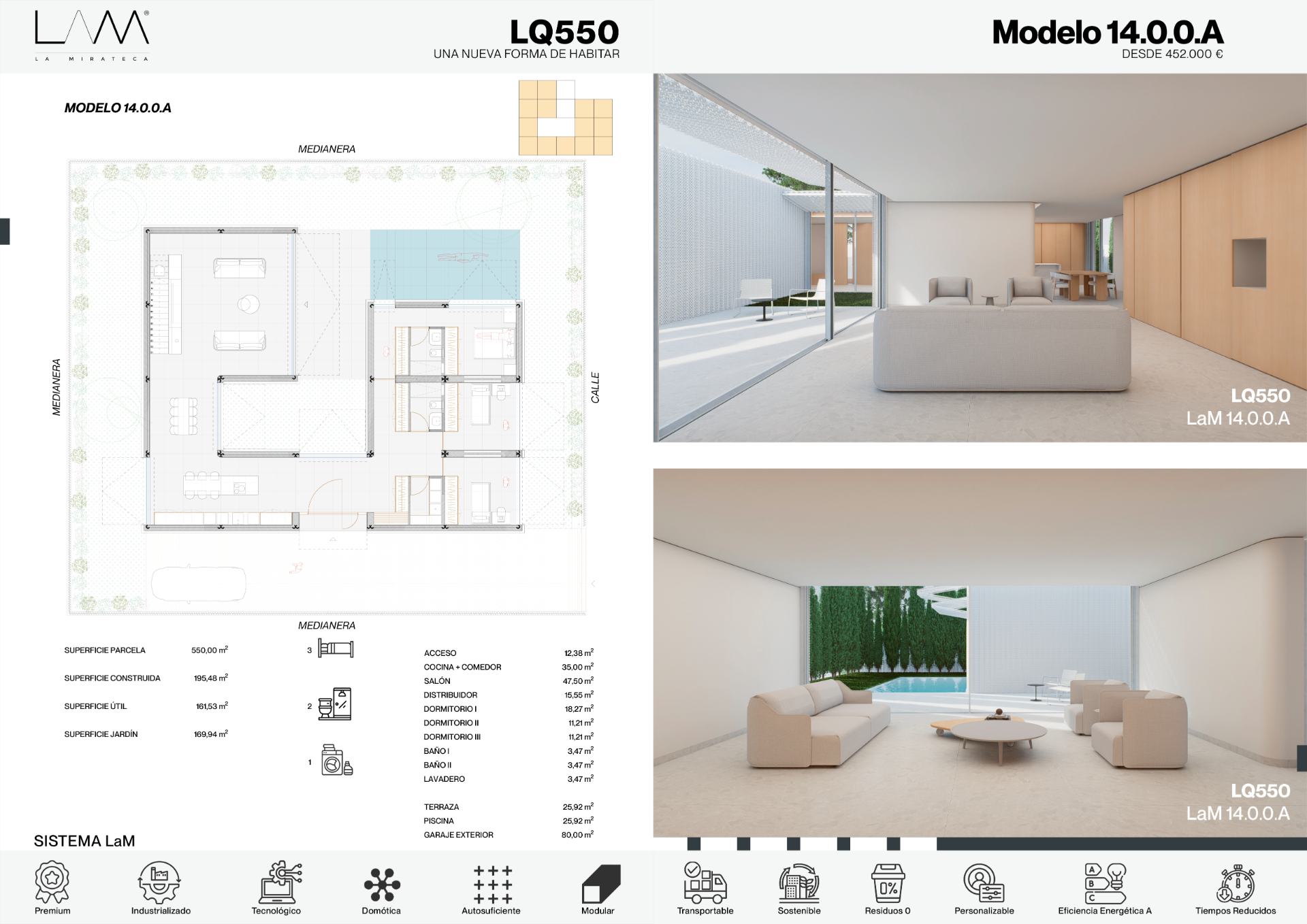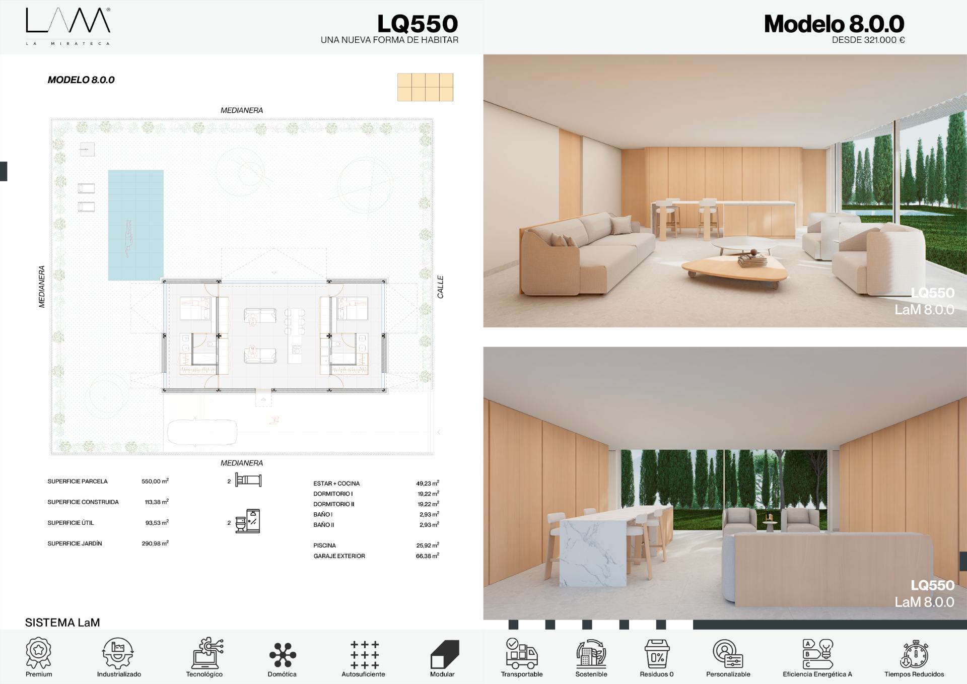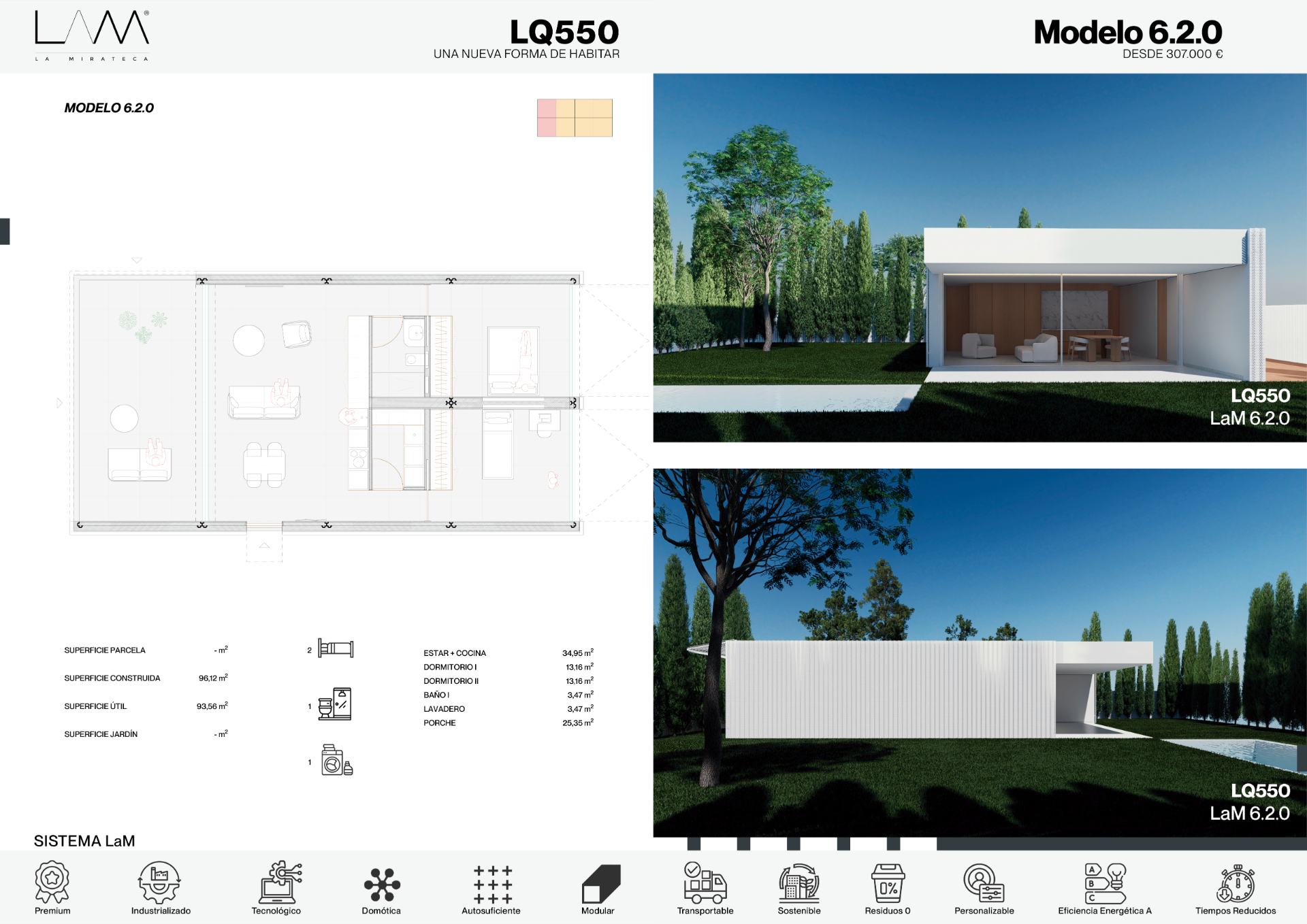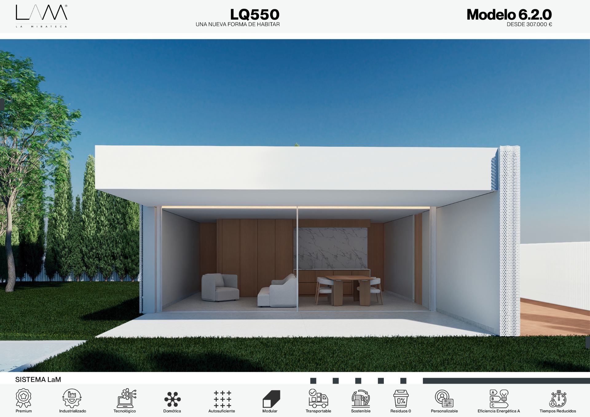 LQ550 ha proyectado con creatividad y precisión viviendas unifamiliares aisladas en parcelas de 550,00 m2 alojando los modelos industrializados del SISTEMA LaM 6.2.0, 8.0.0, 8.2.0, 10.2.0 y 14.0.0; caracterizados por su tecnología y autosuficiencia (etiqueta A).