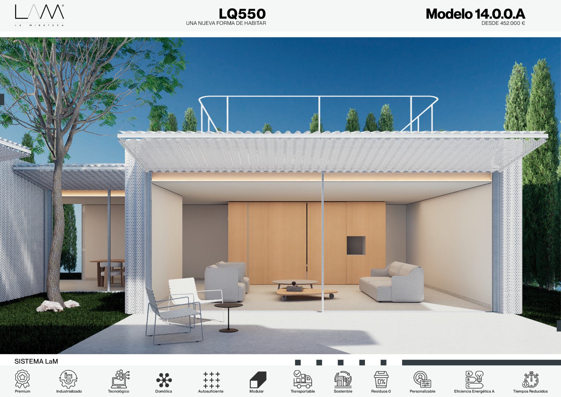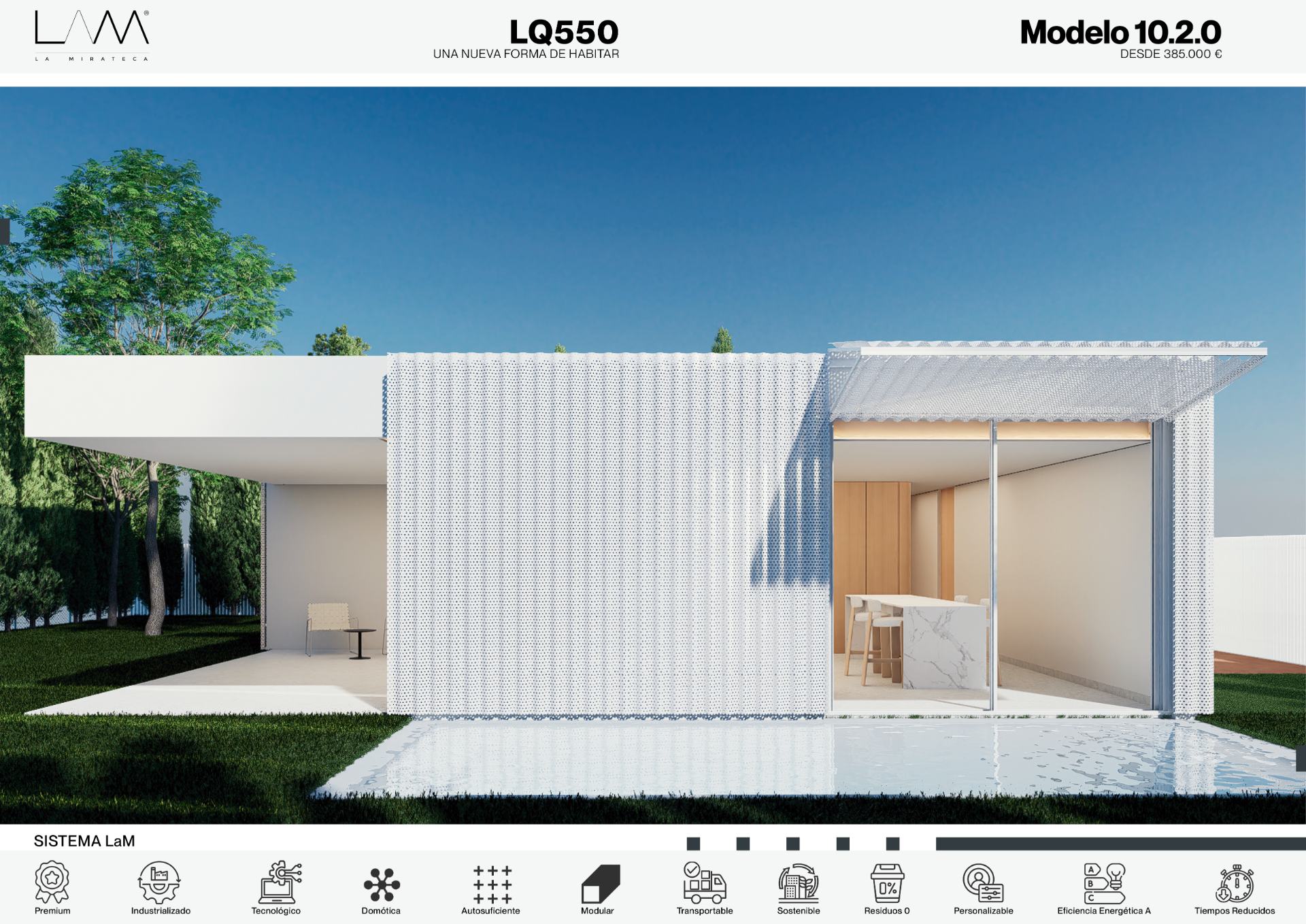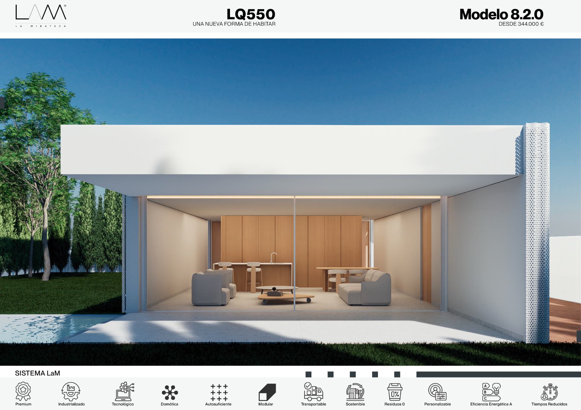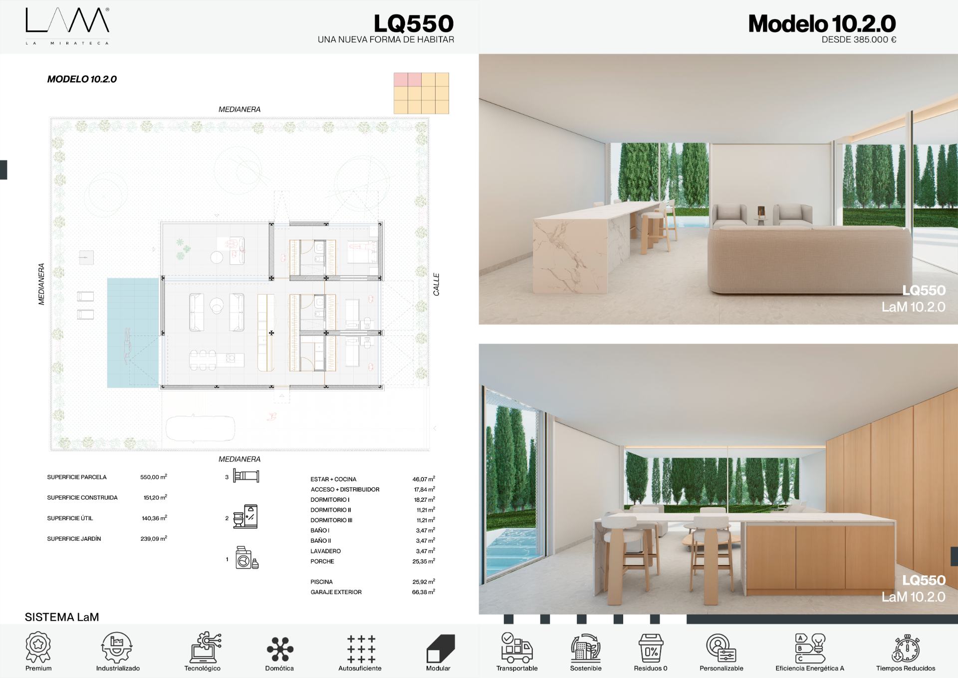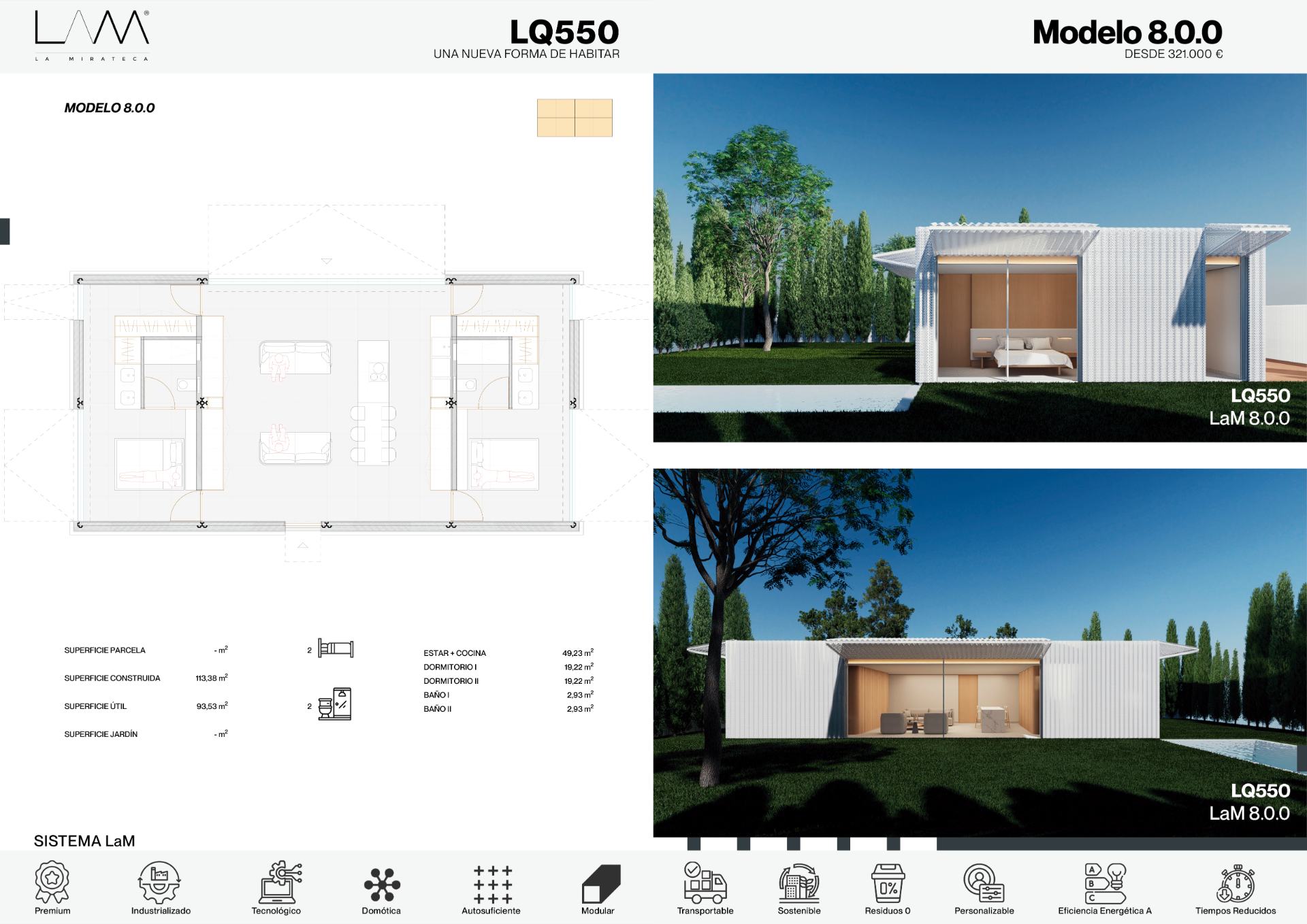 LQ550 ha proyectado con creatividad y precisión viviendas unifamiliares aisladas en parcelas de 550,00 m2 alojando los modelos industrializados del SISTEMA LaM 6.2.0, 8.0.0, 8.2.0, 10.2.0 y 14.0.0; caracterizados por su tecnología y autosuficiencia (etiqueta A).