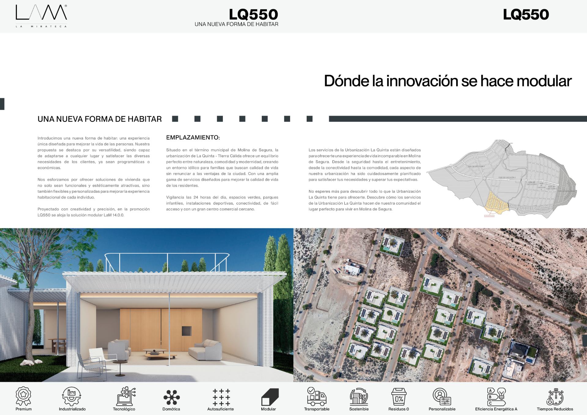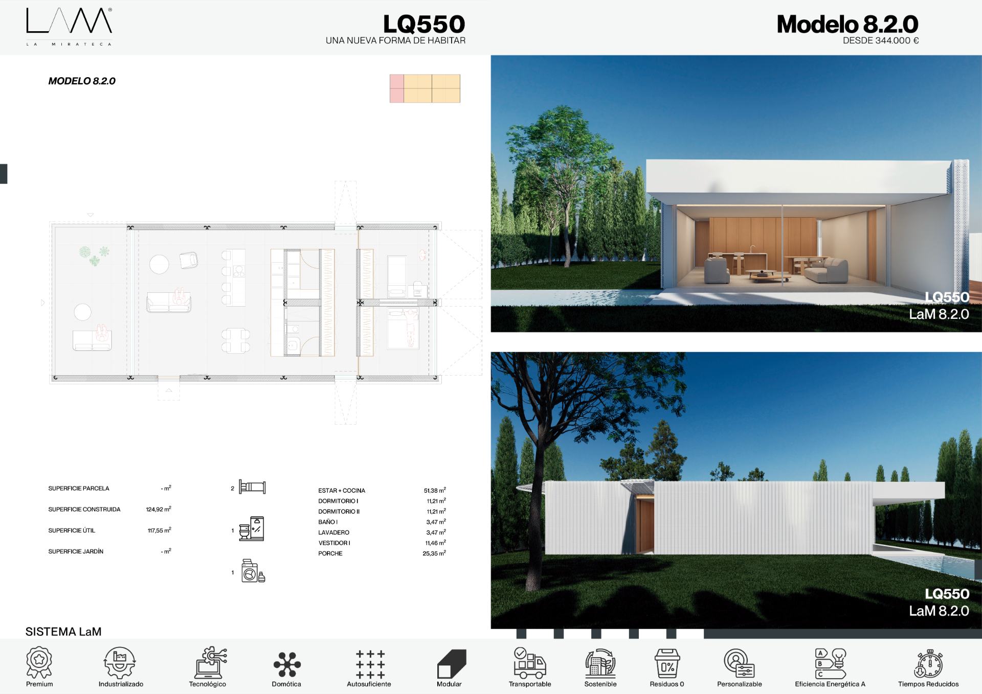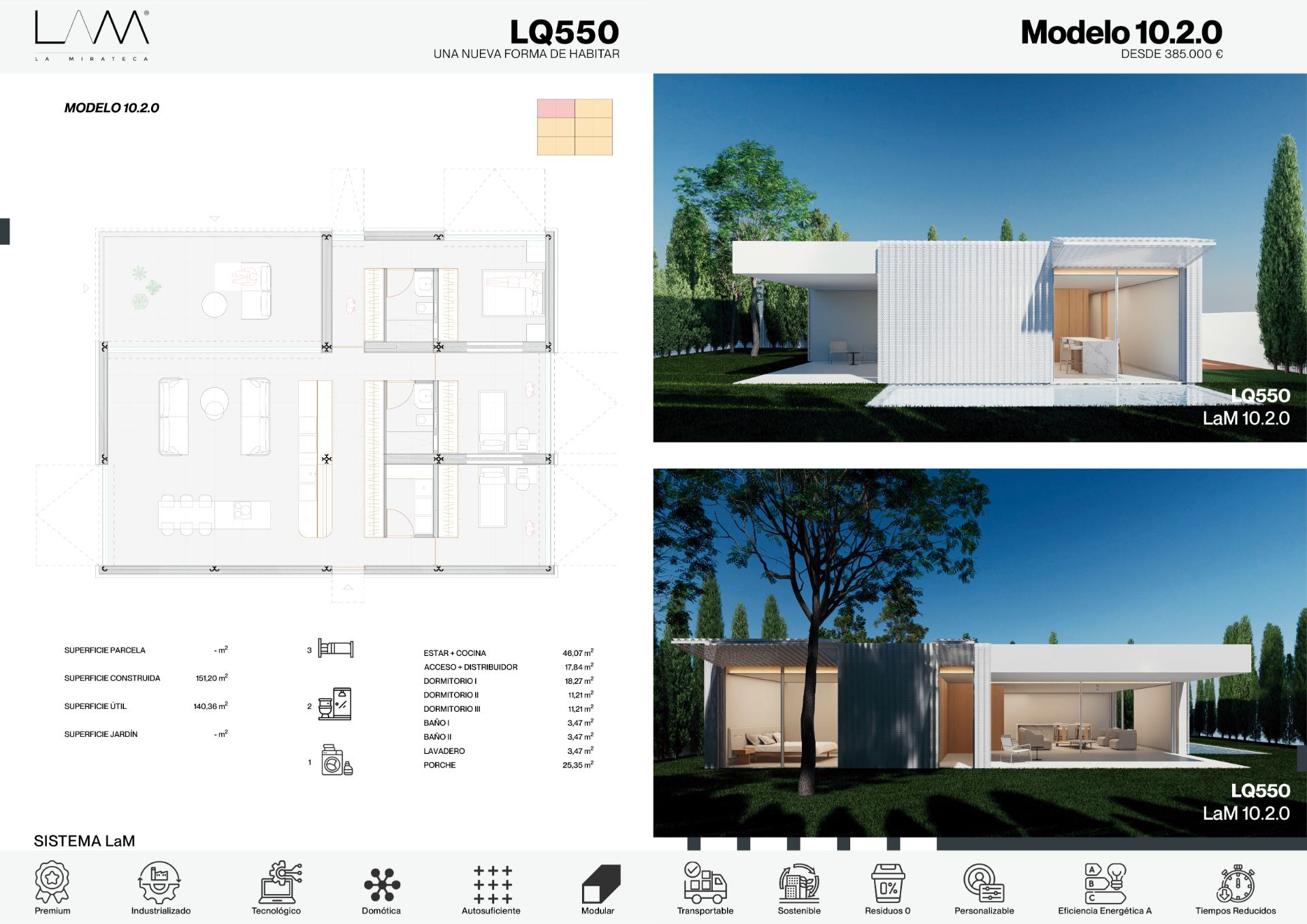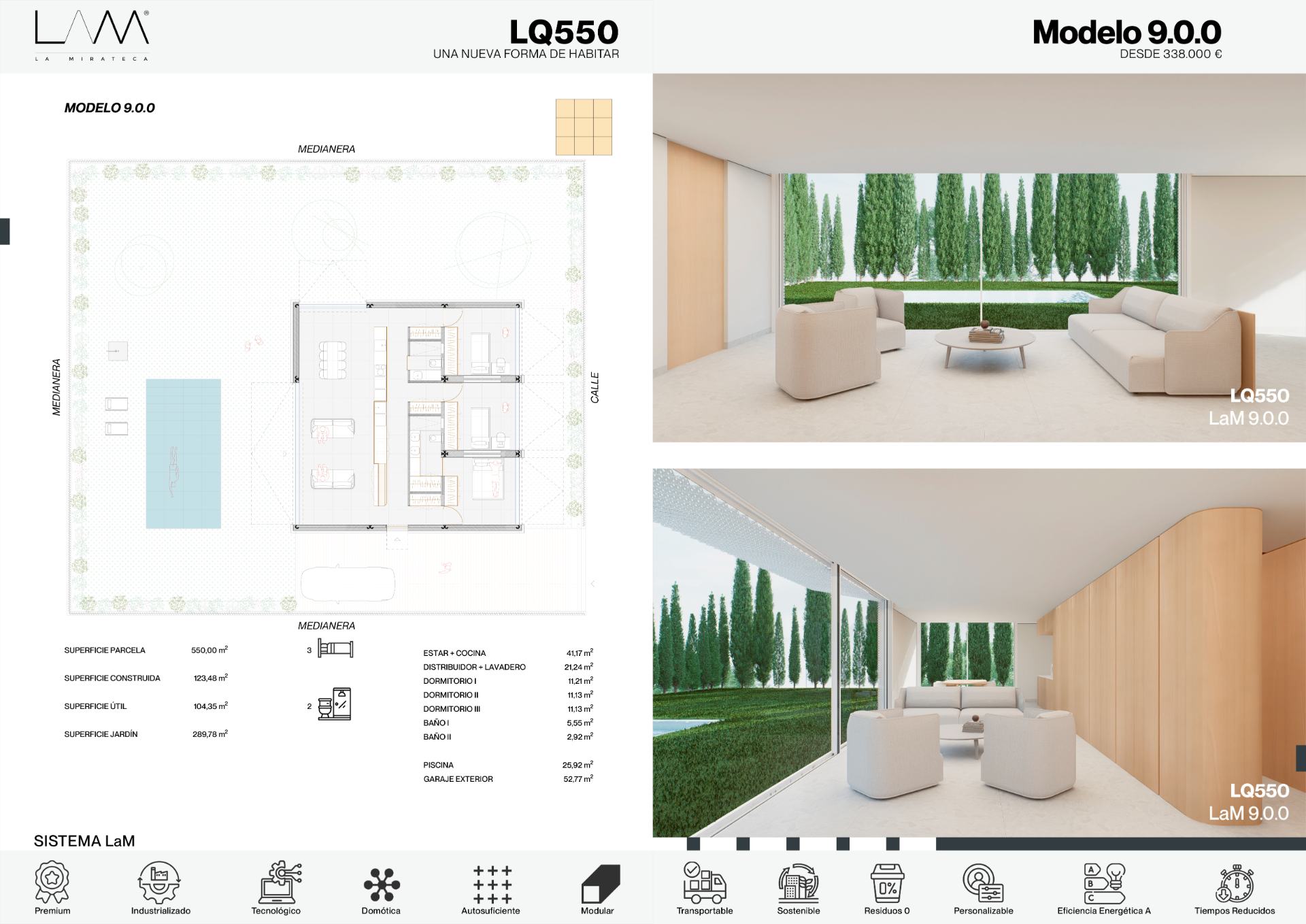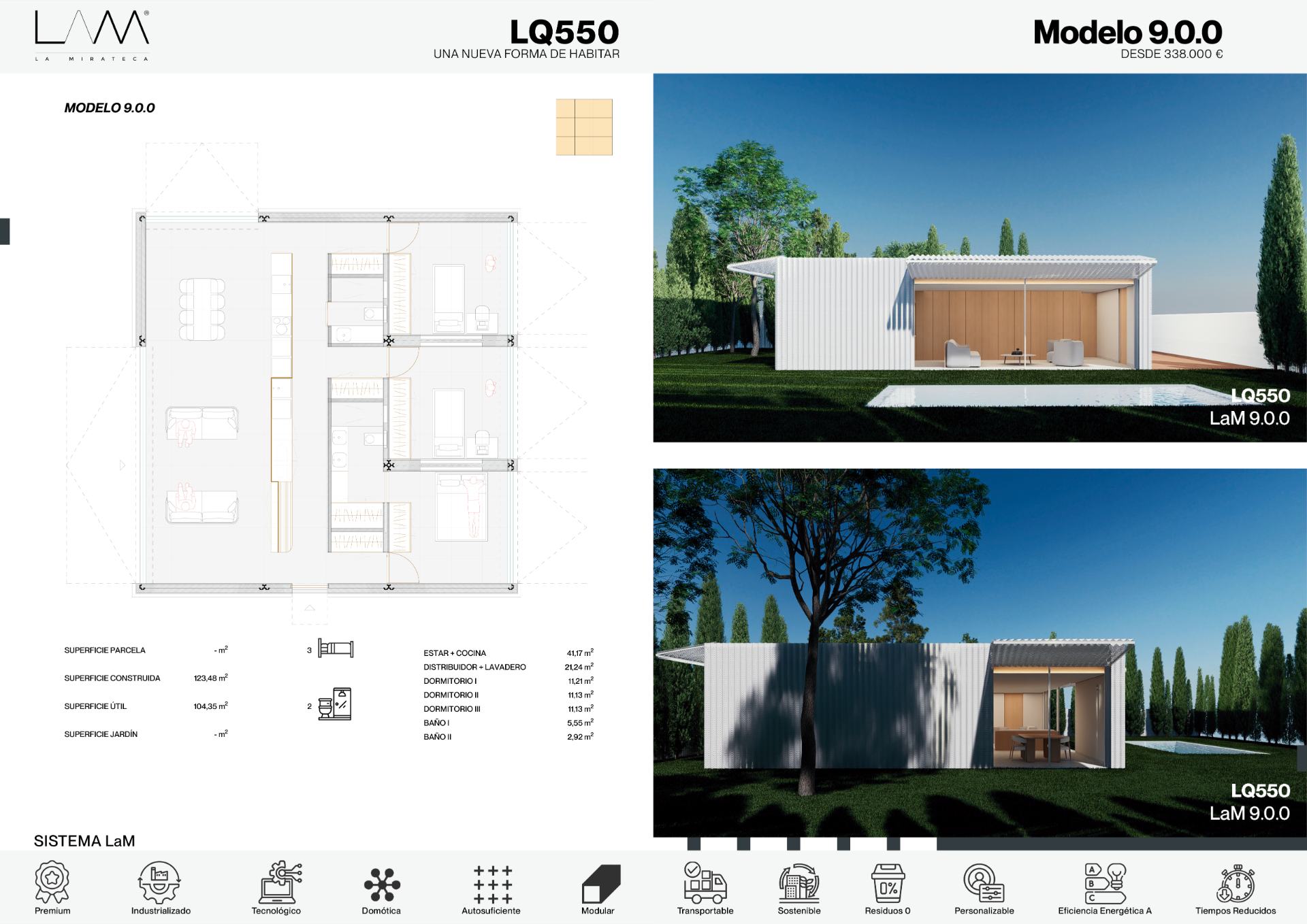 LQ550 ha proyectado con creatividad y precisión viviendas unifamiliares aisladas en parcelas de 550,00 m2 alojando los modelos industrializados del SISTEMA LaM 6.2.0, 8.0.0, 8.2.0, 10.2.0 y 14.0.0; caracterizados por su tecnología y autosuficiencia (etiqueta A).
