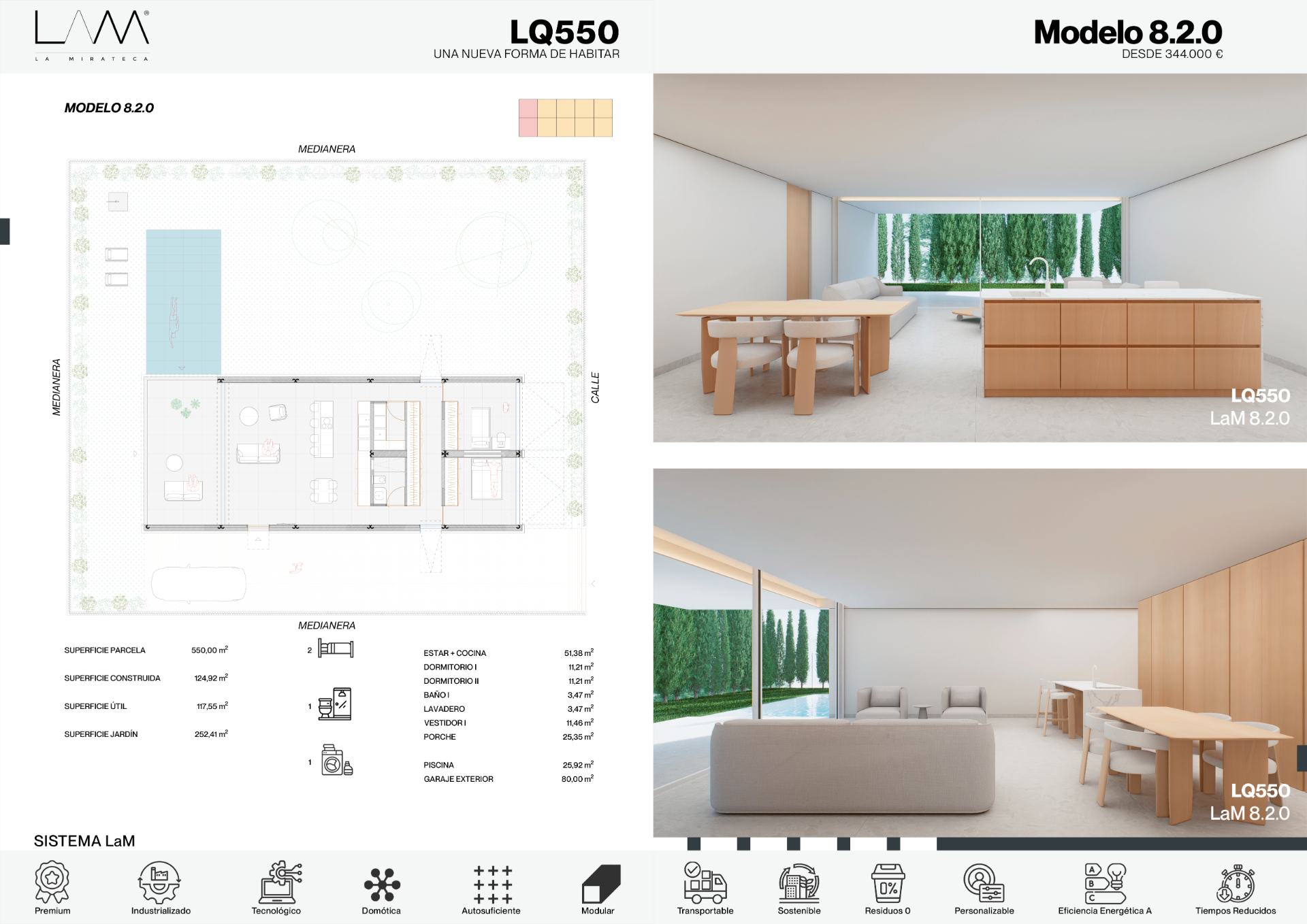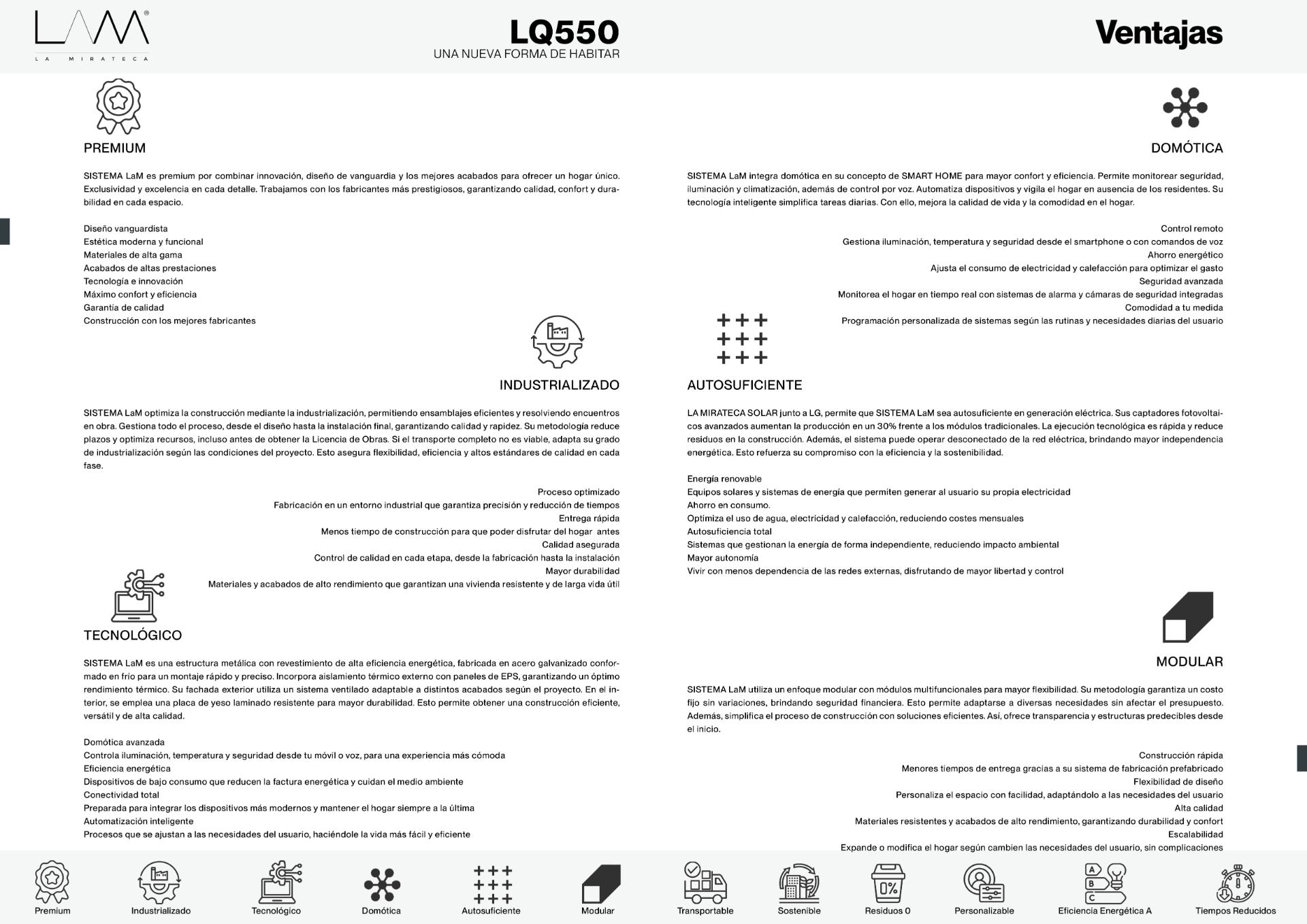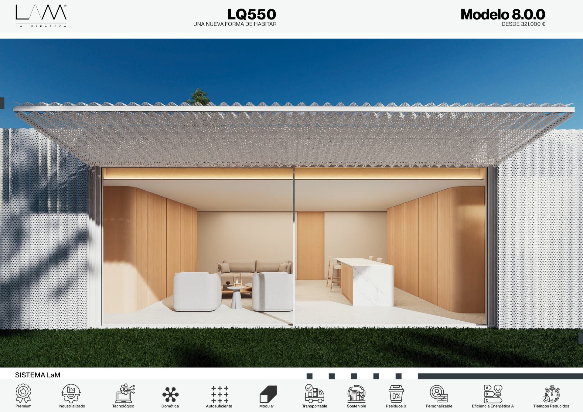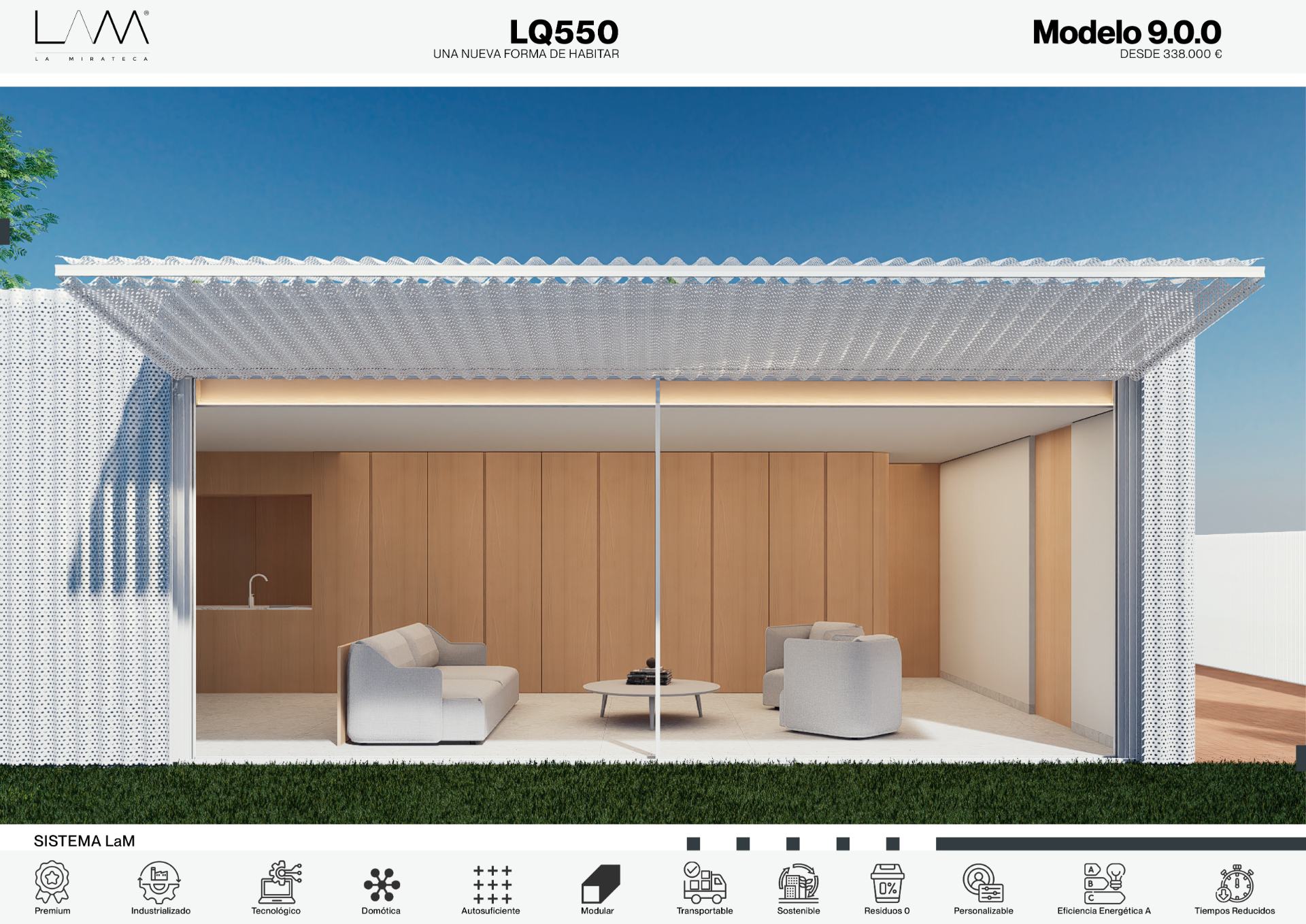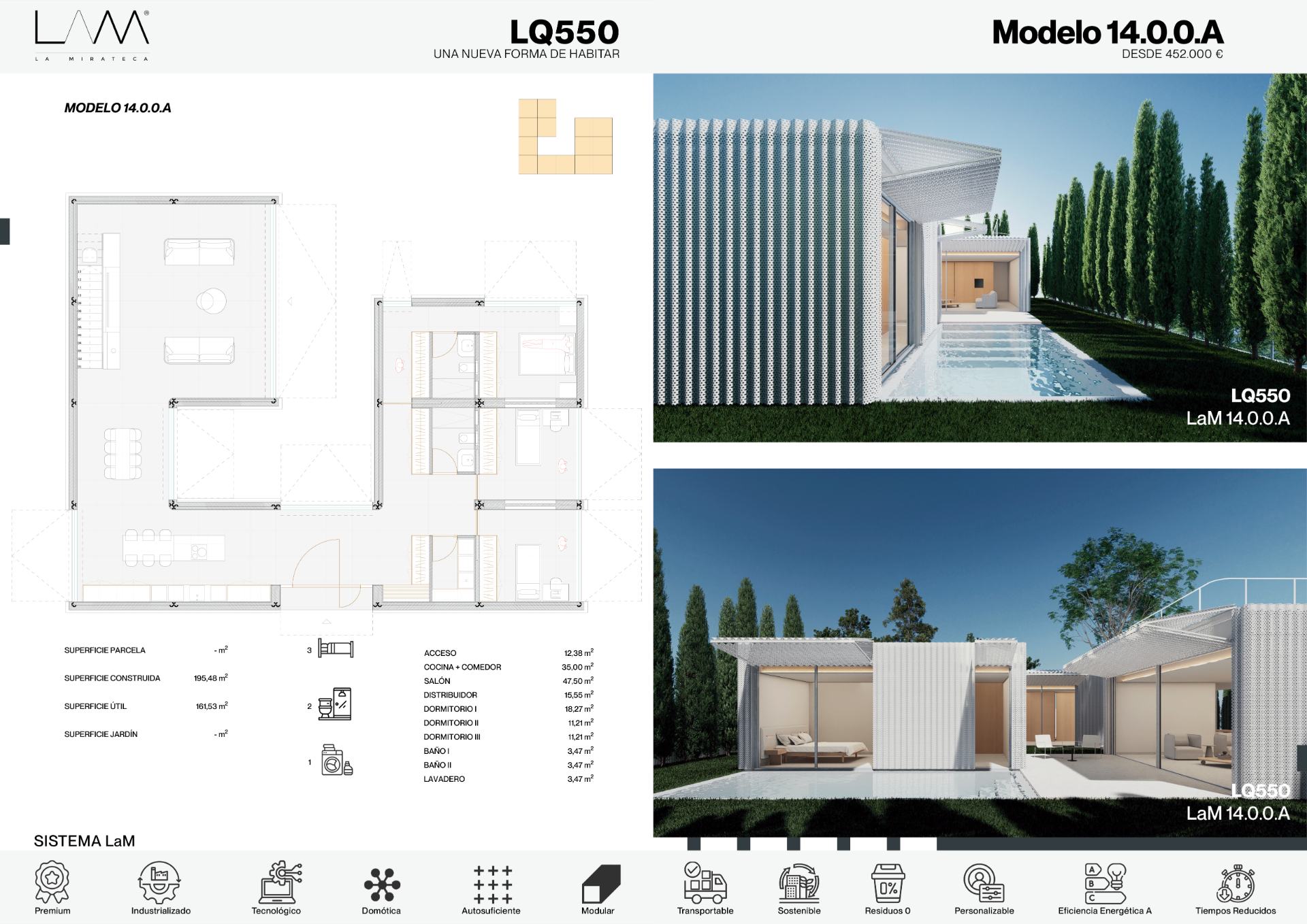LQ550 ha proyectado con creatividad y precisión viviendas unifamiliares aisladas en parcelas de 550,00 m2 alojando los modelos industrializados del SISTEMA LaM 6.2.0, 8.0.0, 8.2.0, 10.2.0 y 14.0.0; caracterizados por su tecnología y autosuficiencia (etiqueta A).