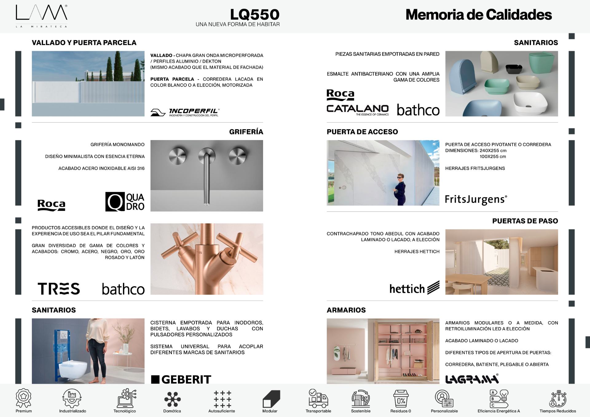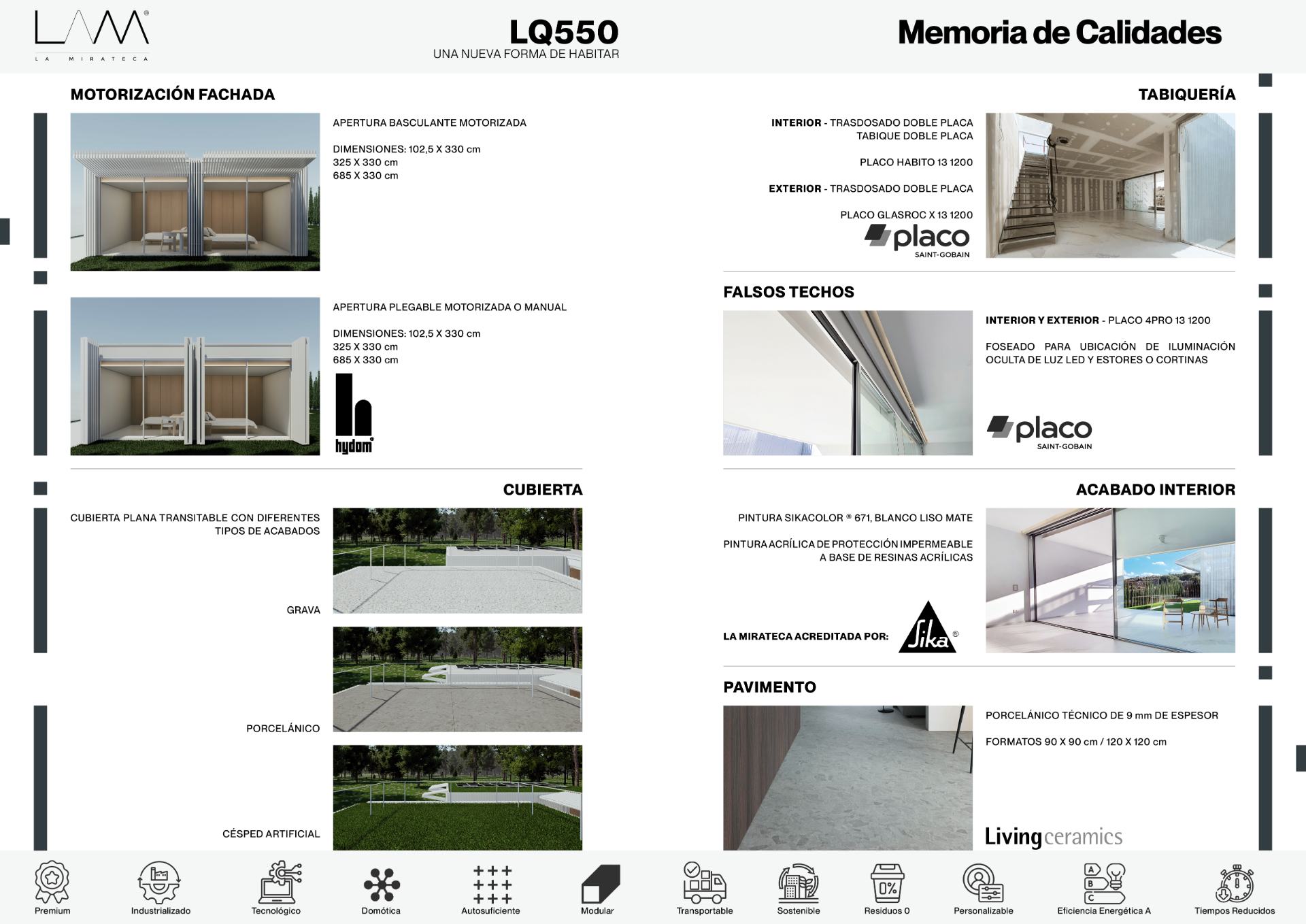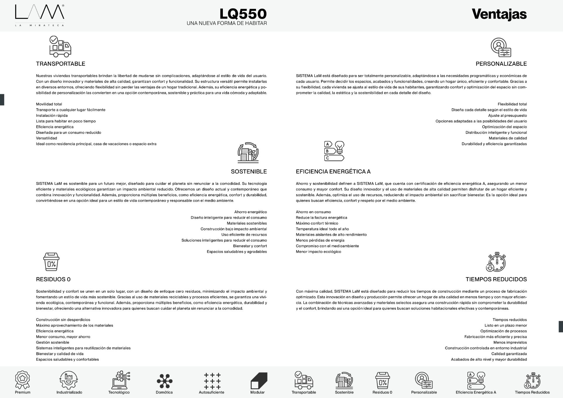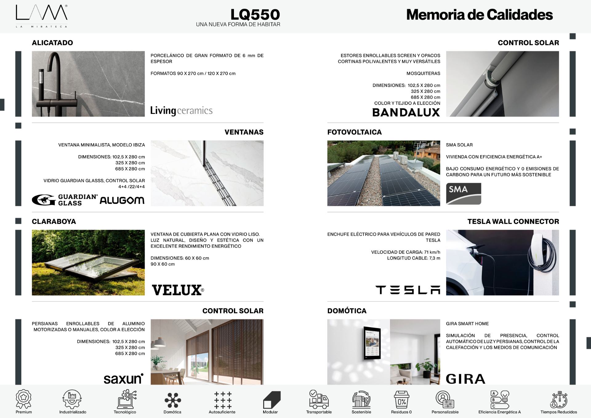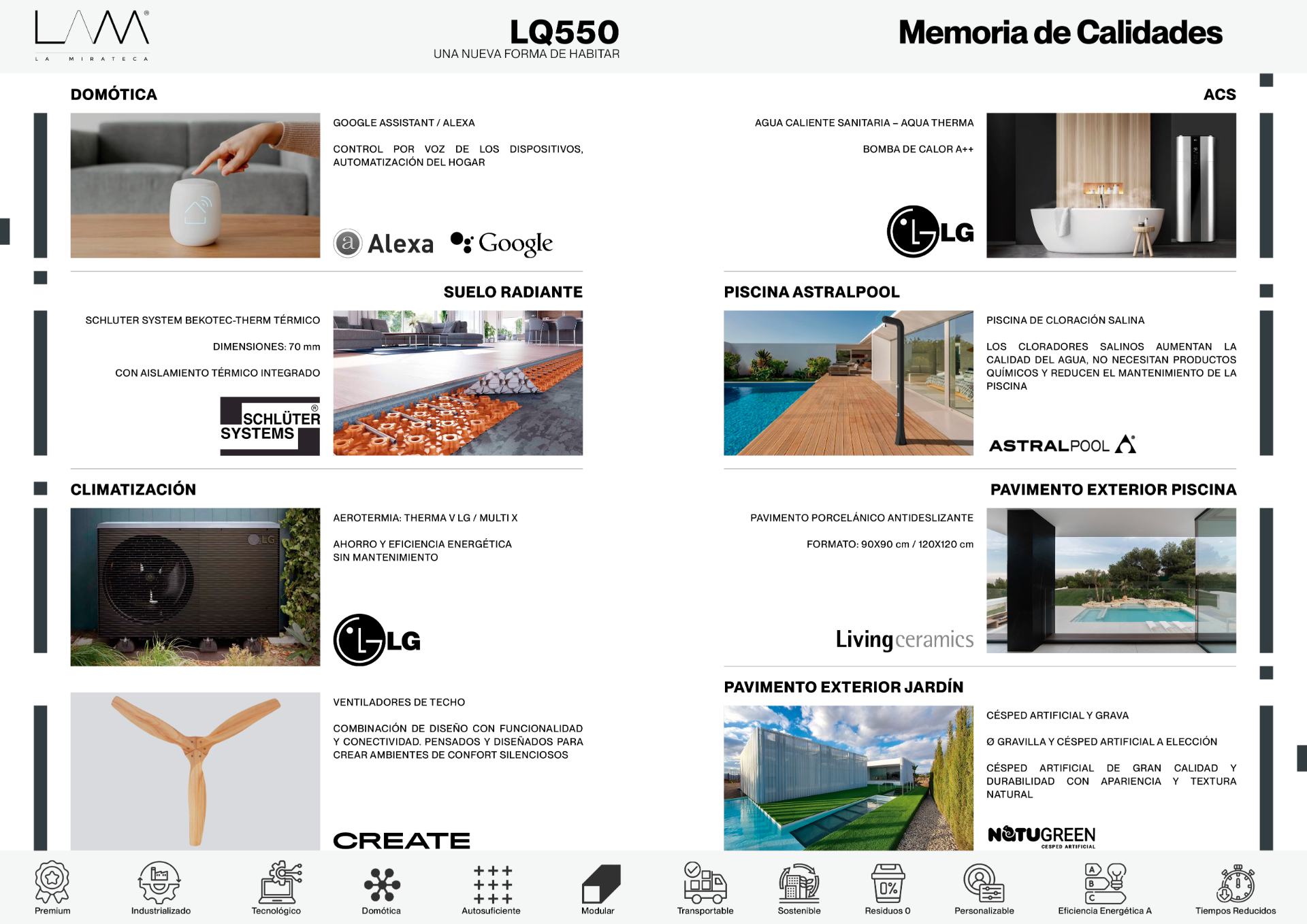 LQ550 ha proyectado con creatividad y precisión viviendas unifamiliares aisladas en parcelas de 550,00 m2 alojando los modelos industrializados del SISTEMA LaM 6.2.0, 8.0.0, 8.2.0, 10.2.0 y 14.0.0; caracterizados por su tecnología y autosuficiencia (etiqueta A).