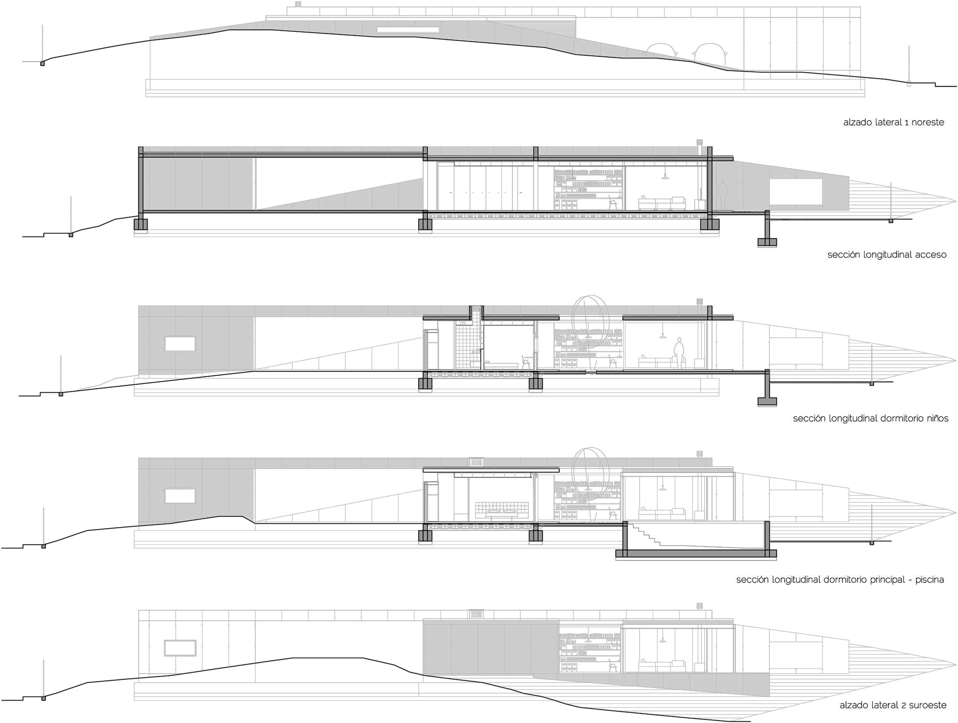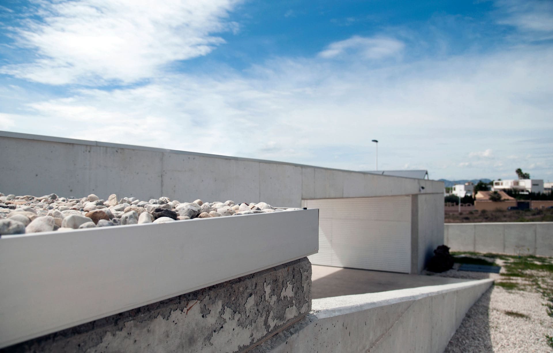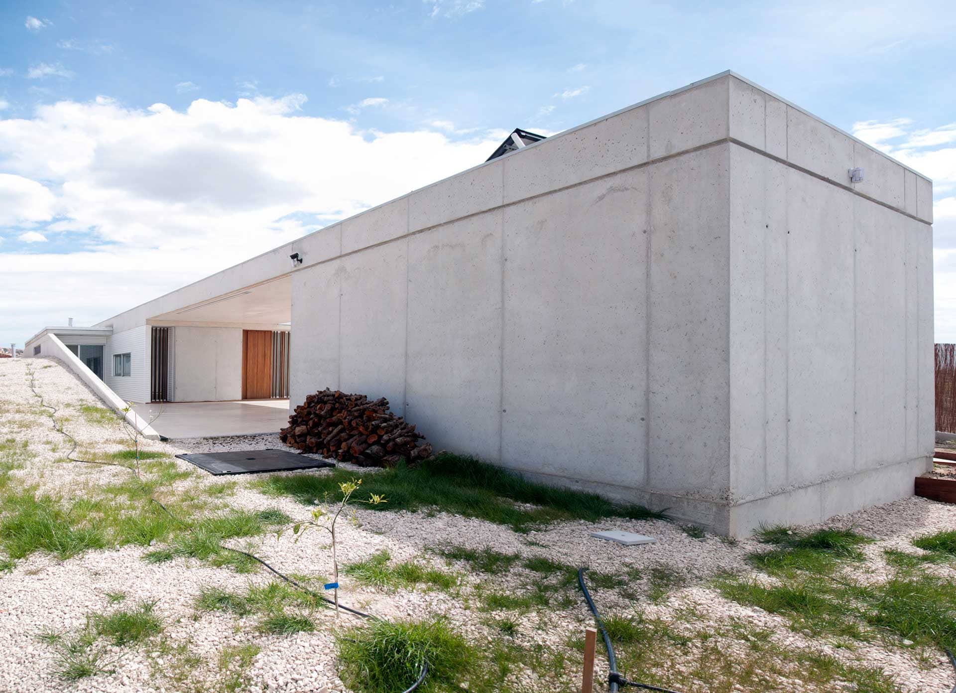 Un muro ubicado en la zona más alta de la parcela corta el terreno haciendo que la vivienda quede semienterrada y solventando así los problemas de intimidad que las parcelas colindantes le puedan generar. En esta zona se alojan los espacios de servicios facilitando así la configuración del espacio diáfano de la zona de día y permitiendo el acceso a la cubierta a través de una rampa para poder contemplar el paisaje.