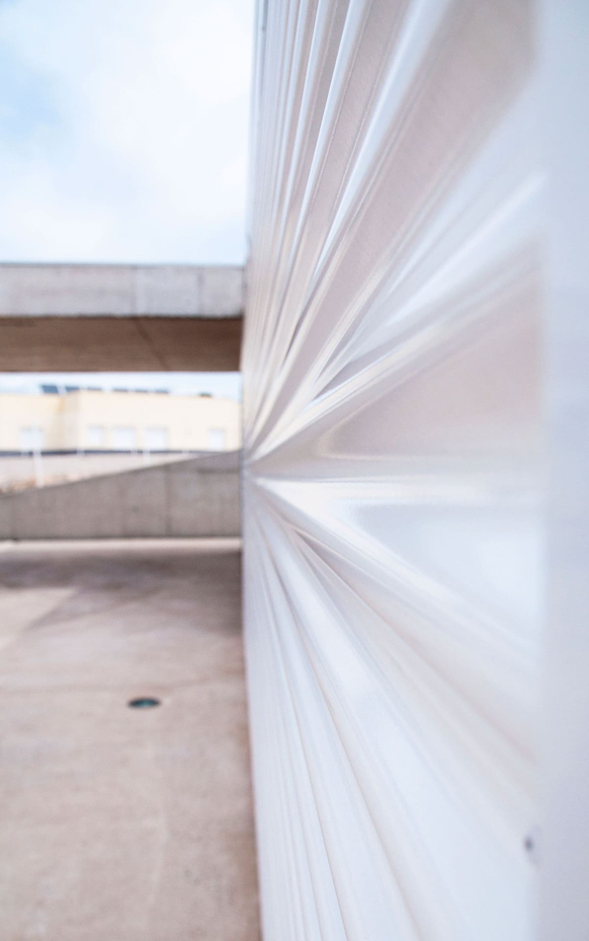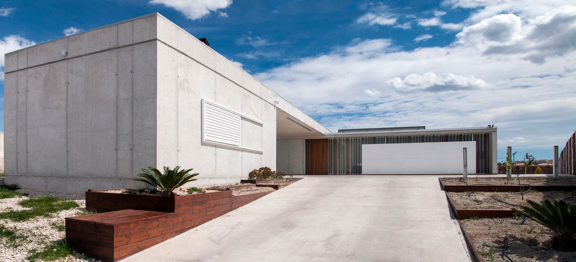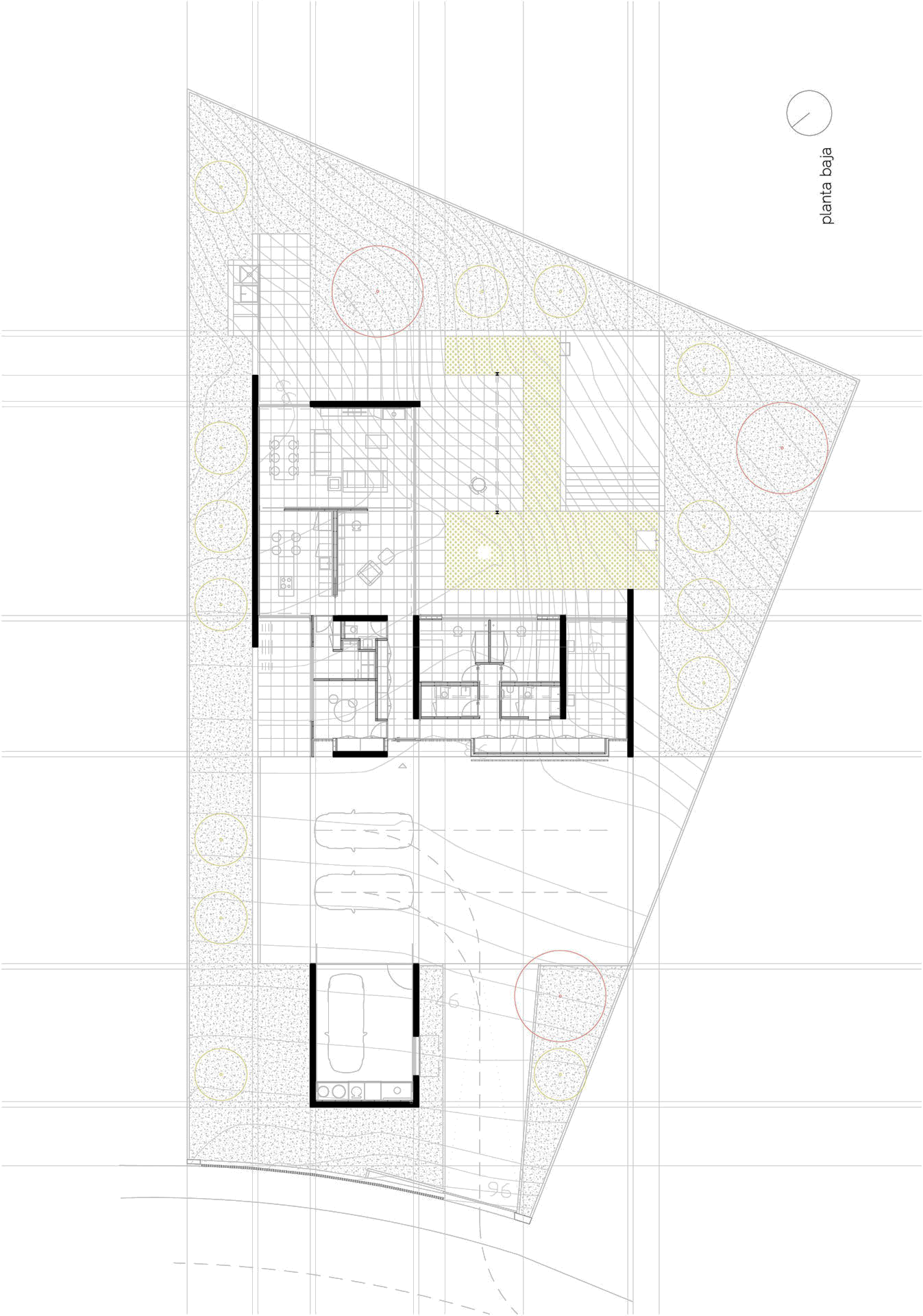Un muro ubicado en la zona más alta de la parcela corta el terreno haciendo que la vivienda quede semienterrada y solventando así los problemas de intimidad que las parcelas colindantes le puedan generar. En esta zona se alojan los espacios de servicios facilitando así la configuración del espacio diáfano de la zona de día y permitiendo el acceso a la cubierta a través de una rampa para poder contemplar el paisaje.