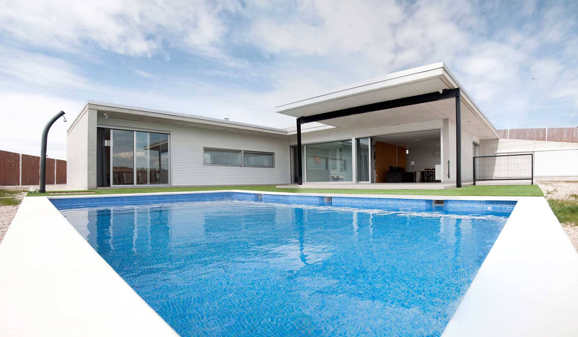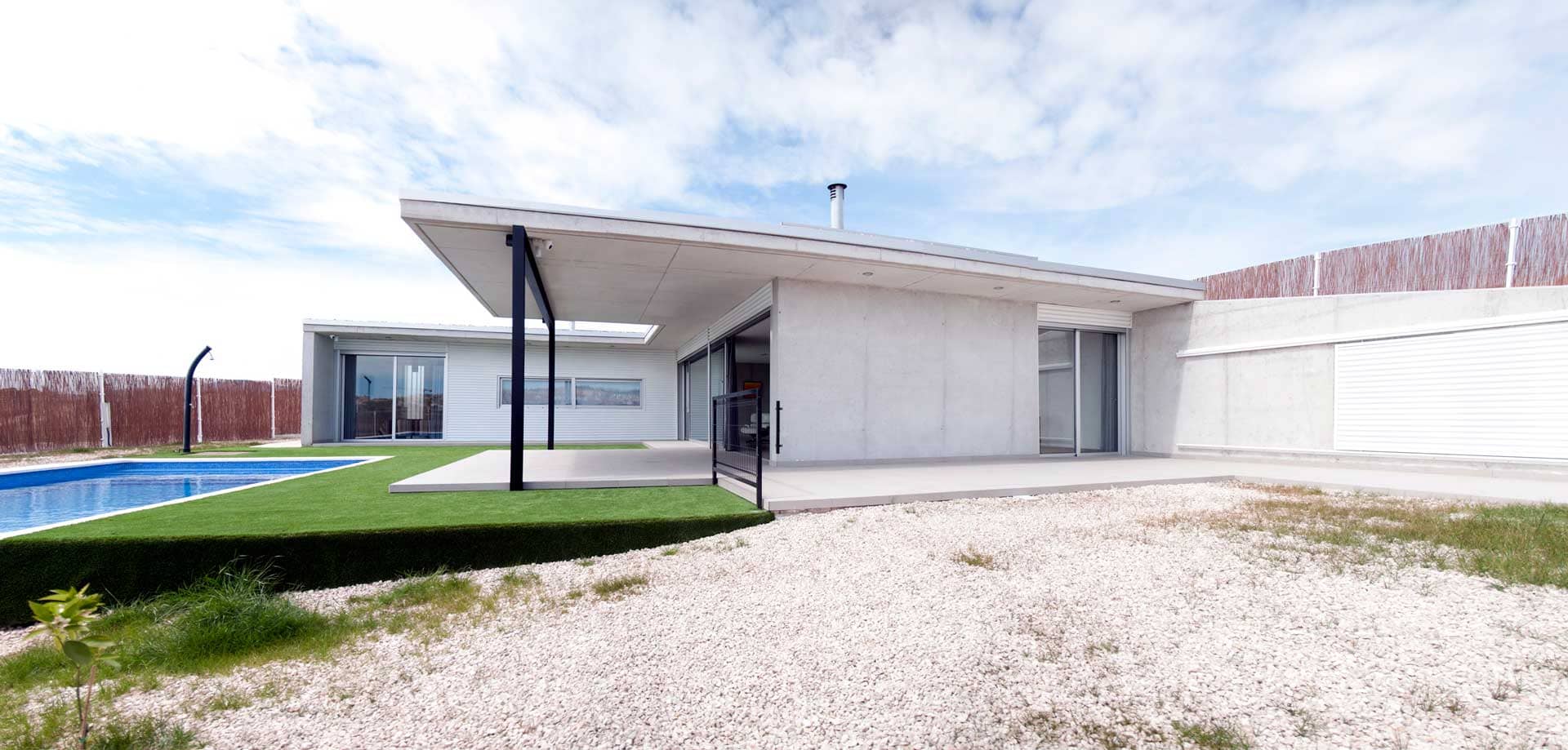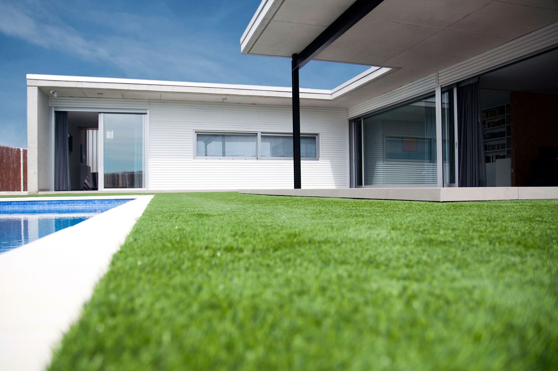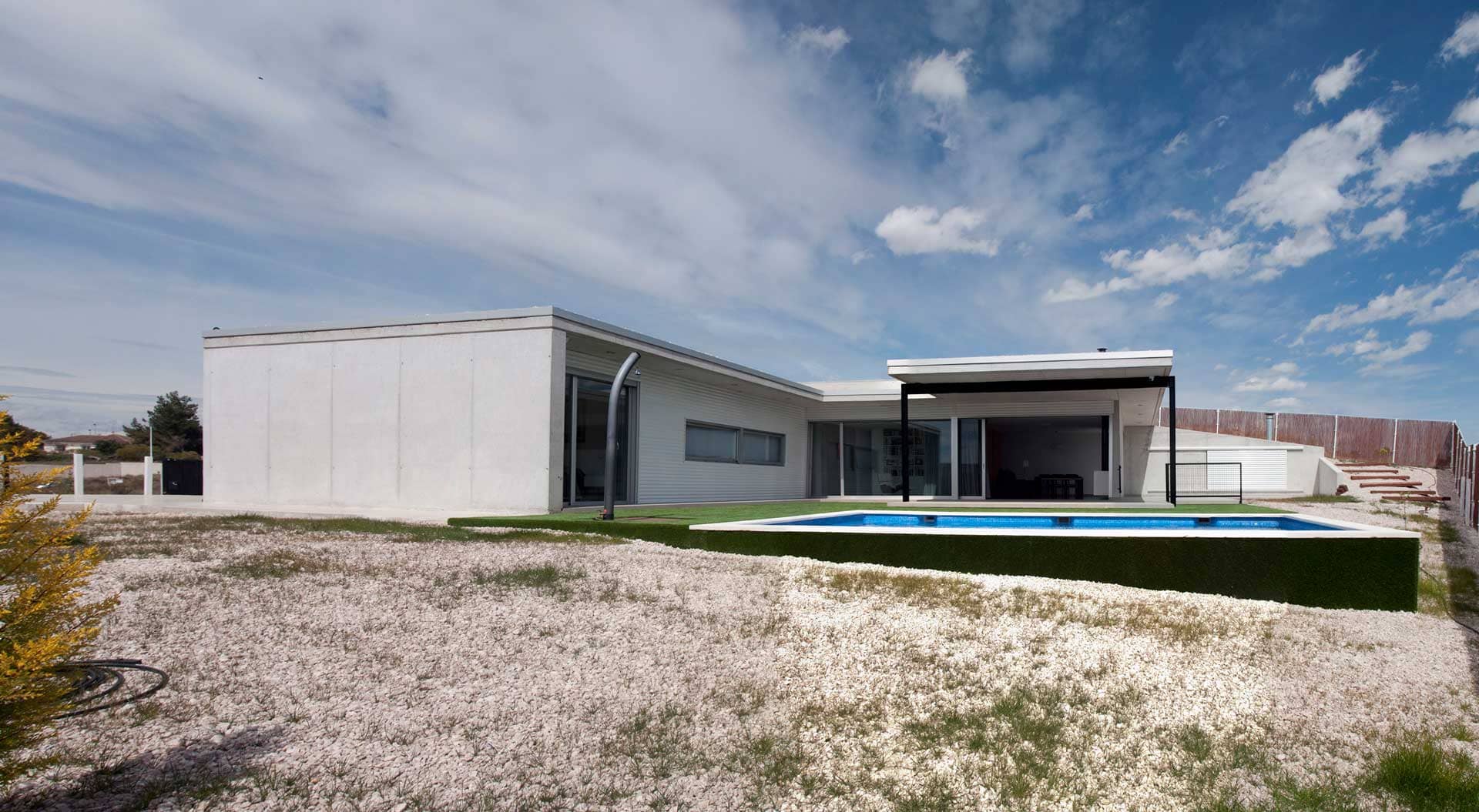 La vivienda se articula bajo un plano vegetal ayudando a integrarla en un entorno natural escaso de edificación. Este plano vegetal, la cubierta, se quiebra para configurar la zona de día. Ésta se caracteriza por ser un esquema en “L” dominado por un gran plano en sombra donde el suelo se despega de la orografía natural para ubicar la piscina. La forma deja de ser opaca para permitir una directa relación entre el interior y el exterior construida mediante una ventana de grandes dimensiones que permite la duplicidad de los espacios de día.