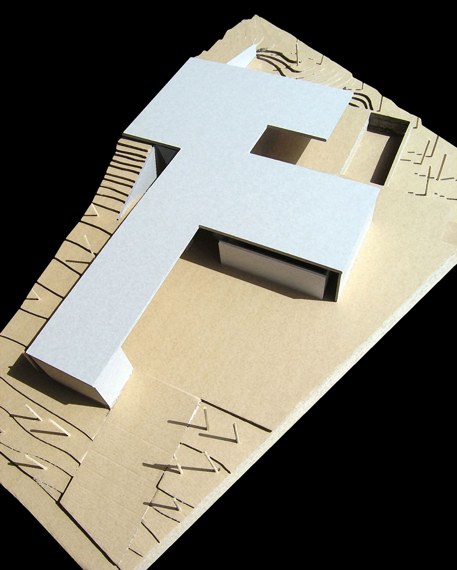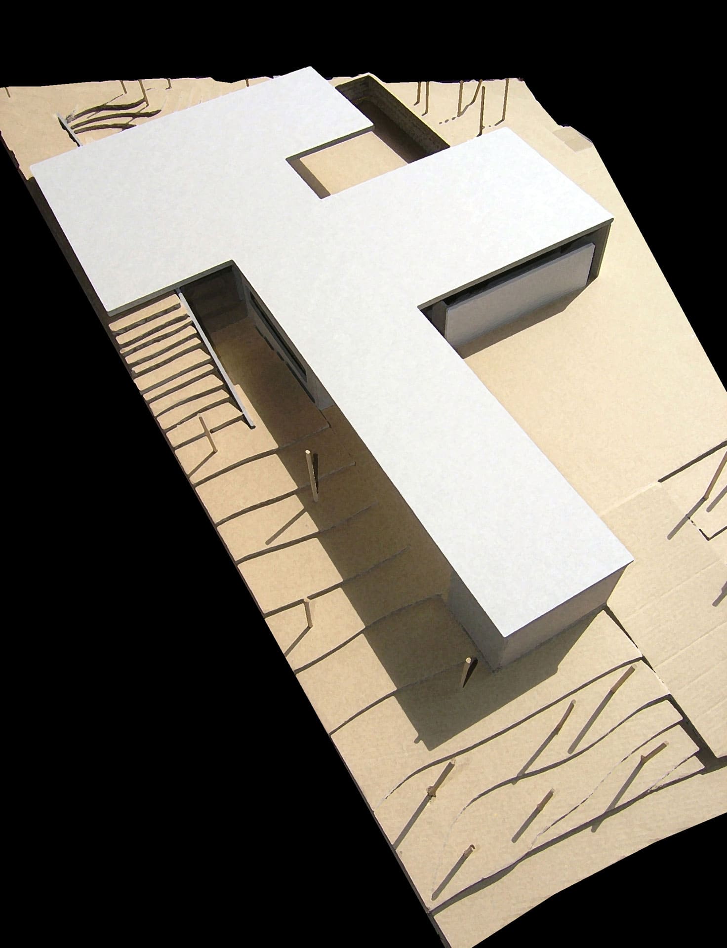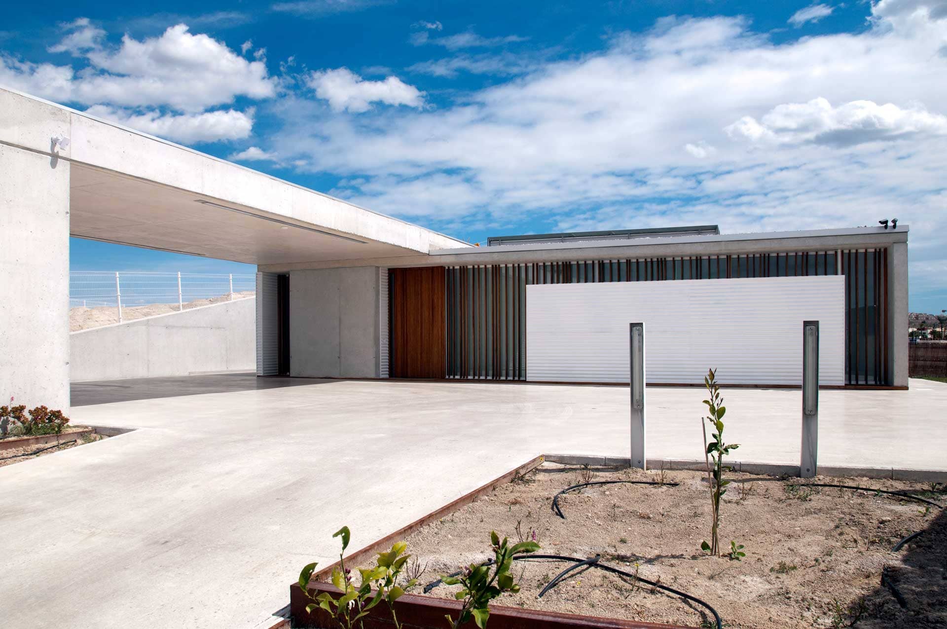 El acceso se convierte en el elemento estructurador del proyecto y generatriz de la formalización del mismo. Vehículos y peatón acceden por el mismo punto absorbidos por una única rampa llevándolos hasta una zona en sombra donde no sólo se alojan los coches sino también se ubica la puerta de acceso al interior de la vivienda. Esta puerta estructura las escasas circulaciones interiores y subdivide el espacio en público y privado. El atrio de entrada se caracteriza por la ausencia de huecos y un plano como fondo de escena tras el cual se alojan los dormitorios hace que el visitante no pueda intuir lo que sucede en las zonas privadas de la casa.