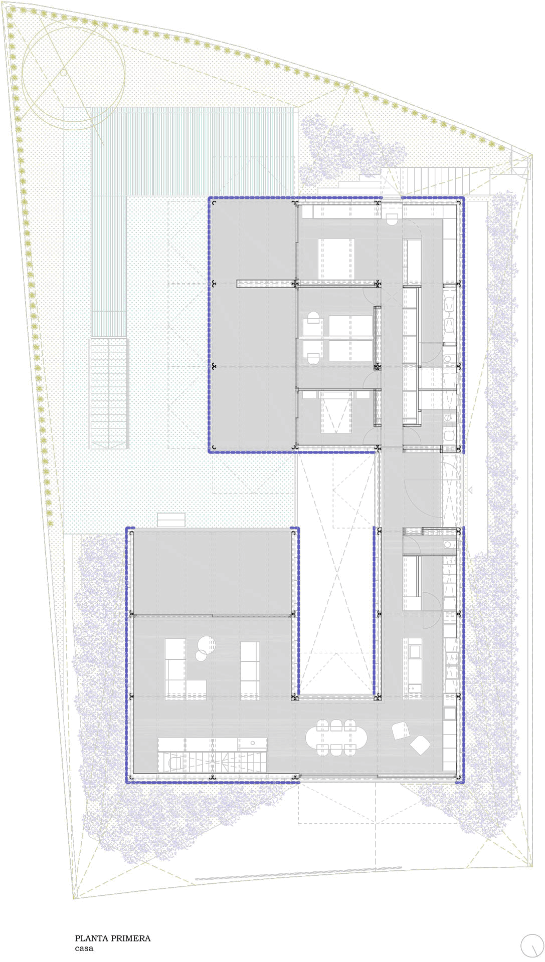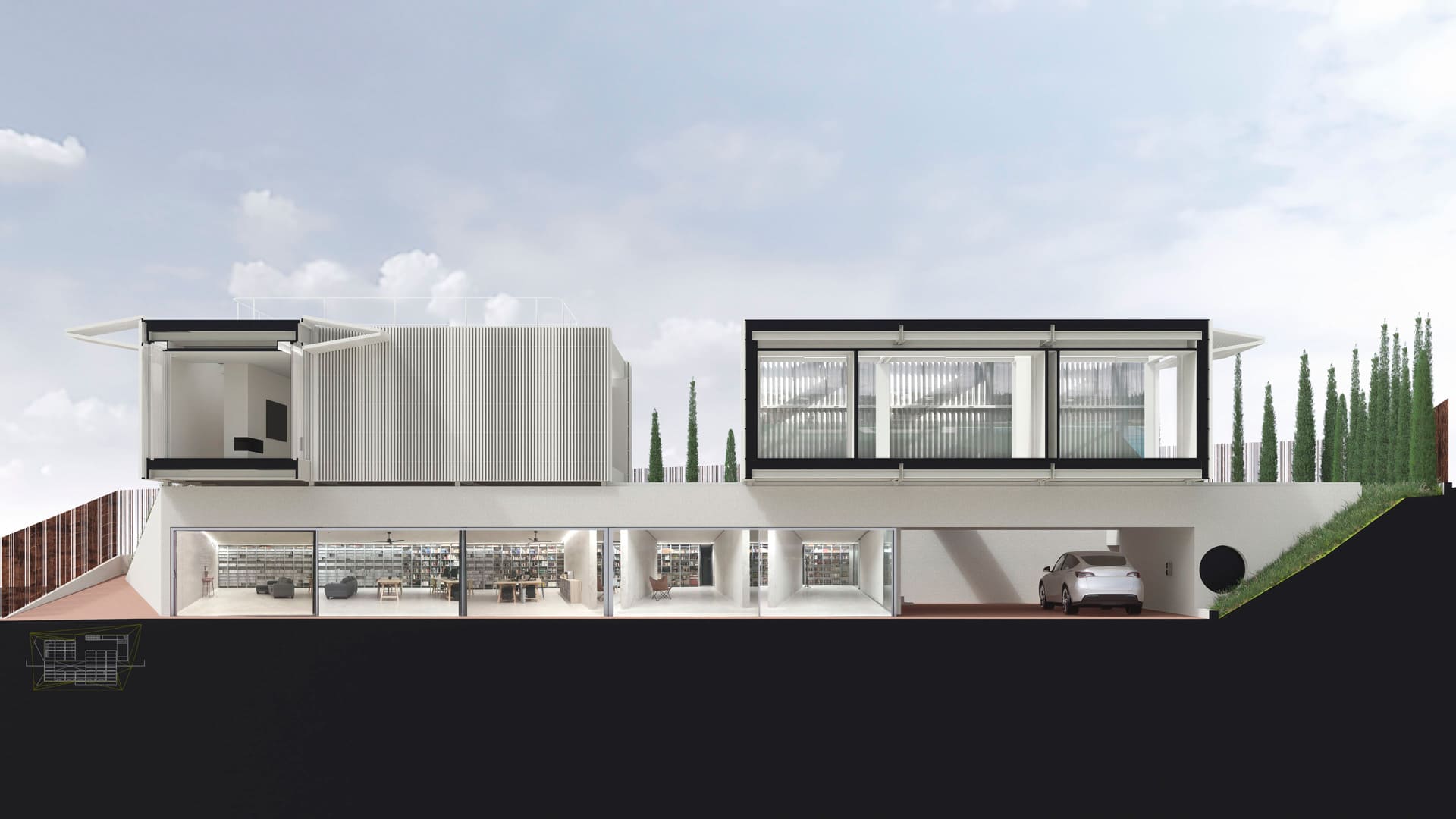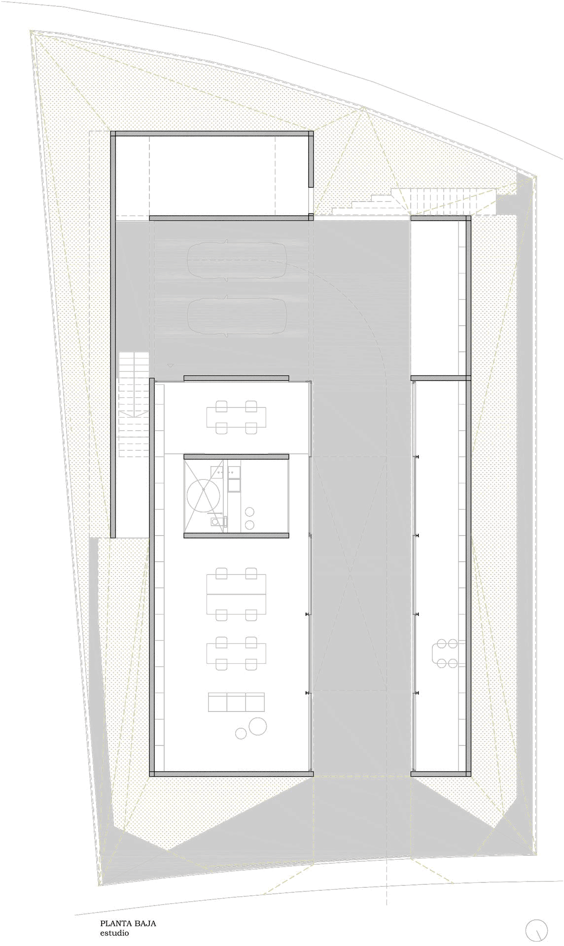 La primera traza concebida en el papel en blanco se materializa como una línea central en la planta baja y semienterrada, actuando como un elemento que organiza el programa en la parte inferior. Esta línea busca prolongar la sensación de «calle» externa e incorporarla al proyecto utilizando el mismo adoquinado. Esta calle sirve como eje para el estudio profesional, una zona expositiva, el trastero, el garaje y las instalaciones. Además, los diversos recorridos se ramifican permitiendo el acceso a la zona superior, es decir, la vivienda, a través de los barrancos generados en el perímetro. El jardín, por lo tanto, se eleva y establece una conexión visual con el estudio a través de una doble altura y un patio central en el nivel inferior.