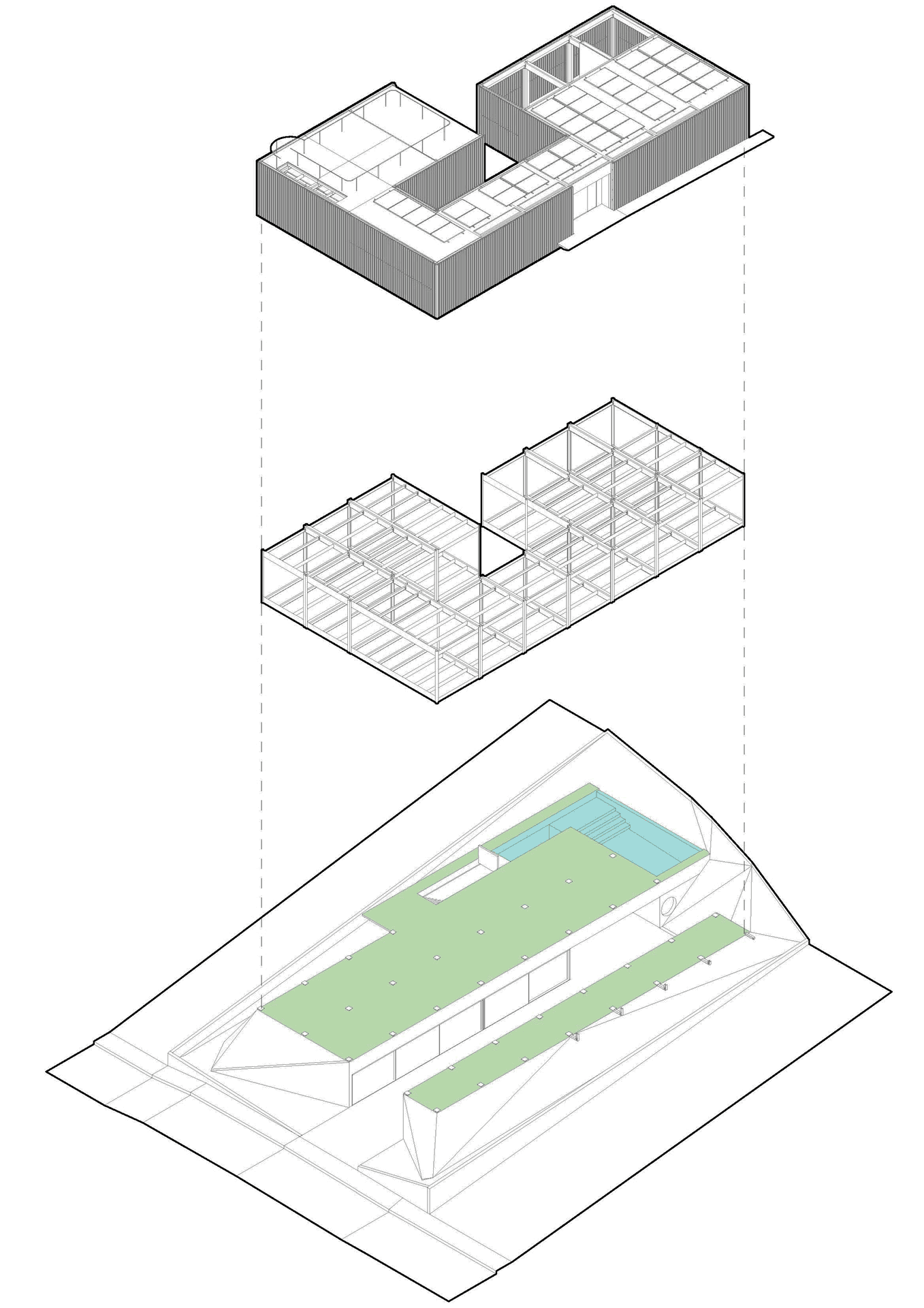 El estudio forma parte del lugar, de su orografía y de ahí a que adquiera una presencia másica como si de una excavación se tratase. Esta parte se cubre con el terreno desalojado durante su excavación lo que permite minimizar su presencia reduciendo la escala del conjunto, pasando de dos alturas a una sola y dejando el valor significativo a la construcción industrializada. En este caso, el SISTEMA LaM se apoya sobre unas articulaciones que emergen de la zona inferior como si de un delicado objeto se tratase.