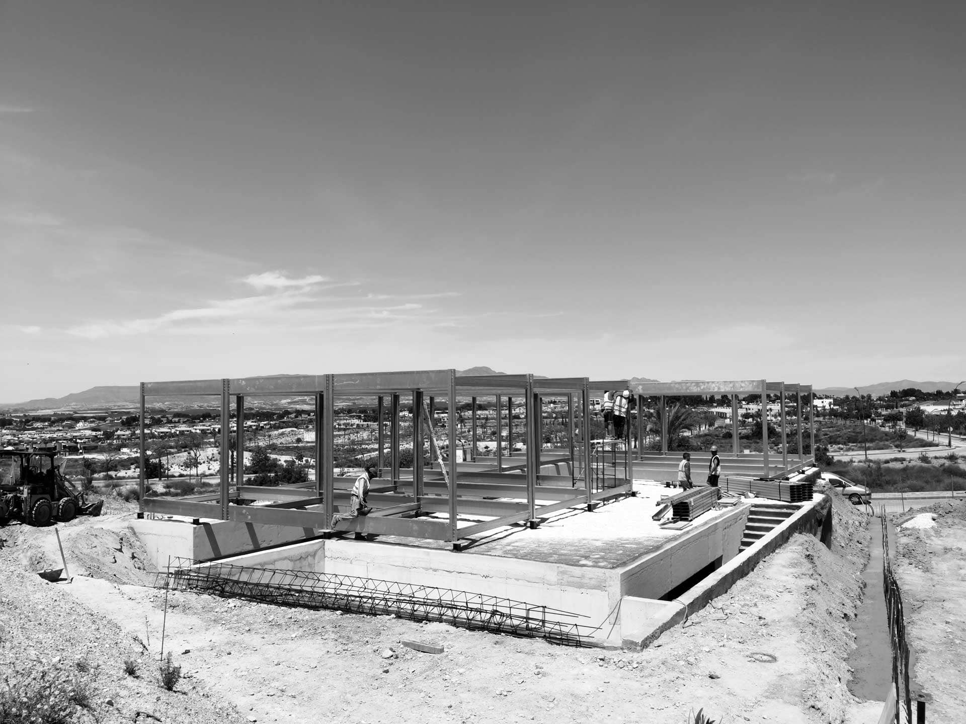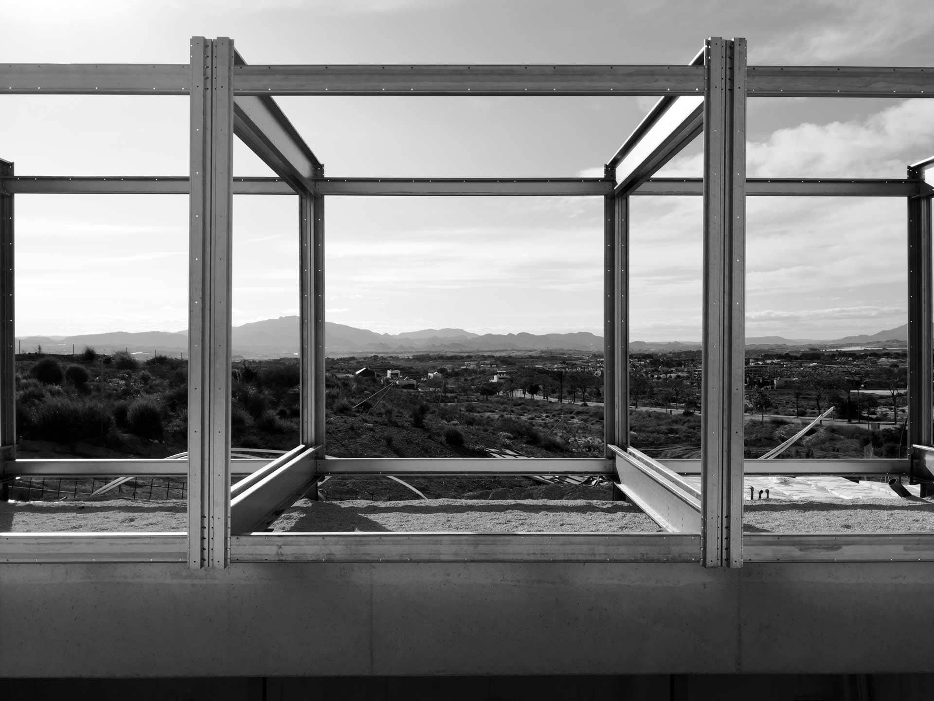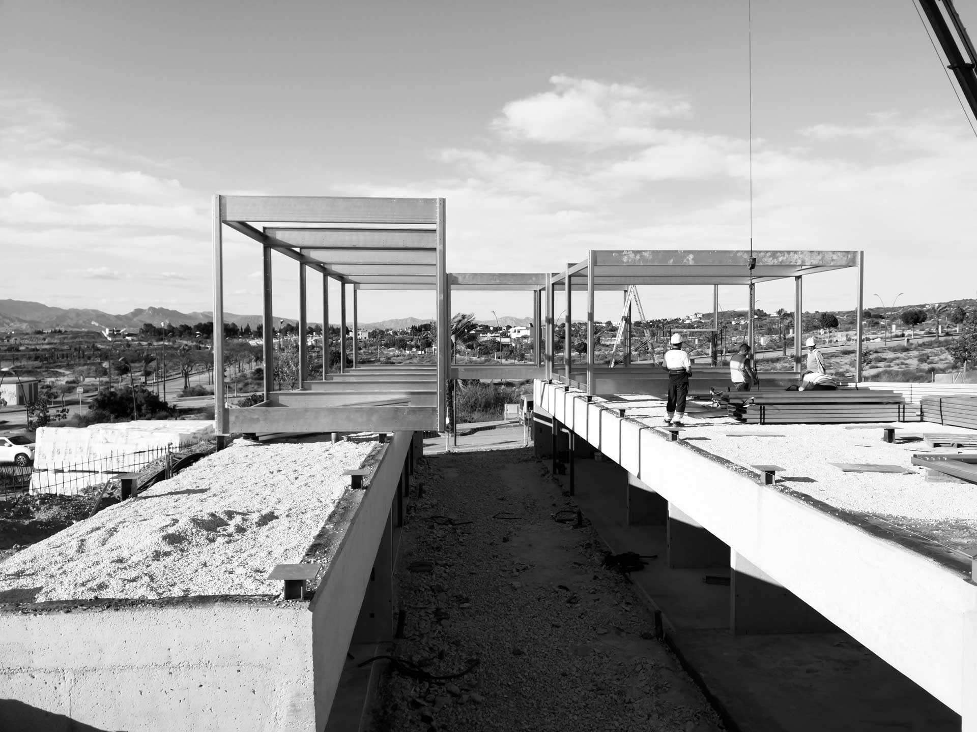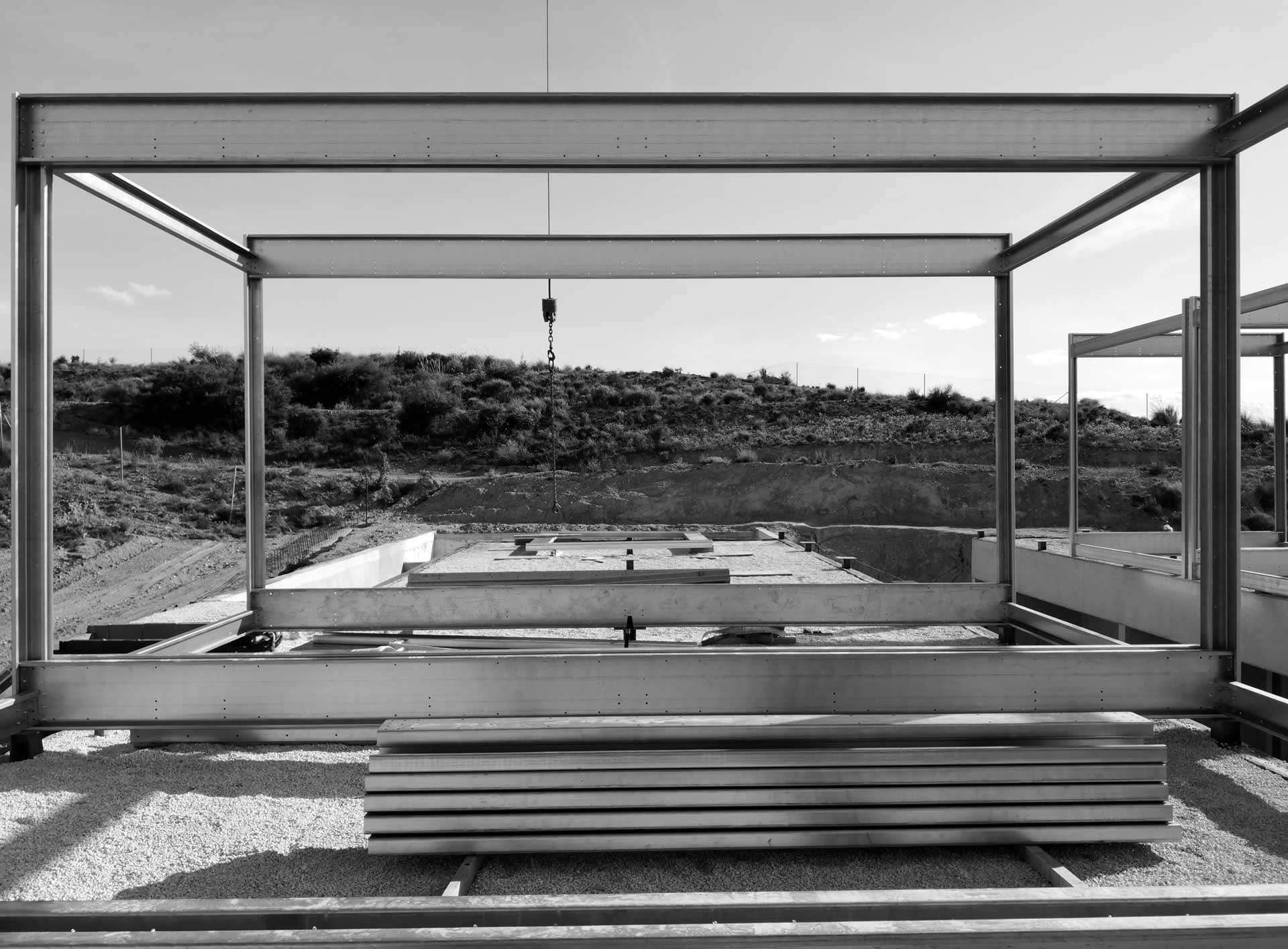 Por lo tanto, se aborda el proyecto a través de dos estructuras claramente diferenciadas. La estructura metálica de la planta primera, con su desarrollo mediante ENSAMBLADO, frente al hormigón de la planta baja, con su desarrollo mediante ENCOFRADO, ayuda al sistema a su adaptación al medio, a la orografía y circunstancias del lugar transformando su producción genérica en un producto específico. A su vez confiere al resultado de la necesaria rigidez y unidad, permitiendo de forma sencilla situaciones complejas para la industrialización y la construcción modular transportable. Su capa superficial mediante la proyección de árido de sílice eliminando así el aspecto industrializado que le confieren los encofrados y dotándolo de un aspecto imperfecto enfatiza así su contraste con el sistema industrializado. Además, con su carácter plástico y formal, contrasta notablemente con el aspecto genérico e ilimitado de SISTEMA LaM. De esta forma, el proyecto adquiere una cierta dualidad relacionando en un mismo espacio dos diferentes sistemas de fabricación: ENCOFRADO y ENSAMBLADO.
