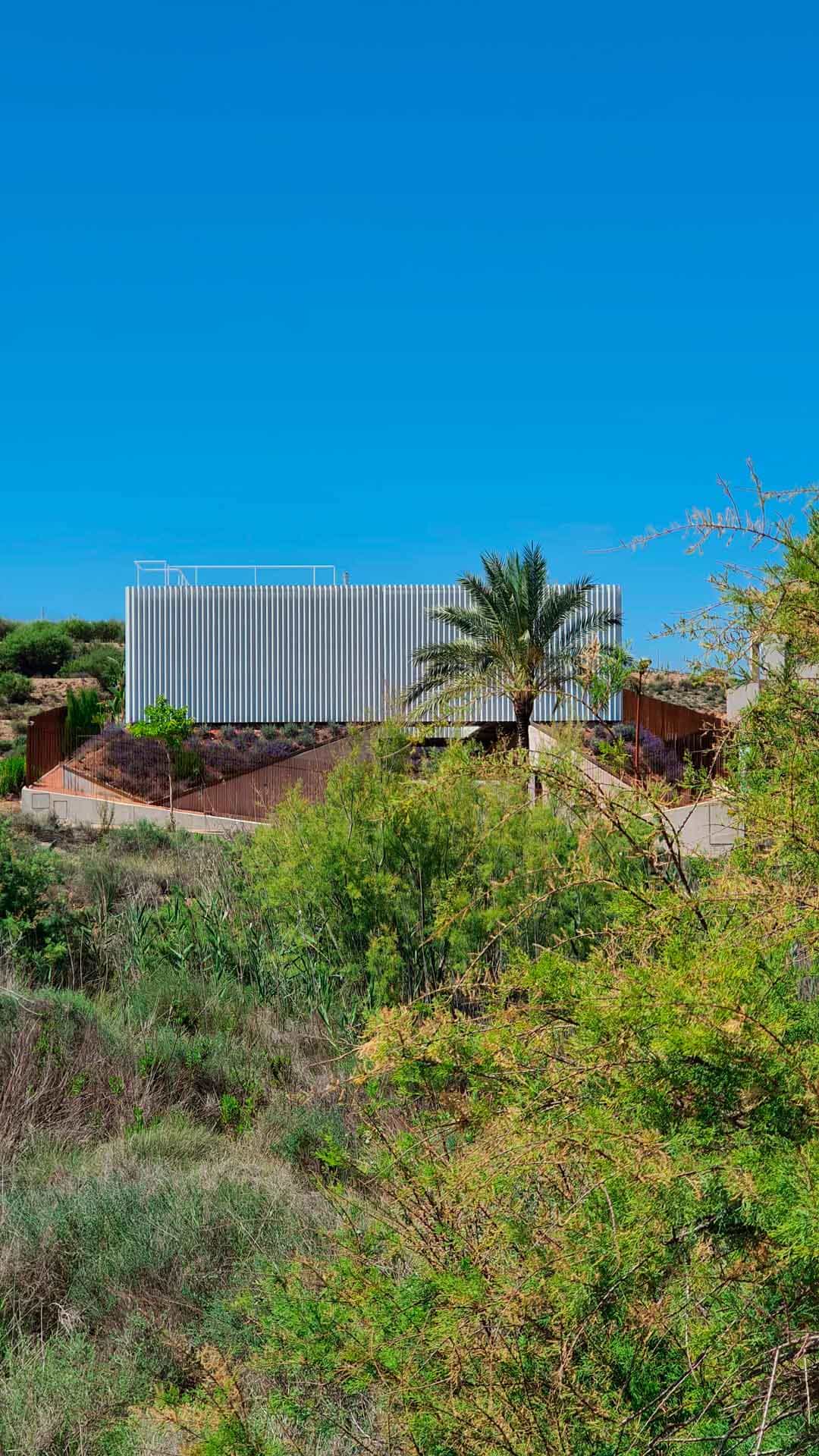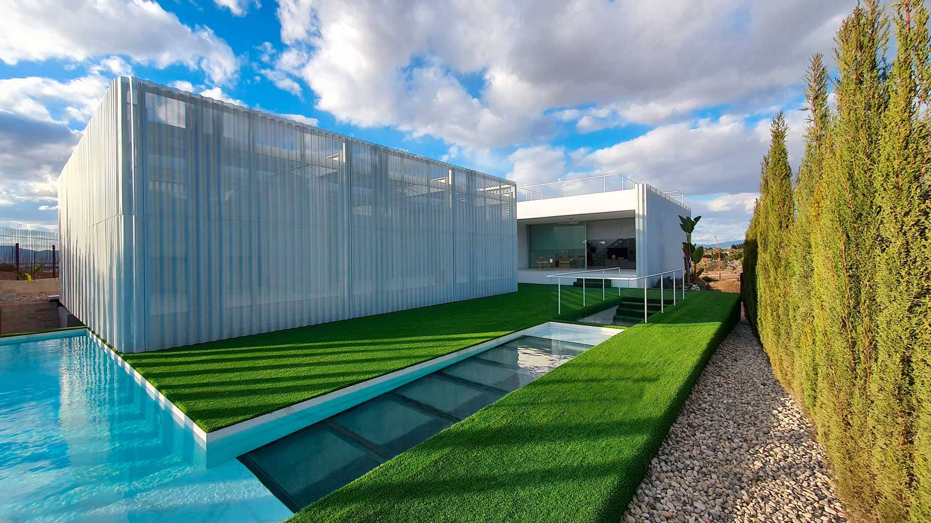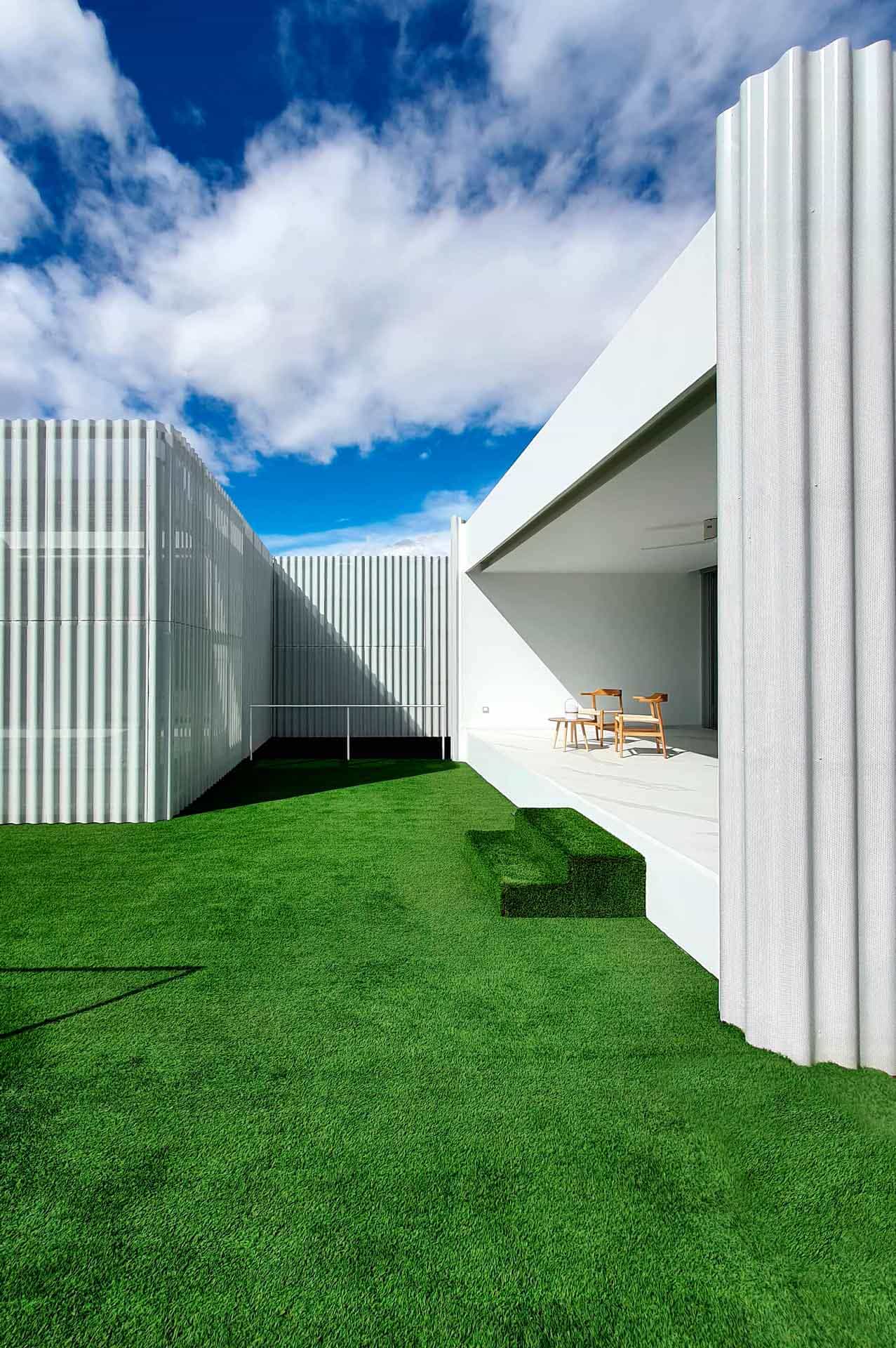 La casa adopta la forma de un elemento hermético mediante la implementación de una fachada ventilada y una piel que cubre todo su perímetro. Se elige una chapa ondulada de gran onda lacada en blanco, la cual, en los huecos, puede permanecer abierta o cerrarse según el control solar y la necesidad de privacidad del habitante. Esta piel en los cerramientos contribuye a que la casa funcione de manera eficiente climáticamente, y en las ventanas se transforme en puertas basculantes; actúa como una cortina externa que, al abrirse, se conecta directamente con el paisaje, pero al cerrarse, mantiene siempre la visibilidad del habitante hacia el exterior, pero no la del observador hacia la fachada.