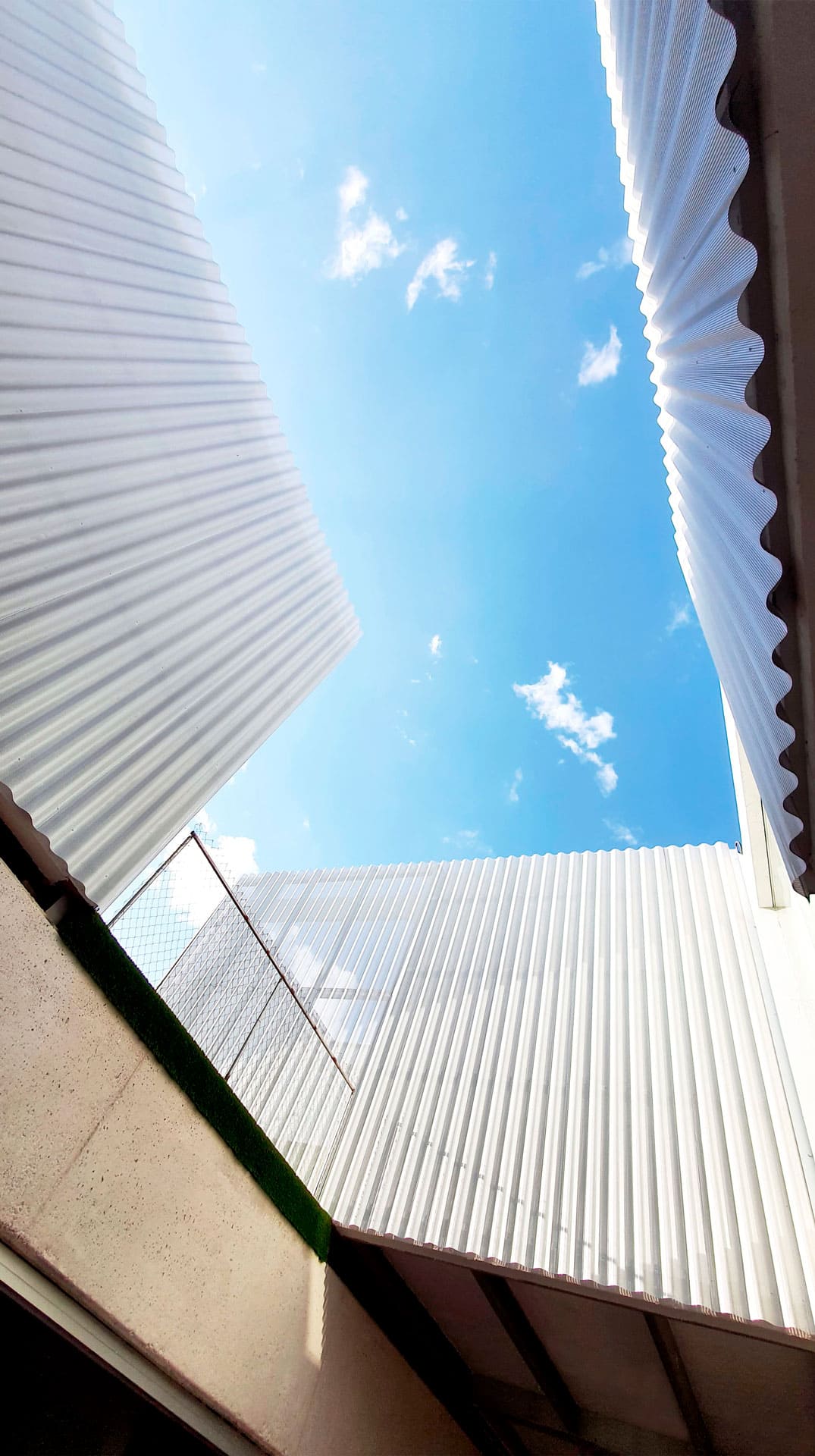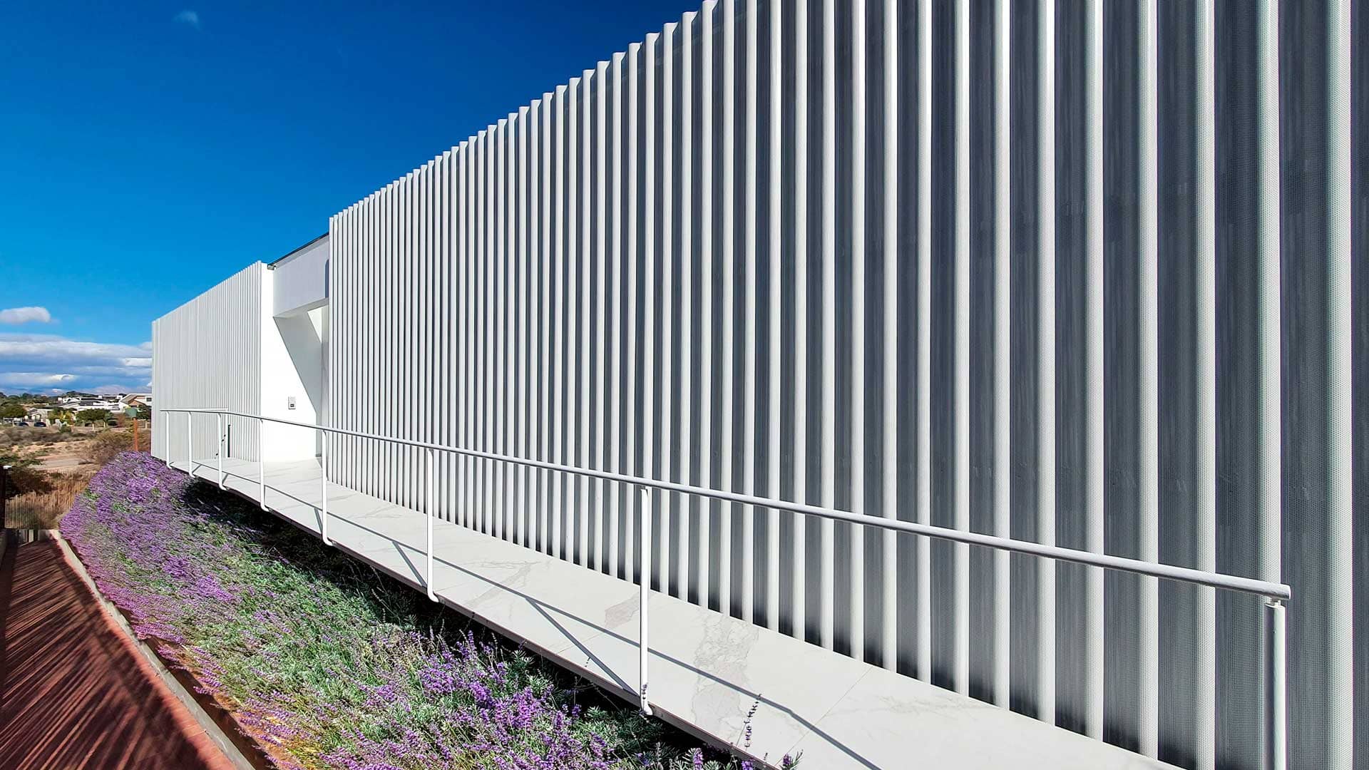 La utilización de esta chapa metálica en la fachada posibilita la visualización de múltiples perspectivas a medida que se mueve con el sol, creando un efecto de luces y sombras. Esta dinámica fachada, en constante cambio gracias también a las basculantes, contrasta con la apariencia estática, generando un constante movimiento visual.