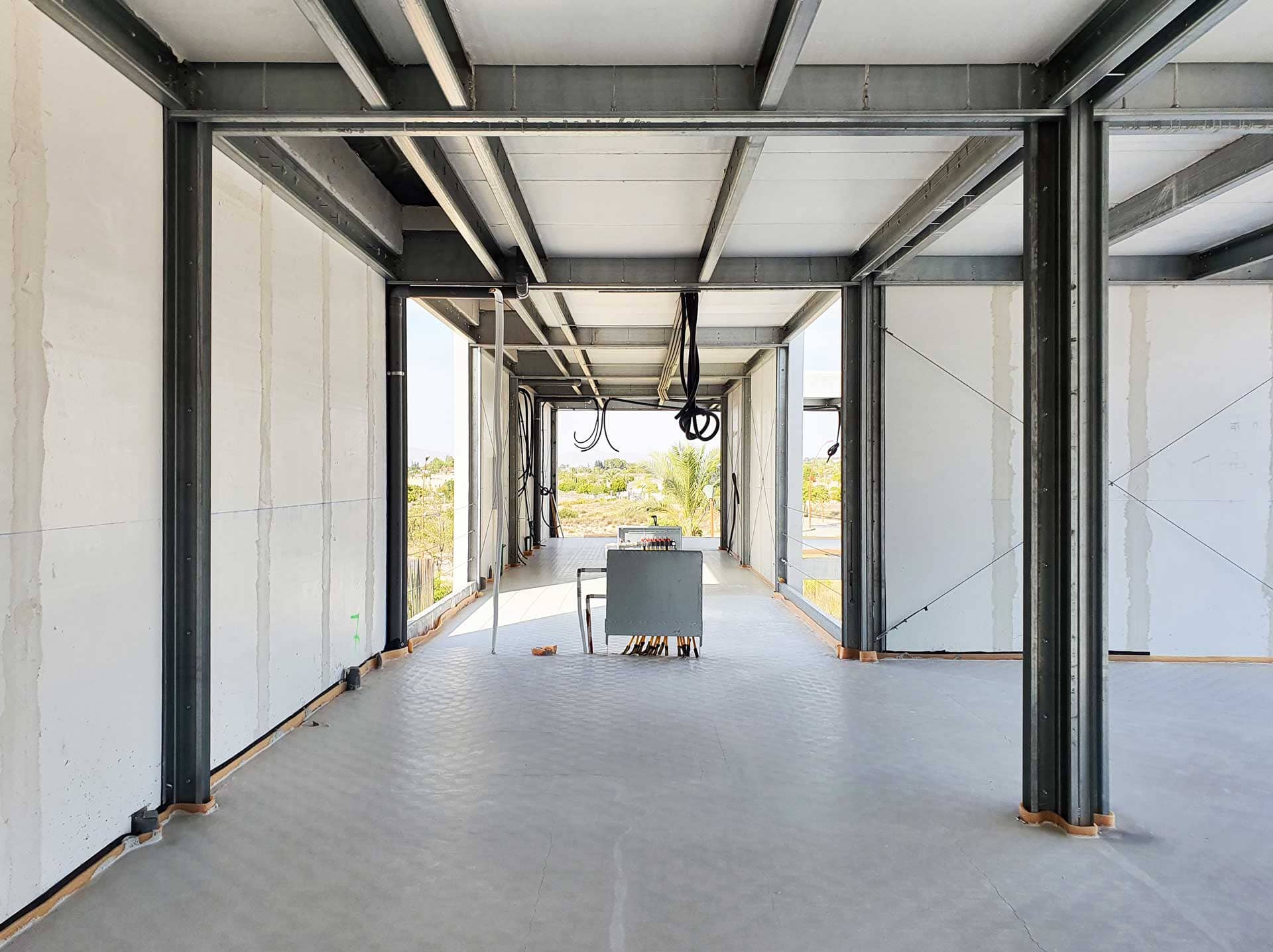 La componente industrial se destaca por posibilitar una significativa fabricación en las instalaciones, permitiendo trabajos de ensamblaje y resolución de encuentros en la obra. La presencia de tecnología se evidencia en una estructura metálica y envolvente altamente eficiente en términos energéticos. El proceso de montaje, realizado en acero galvanizado conformado en frío, troquelado y atornillado, se caracteriza por su rapidez y precisión, logrando resultados métricos de gran exactitud. La parte estructural, tanto en planos horizontales (suelo y techo) como en planos verticales (cerramiento), se reviste con un sistema de aislamiento térmico en el exterior, compuesto por paneles industrializados de EPS (poliestireno expandido), proporcionando una envolvente con altas prestaciones térmicas y un espesor significativo. La autosuficiencia se logra al convertirse en un proyecto de generación eléctrica propia, capaz de desconectarse de la red eléctrica, ofreciendo así mayor independencia energética y sostenibilidad.