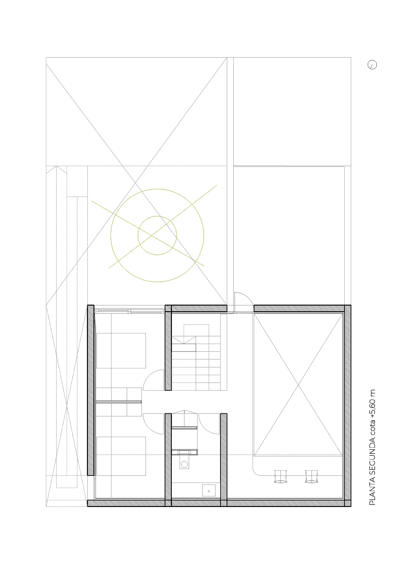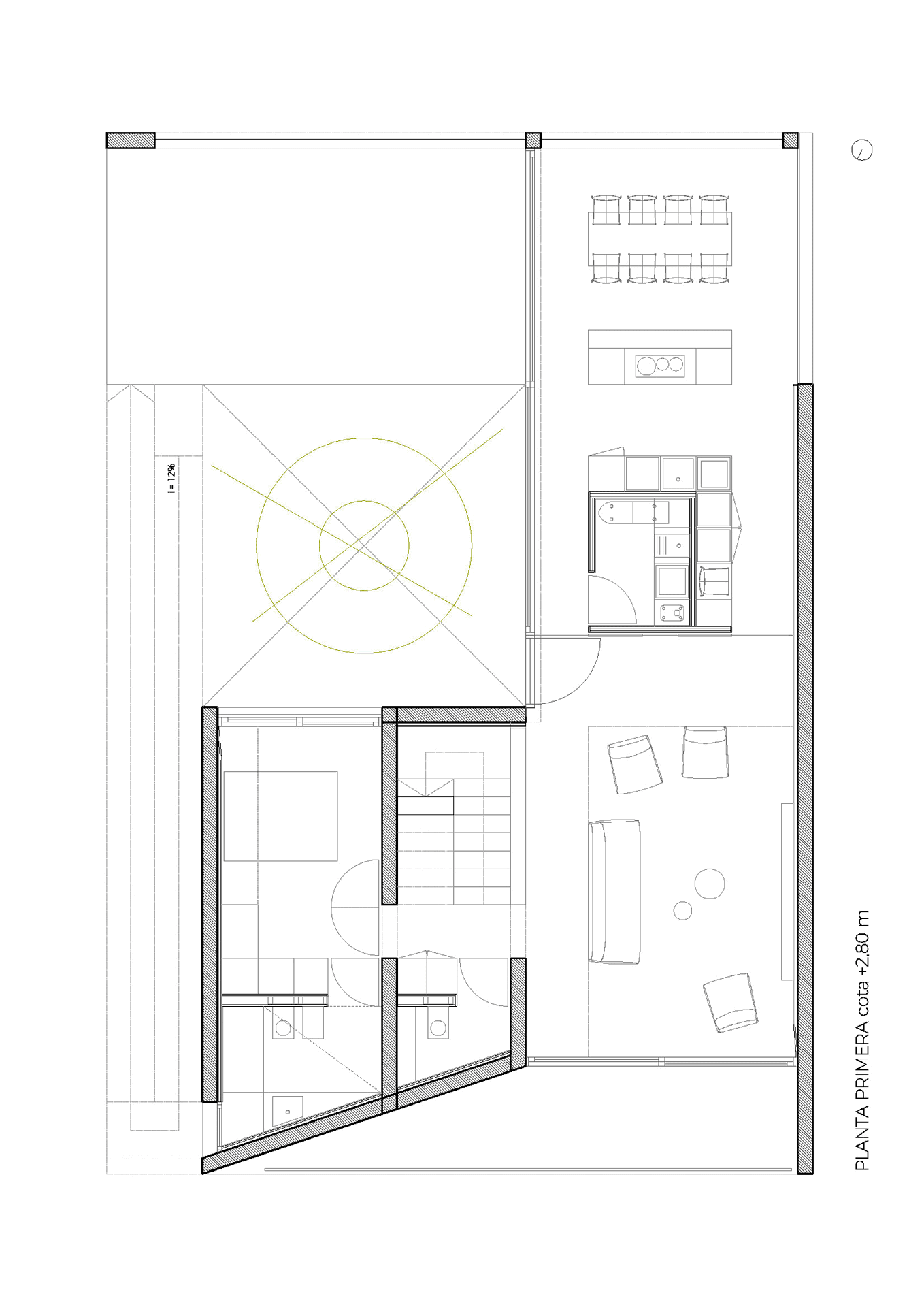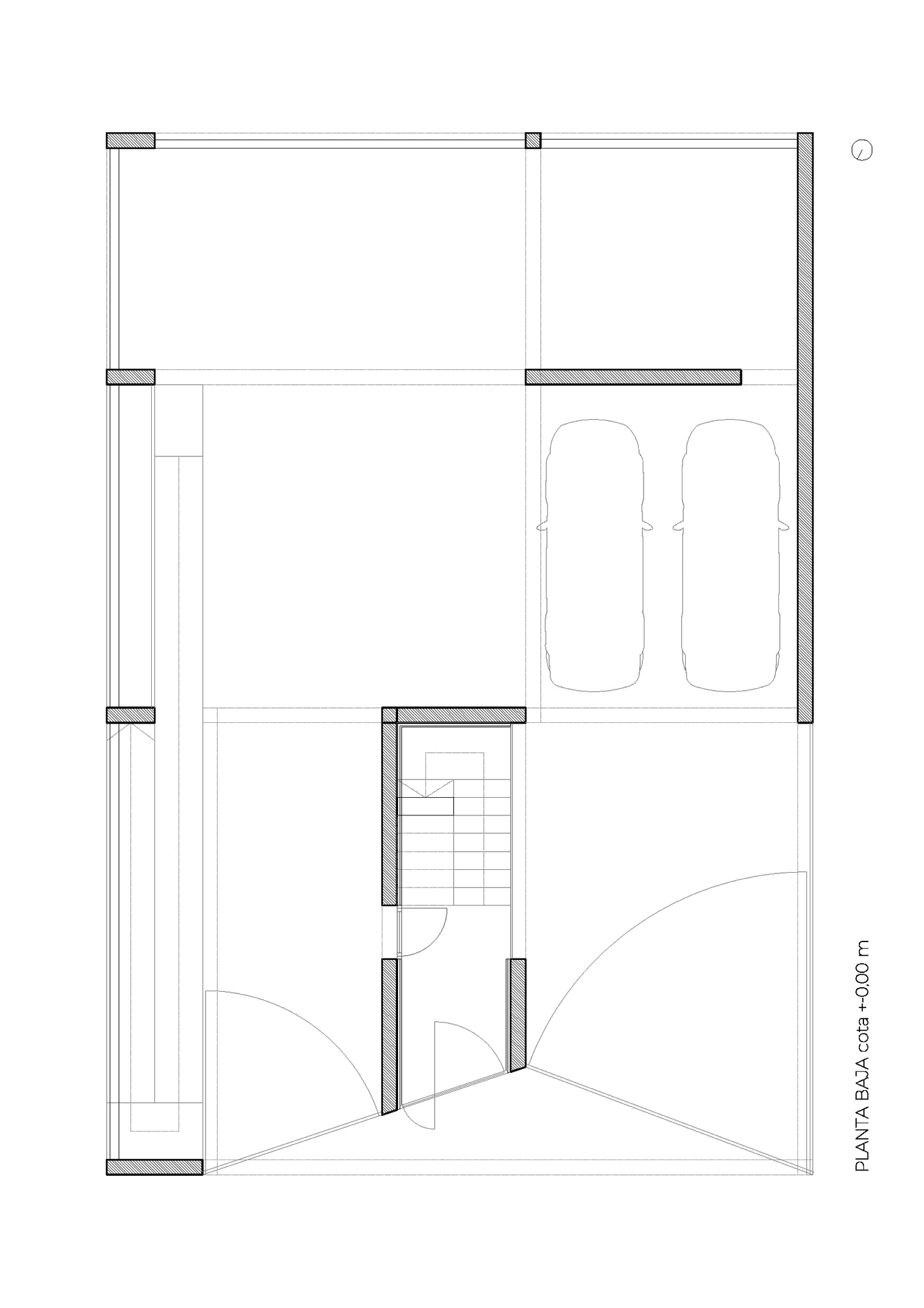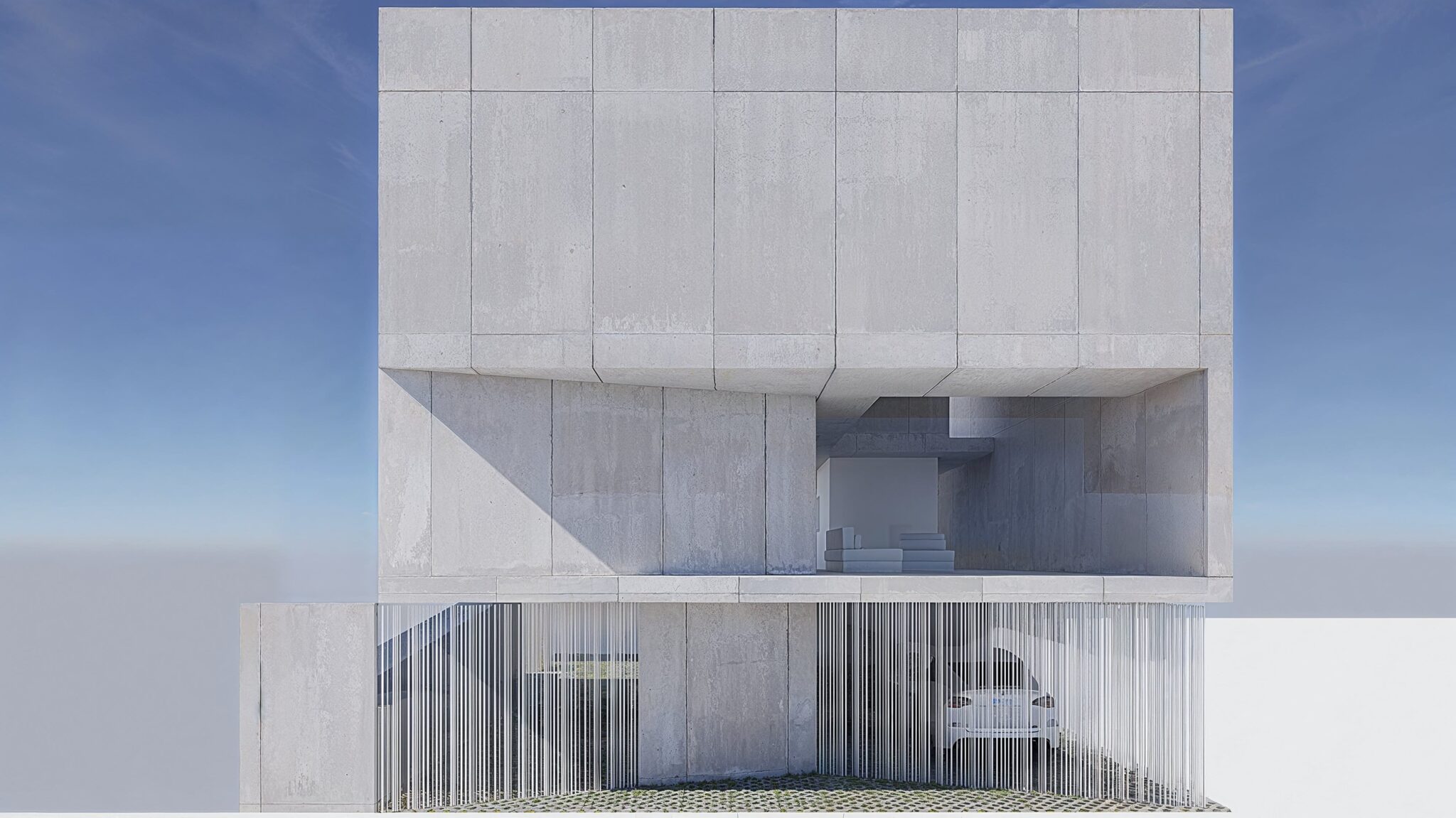 Por un lado, la planta baja se libera como atrio de acceso, garaje y sala multiusos. Por otro lado, la planta primera se destina a la zona de día, mientras que la planta segunda alberga la zona de noche. Estas tres áreas están interconectadas por un núcleo vertical que incluye escalera y ascensor, y la envolvente de todo el proyecto se materializa mediante una estructura única: muros de hormigón visto.