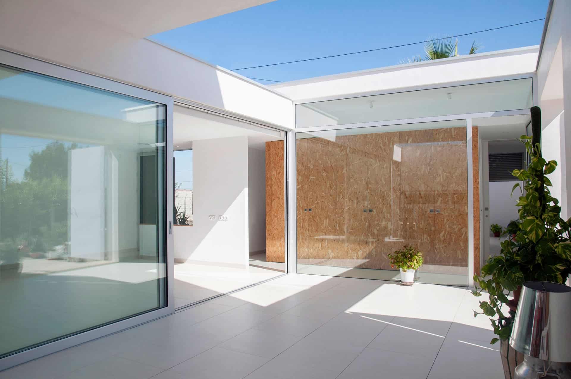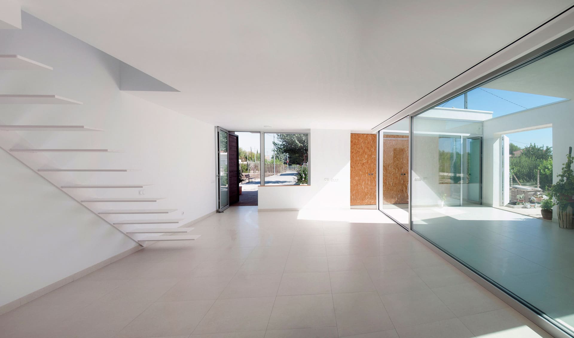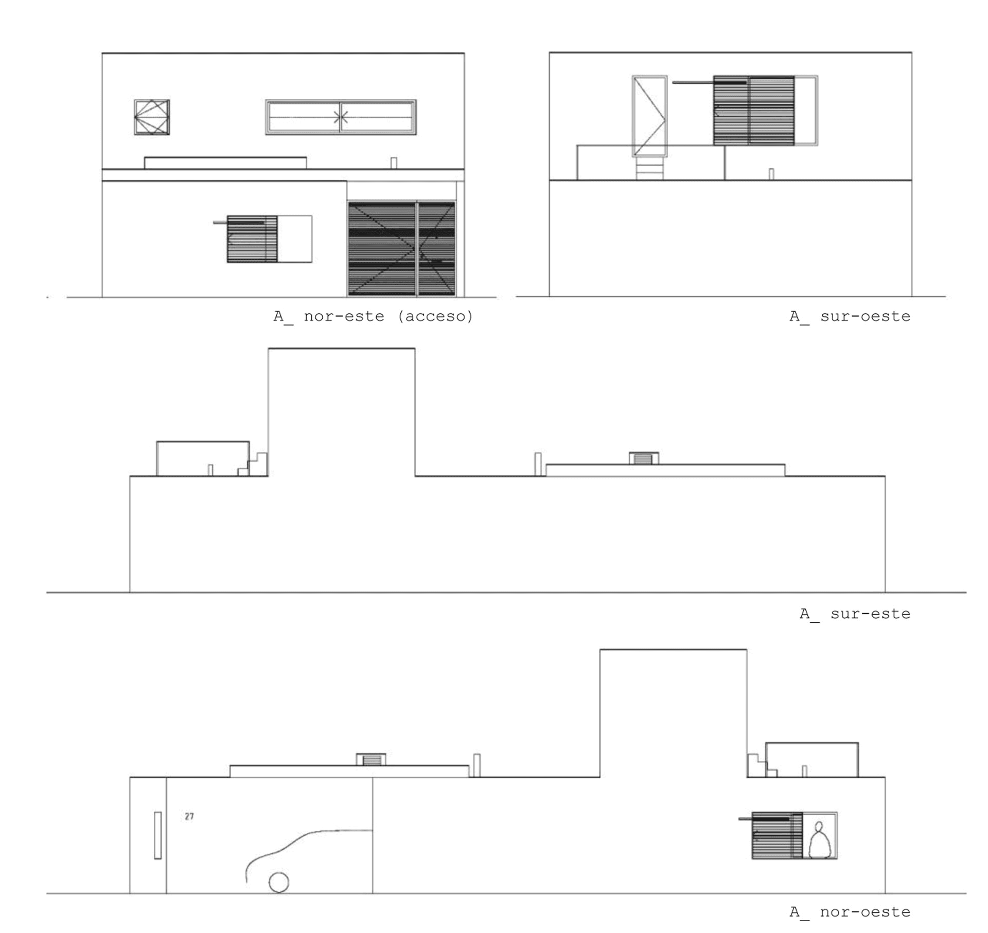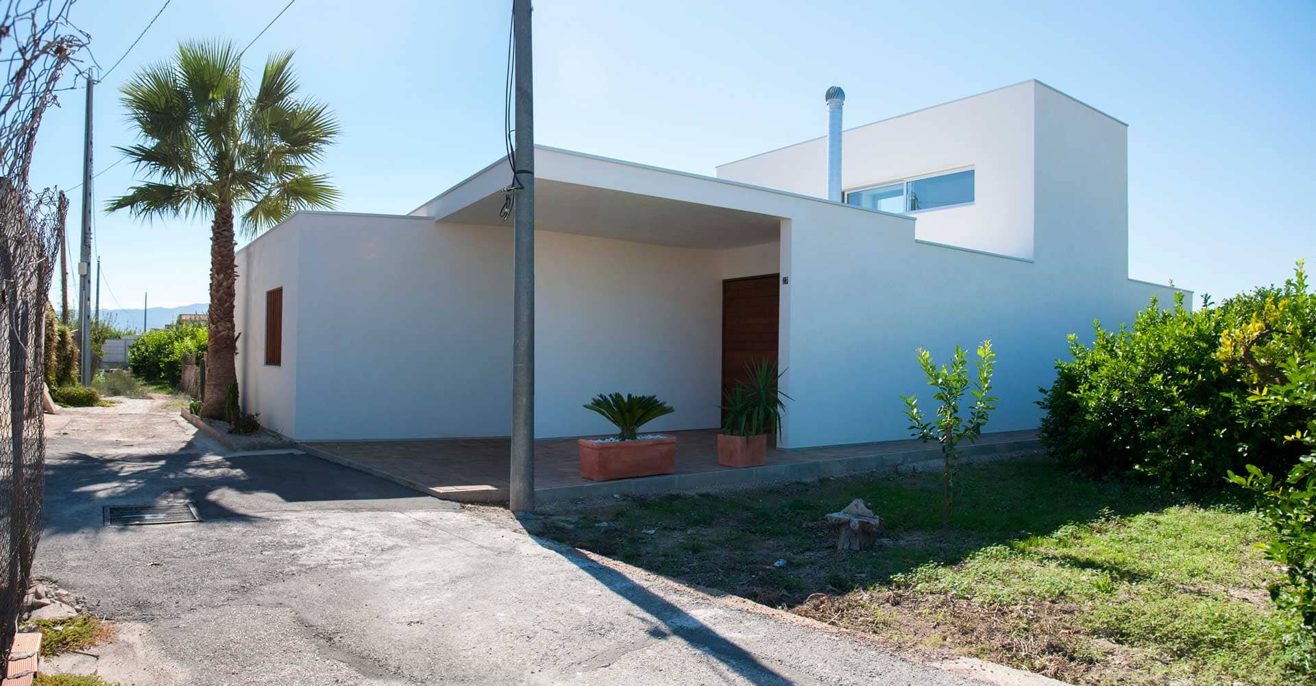 Dada esta forma de afrontar el trabajo, se obtuvo un resultado hermético e introvertido, lo que nos daba respuesta a una condición de seguridad necesaria en el entorno donde se ubica, y también nos ayudaba a entender cómo una parcela de dimensiones reducidas podía relacionarse con un entorno paisajístico huertano muy rico; esto se hace a través de la contemplación que se da en el volumen superior como si de un mirador se tratase.