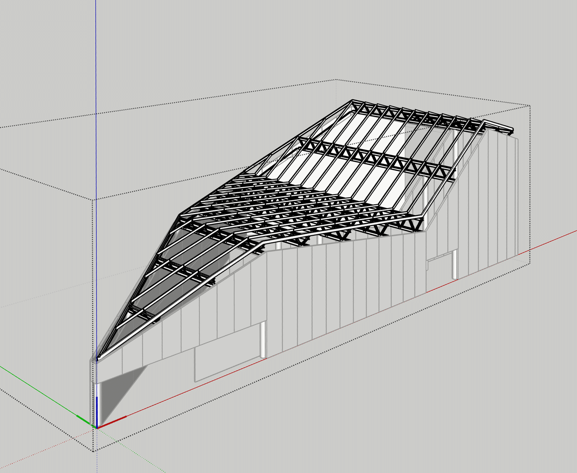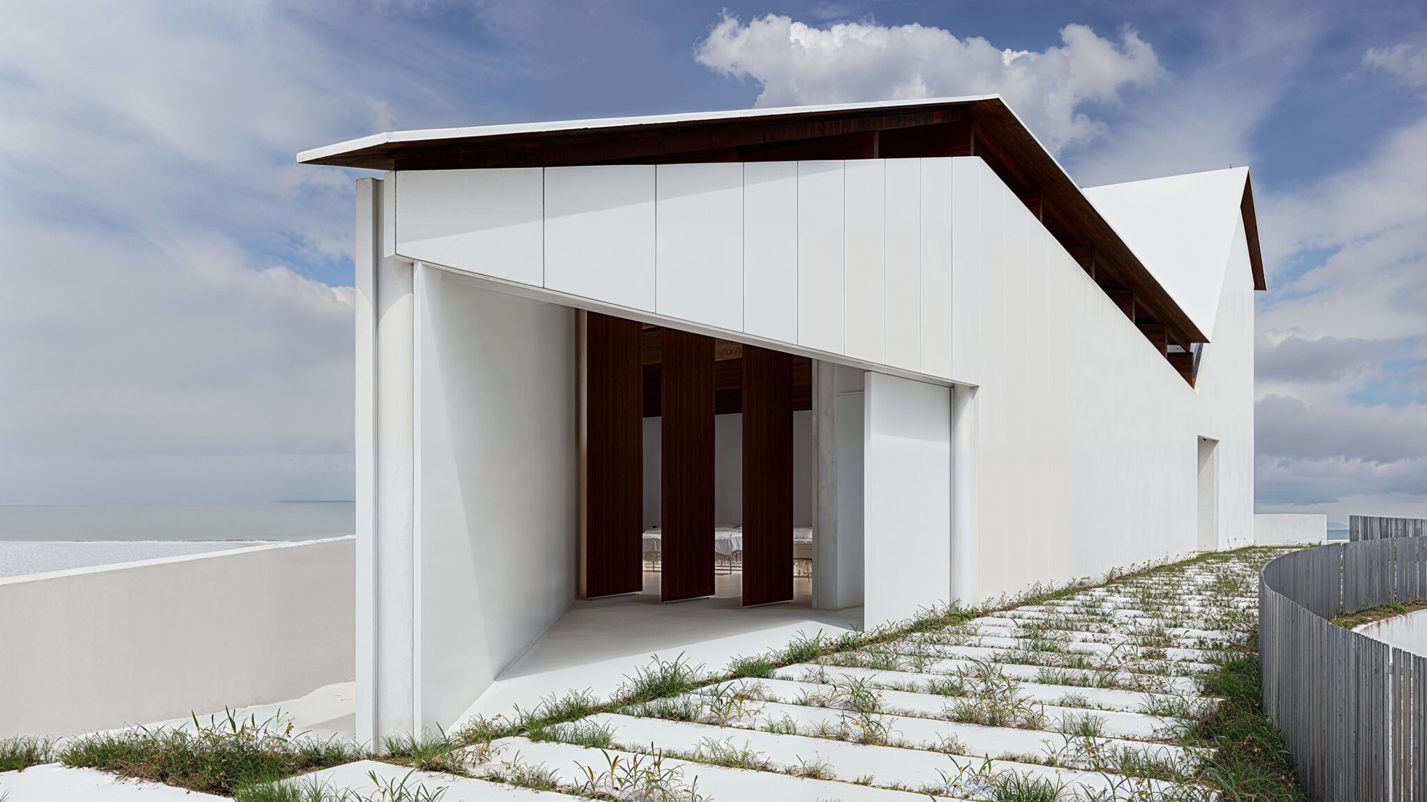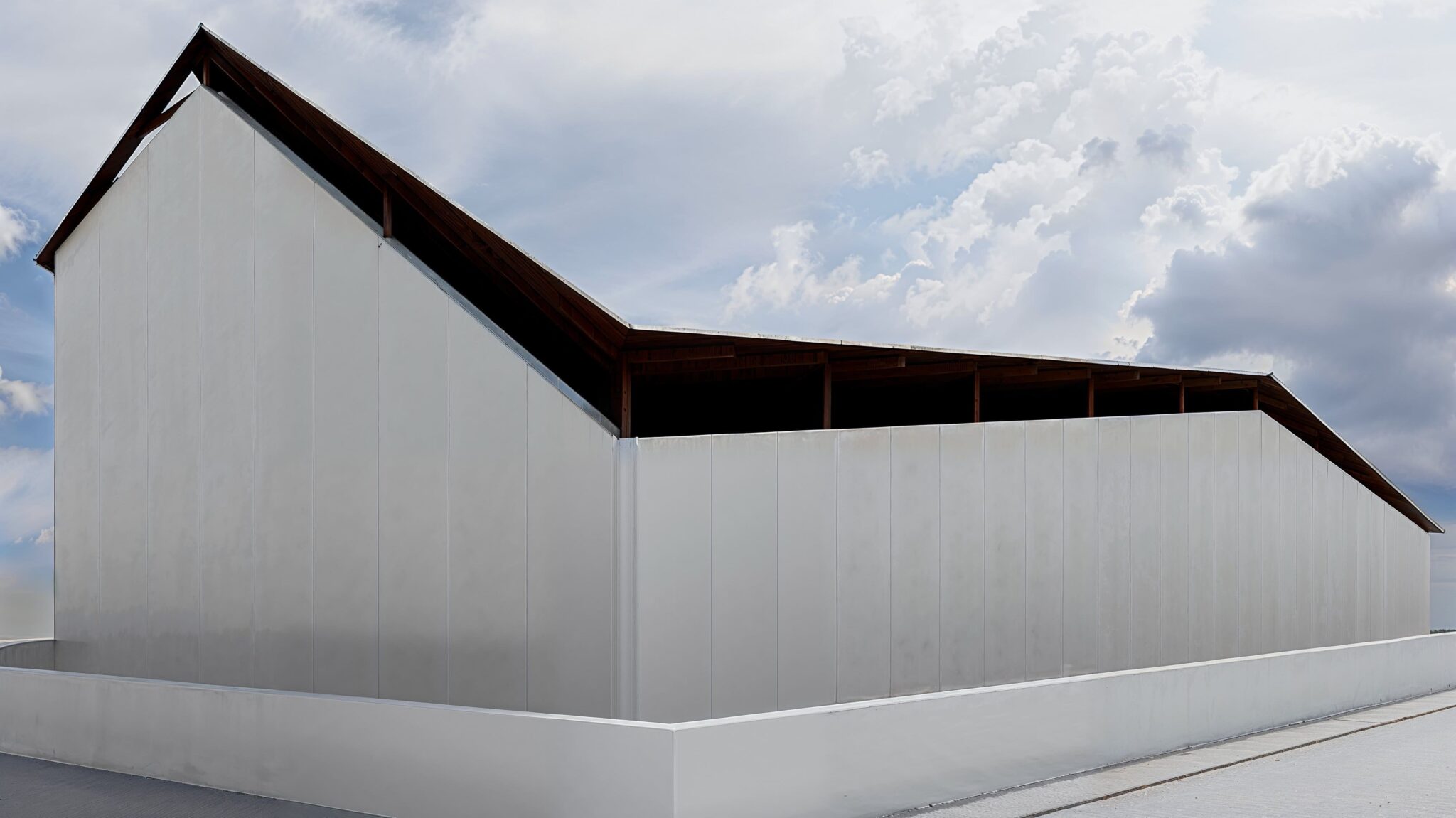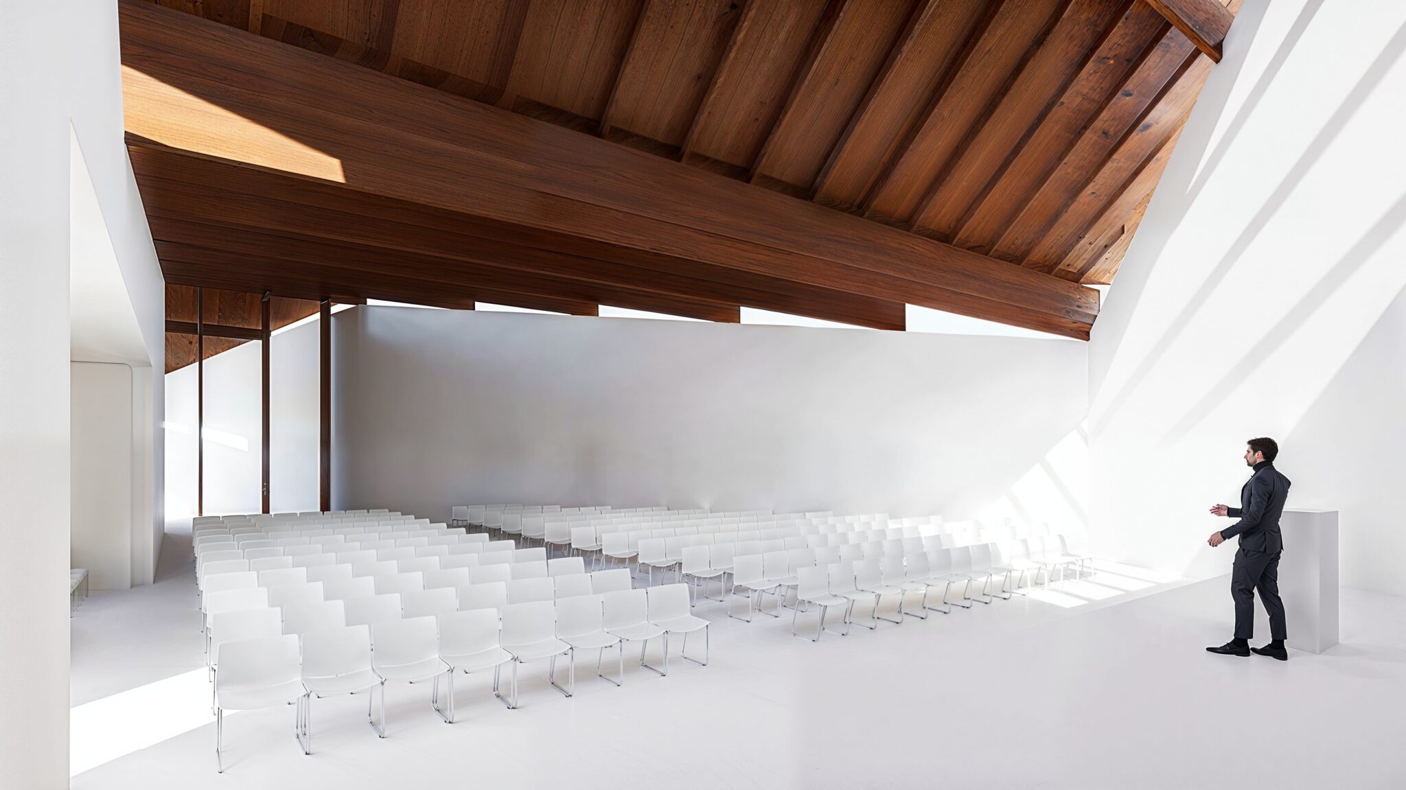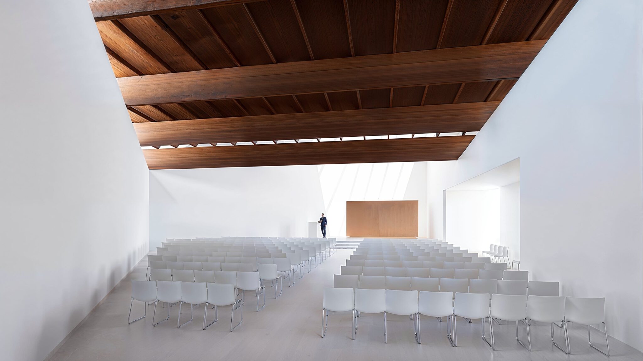 El trazado triangular adapta cada punto del mismo a la altura que lo satisface generando de forma involuntaria una gran cubierta de madera plegada. Su altura se reduce en el acceso acomodándose a la altura del visitante y se eleva en el presbiterio hasta perder su escala en el interior. Este plano, soportado por vigas de gran dimensión y ajustando su canto a la distancia que salvan, no sólo hace que casi sea irreal en algunos puntos por su escaso espesor sino que se desliga del cerramiento de hormigón y genera la entrada de luz a la gran sala y a los espacios intermedios de servicios.