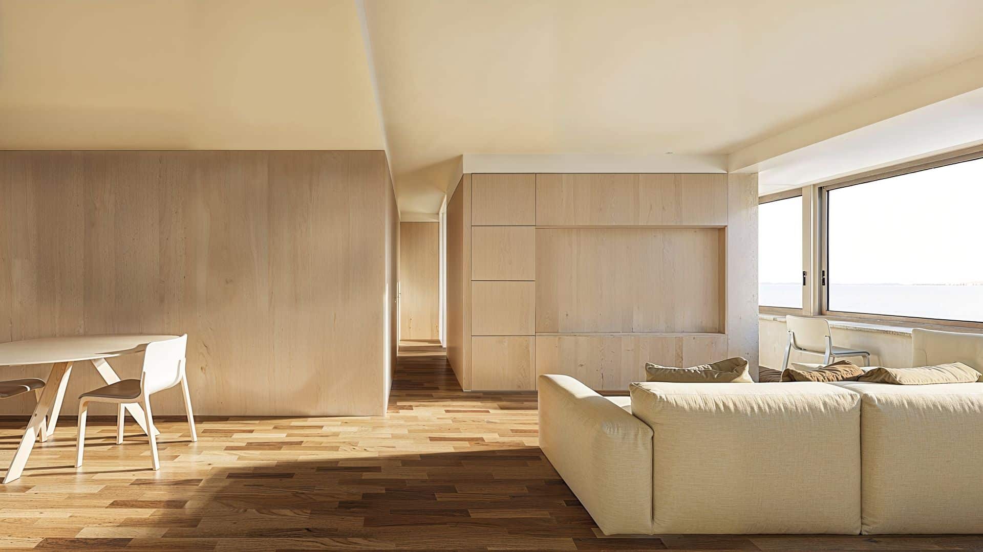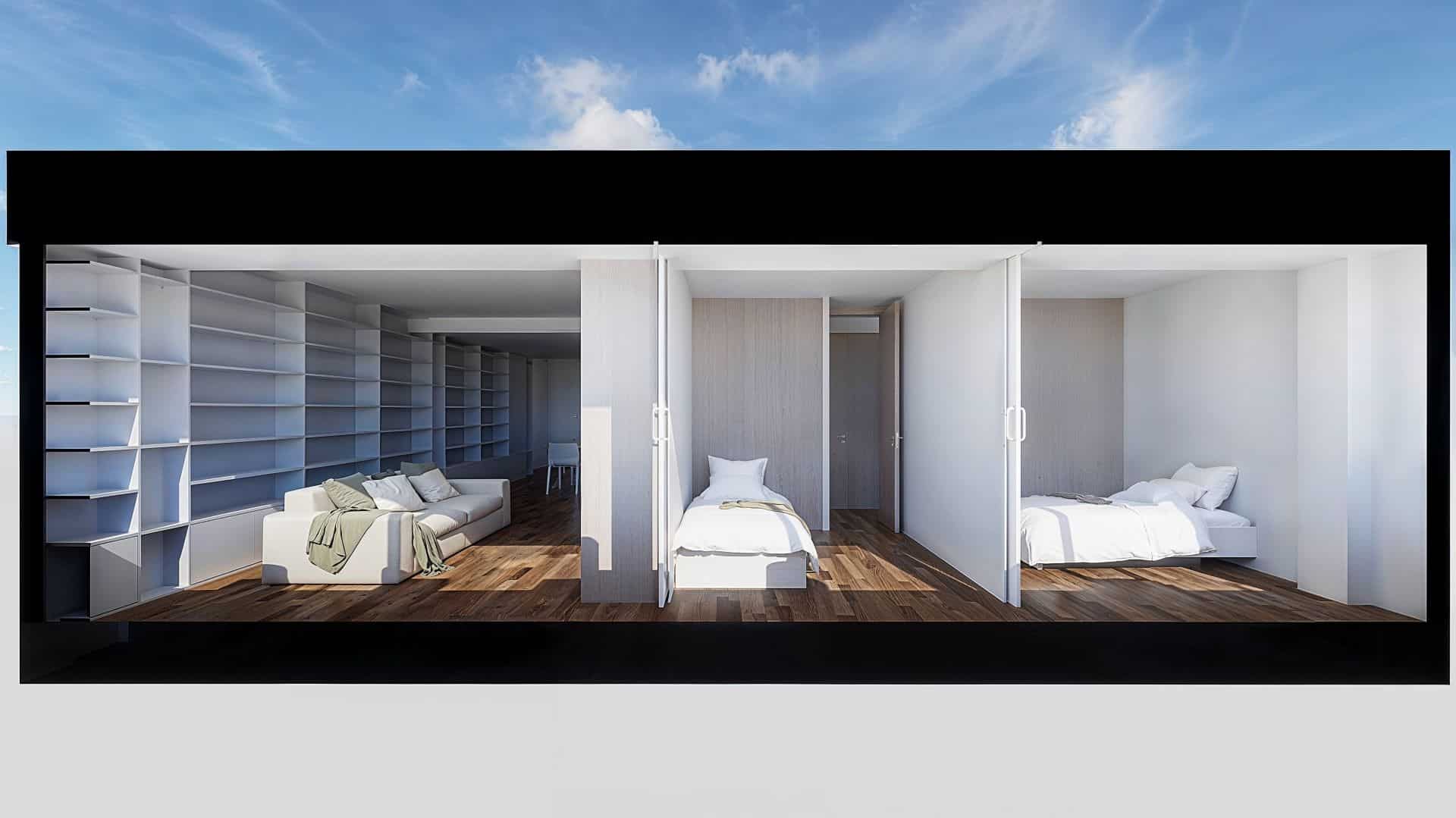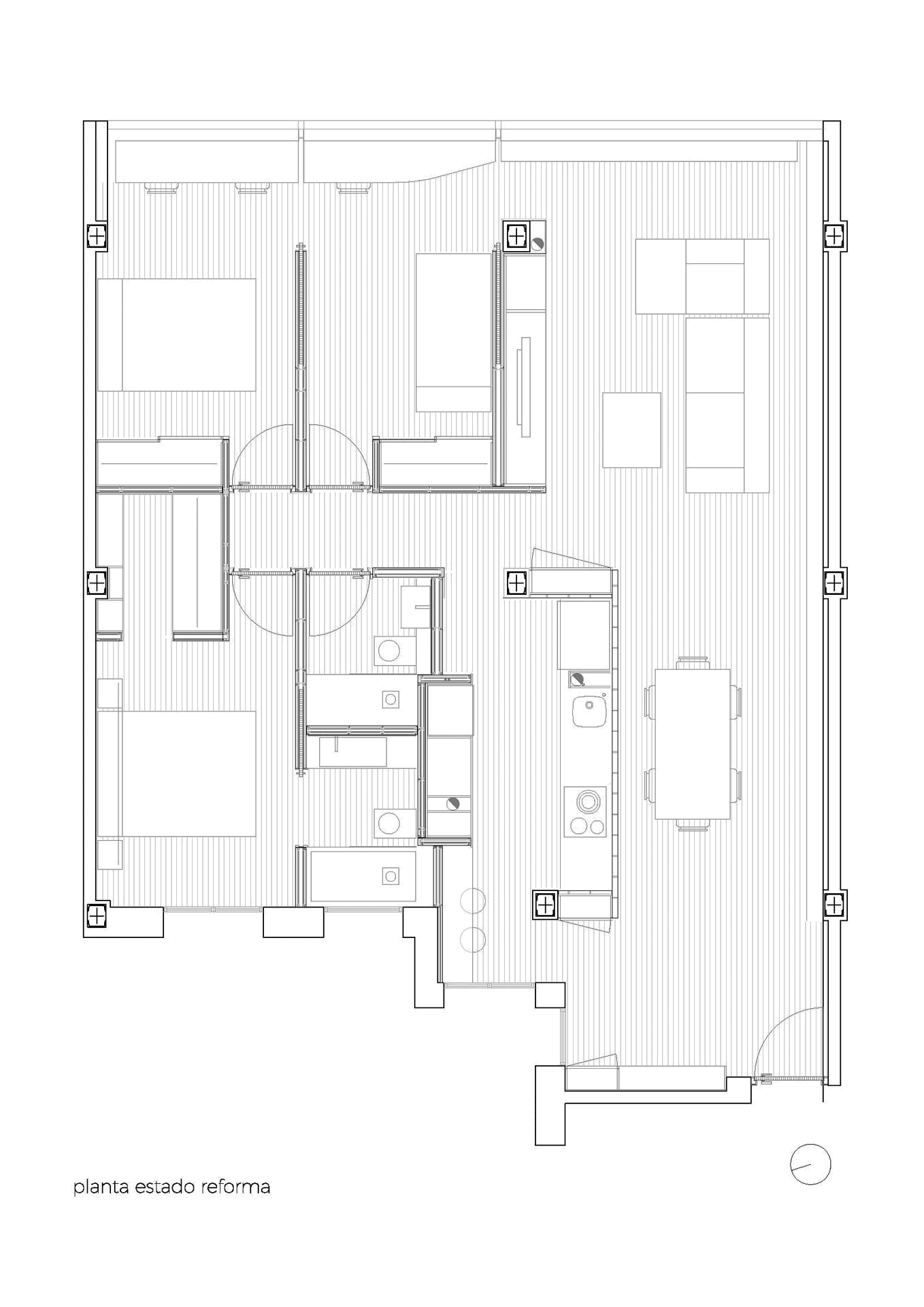 El proyecto también intenta colonizar la fachada del edificio, dejando atrás el hueco estándar y disponiendo una gran ventana en todo el ancho de la casa, recordando y recuperando así el concepto de la terraza inicial. De este modo, se permite generar una relación interior-exterior más evidente y dotar de más amplitud visual a las estancias.