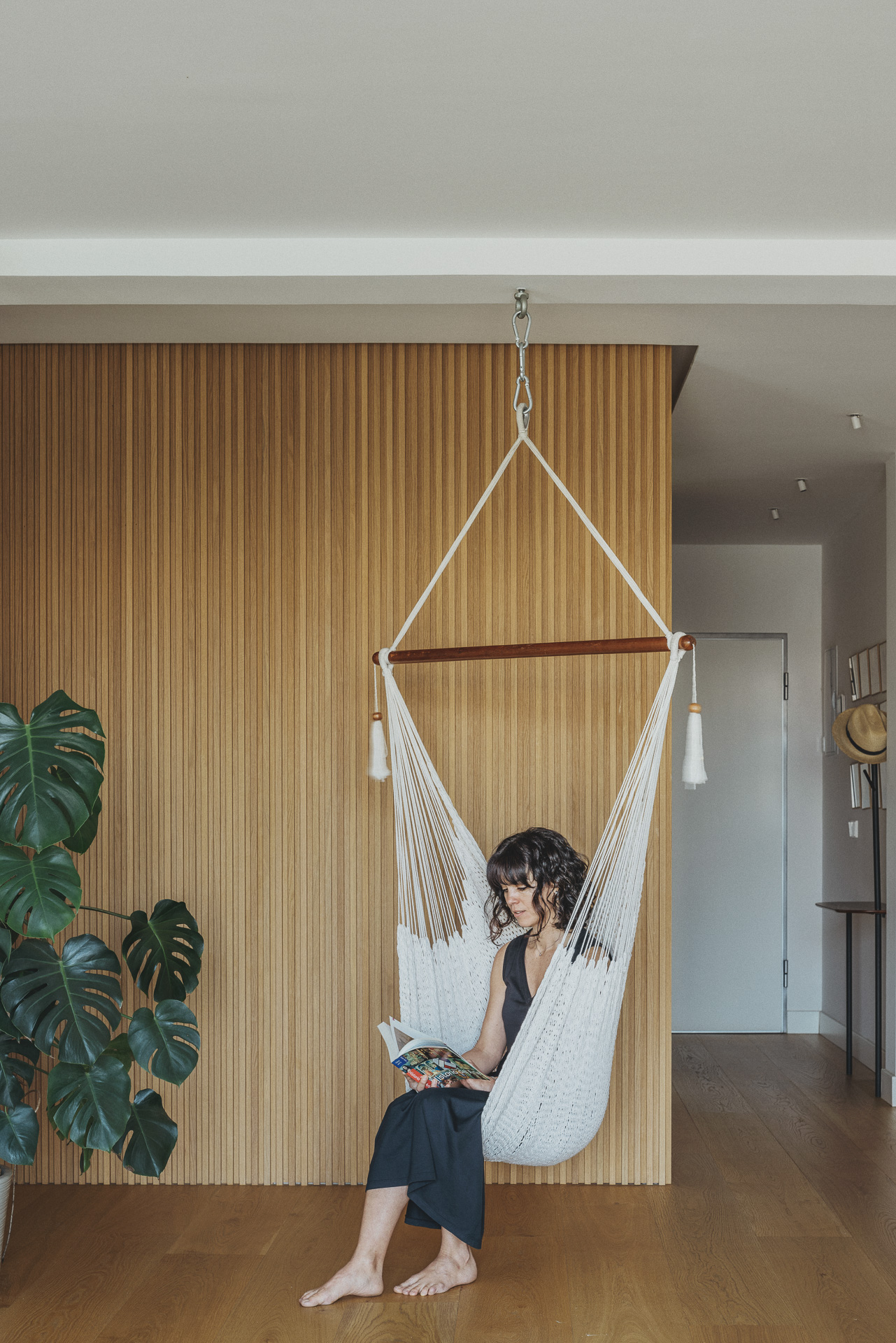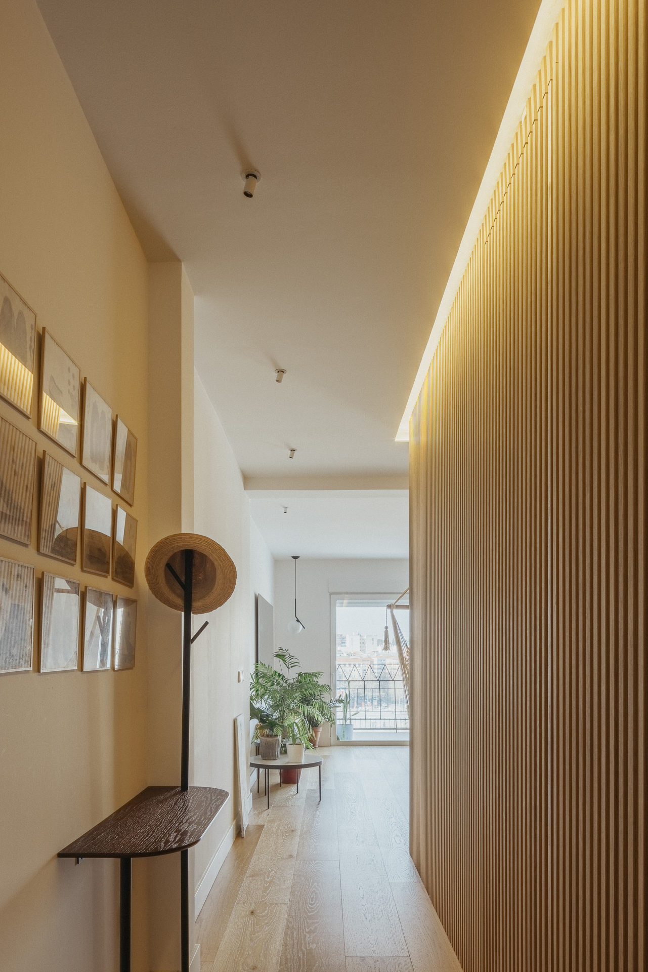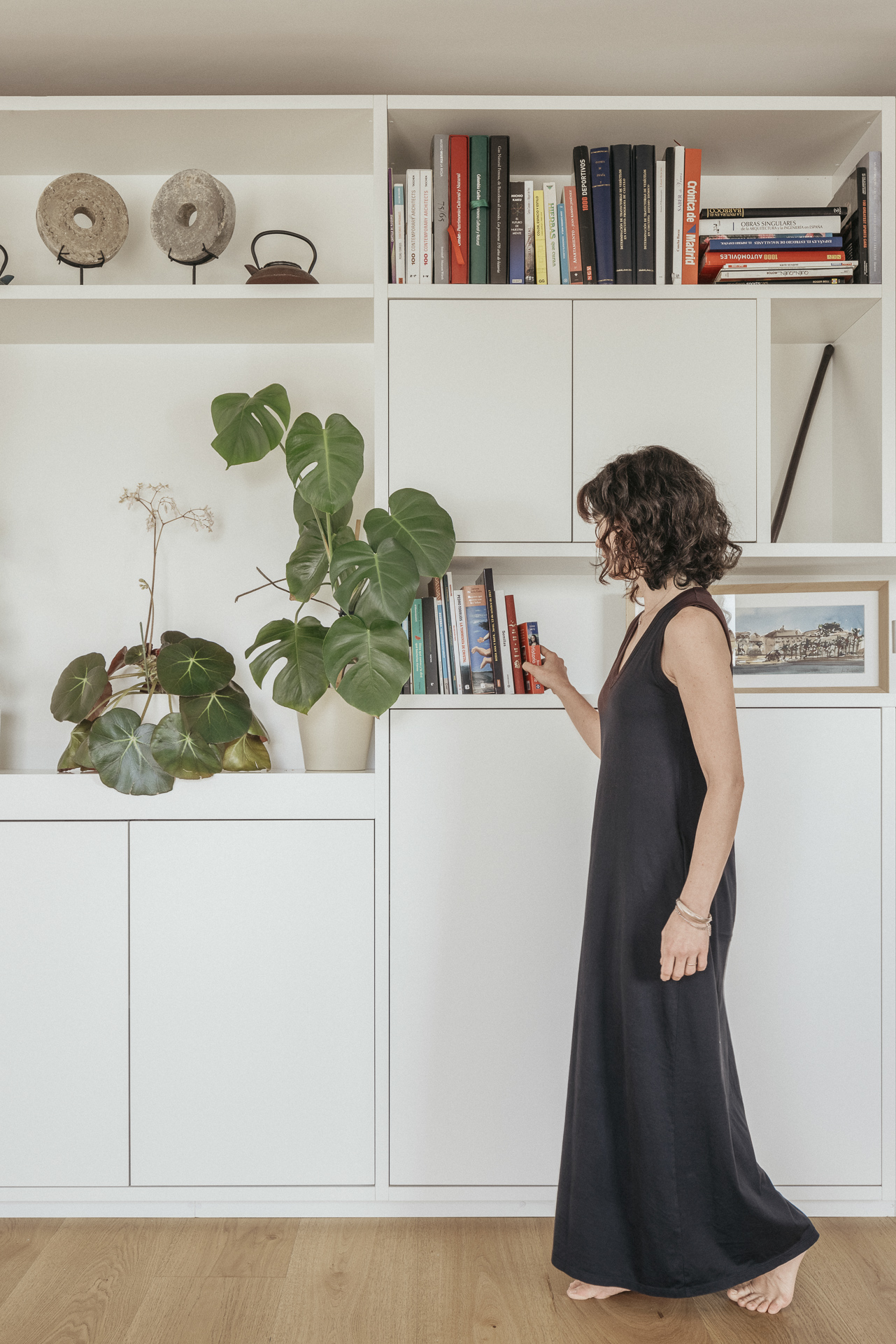 La vivienda cuenta también con la presencia de la artista y acuarelista Ana Barrera (www.anabarreraarte.com), quien protagoniza algunas de las imágenes y cuyas obras forman parte del interiorismo. En el acceso se exhibe la serie de acuarelas “En pie” (2020), generando una bienvenida cálida y reflexiva. En el mueble central de la zona de día se encuentra la obra en acuarela “Palma” (2016), que aporta una nota botánica y delicada al entorno cotidiano, reforzando el diálogo entre arte, arquitectura y vida diaria.