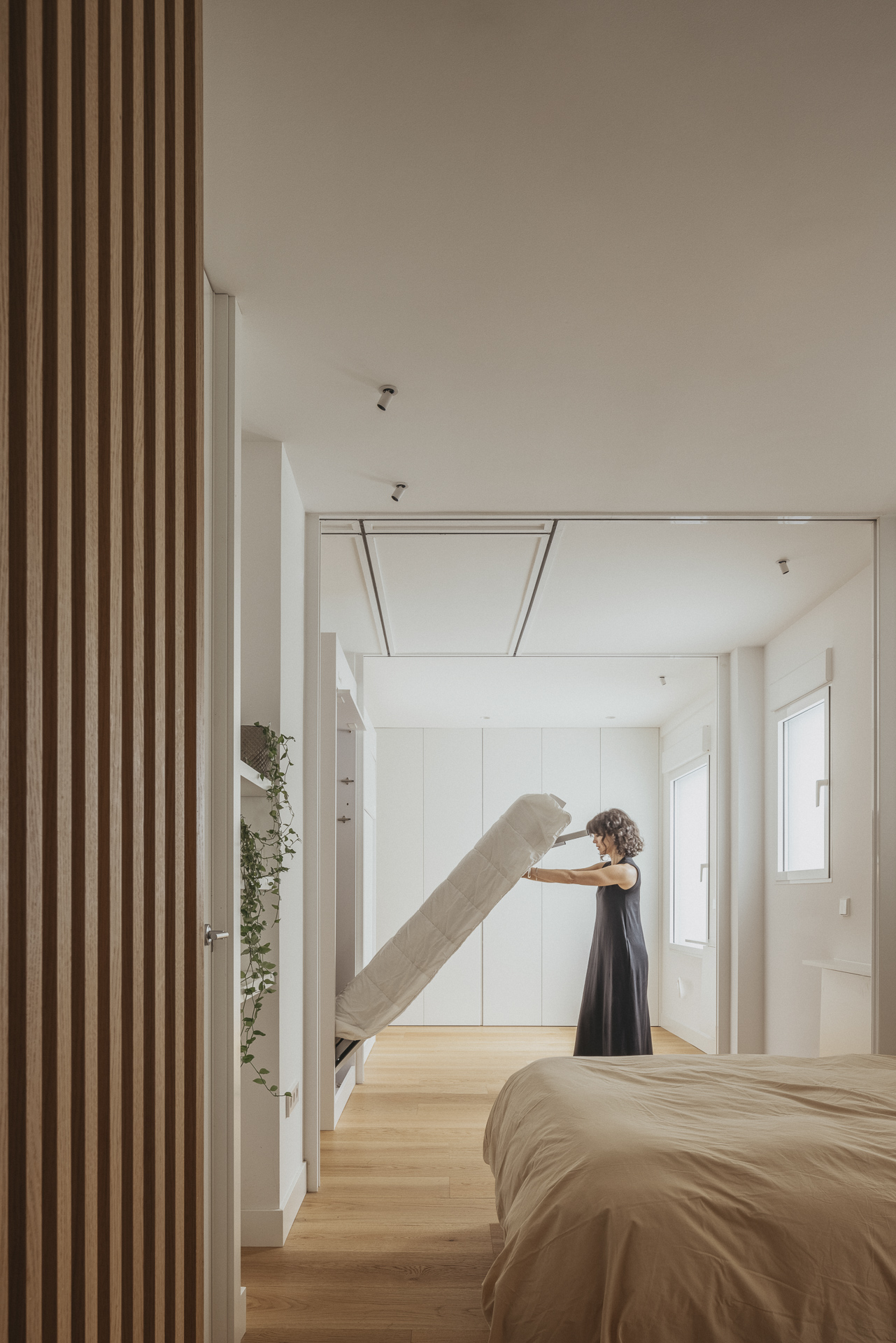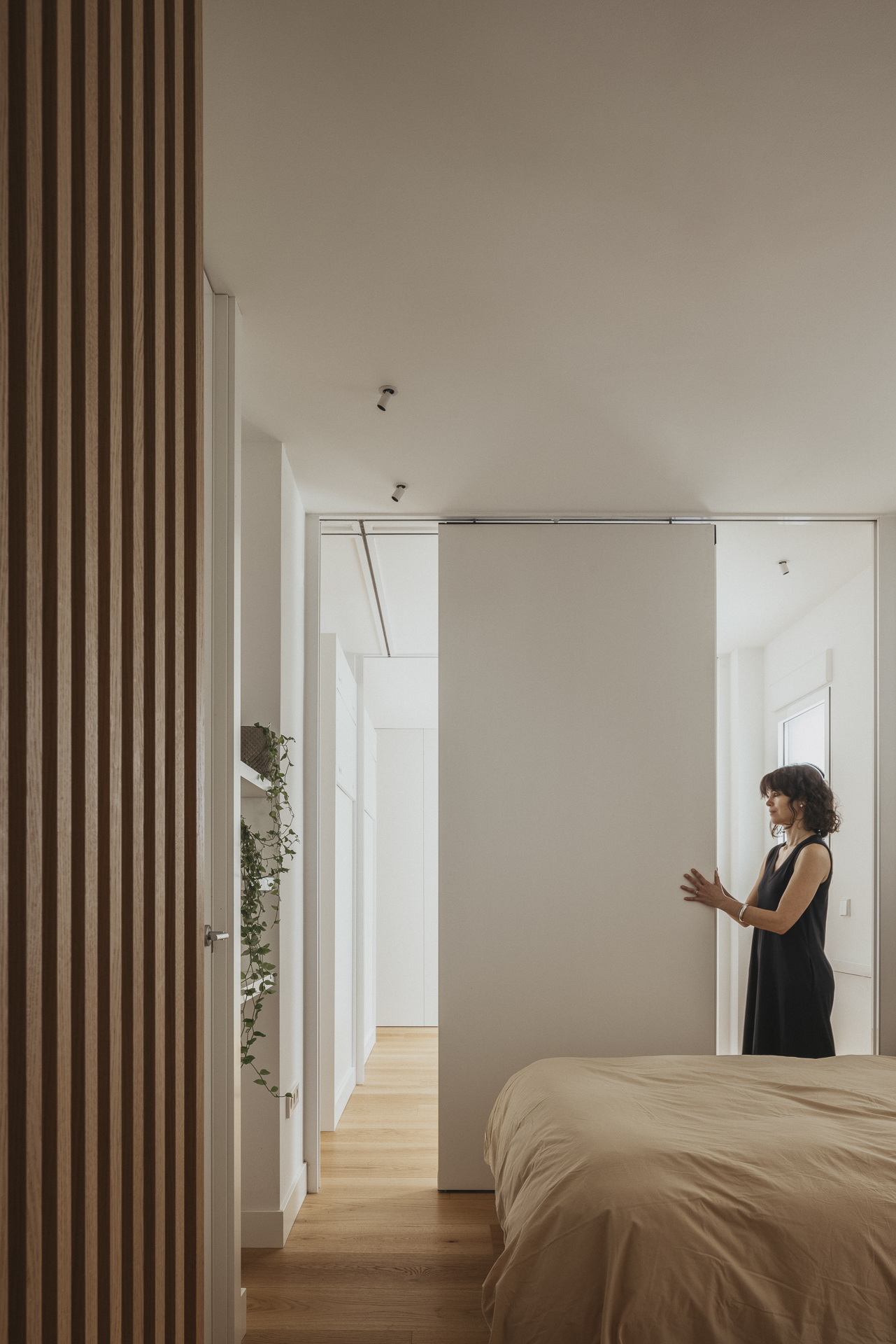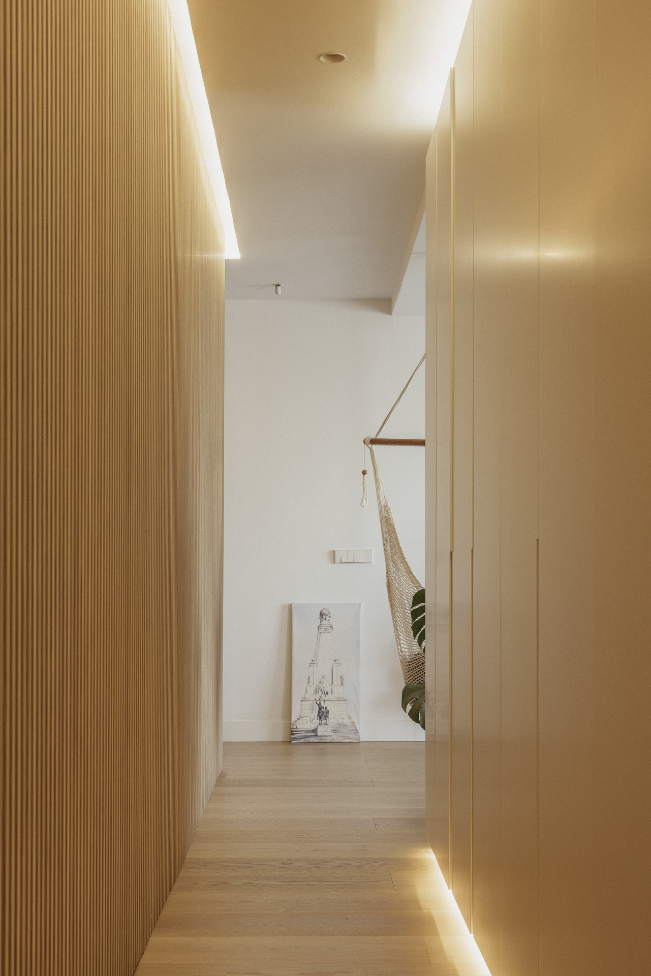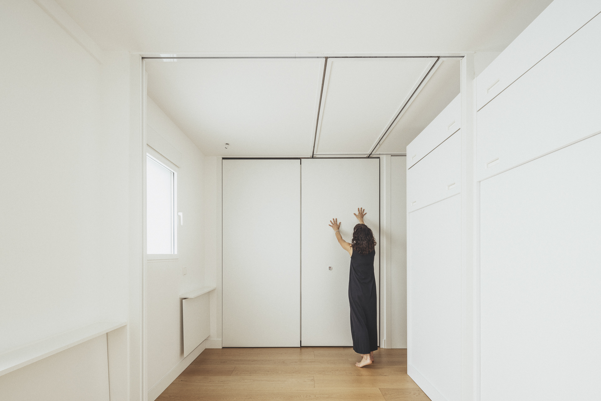 La nueva distribución elimina pasillos innecesarios, priorizando una circulación fluida y espacios continuos. Uno de los recursos más singulares es la transformación del pasillo en un vestidor oculto: gracias a armarios integrados y puertas revestidas en madera, se genera una envolvente cálida y continua que une funcionalidad y estética con sutileza.