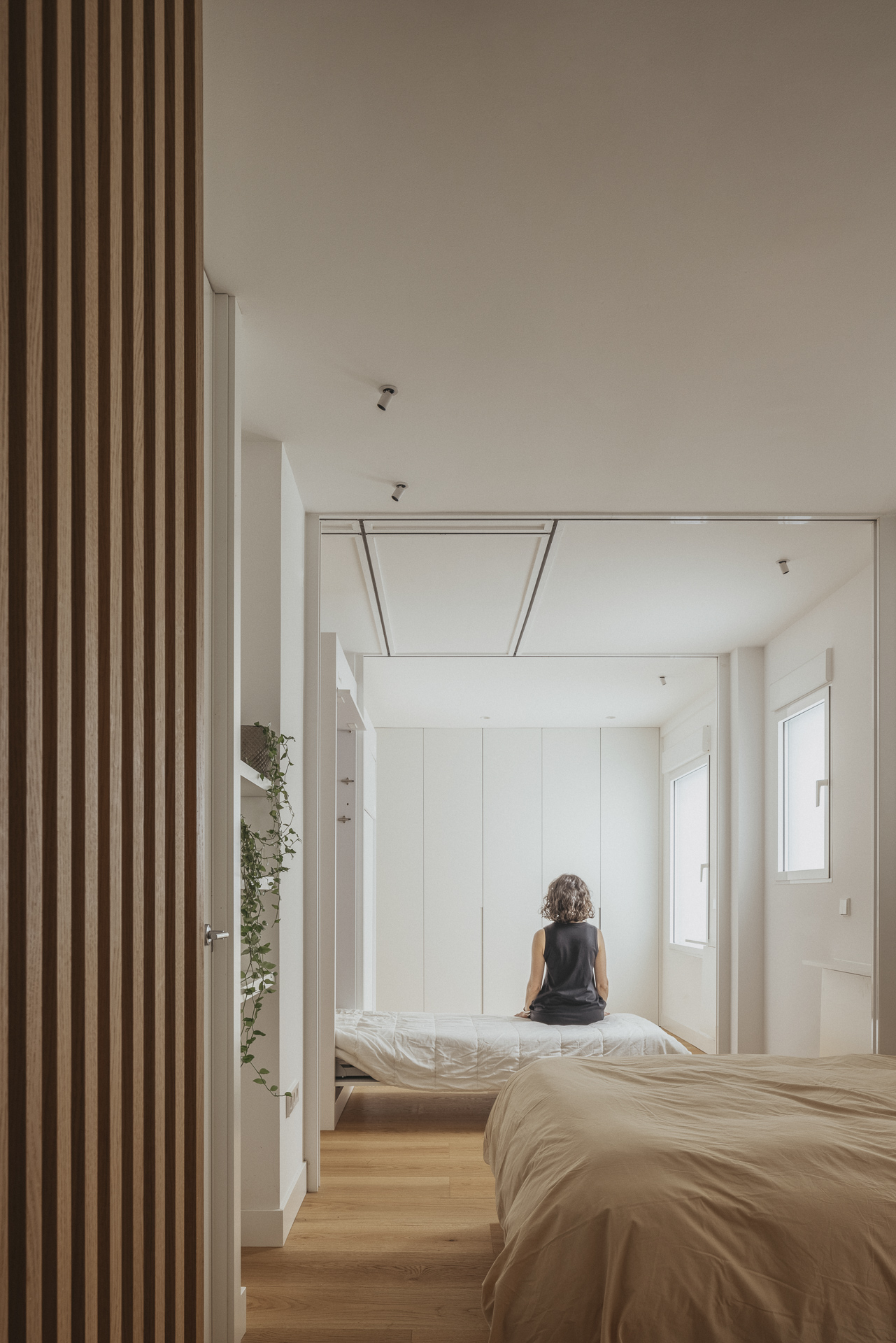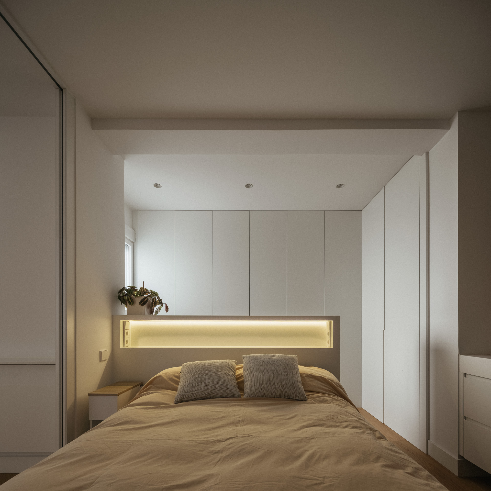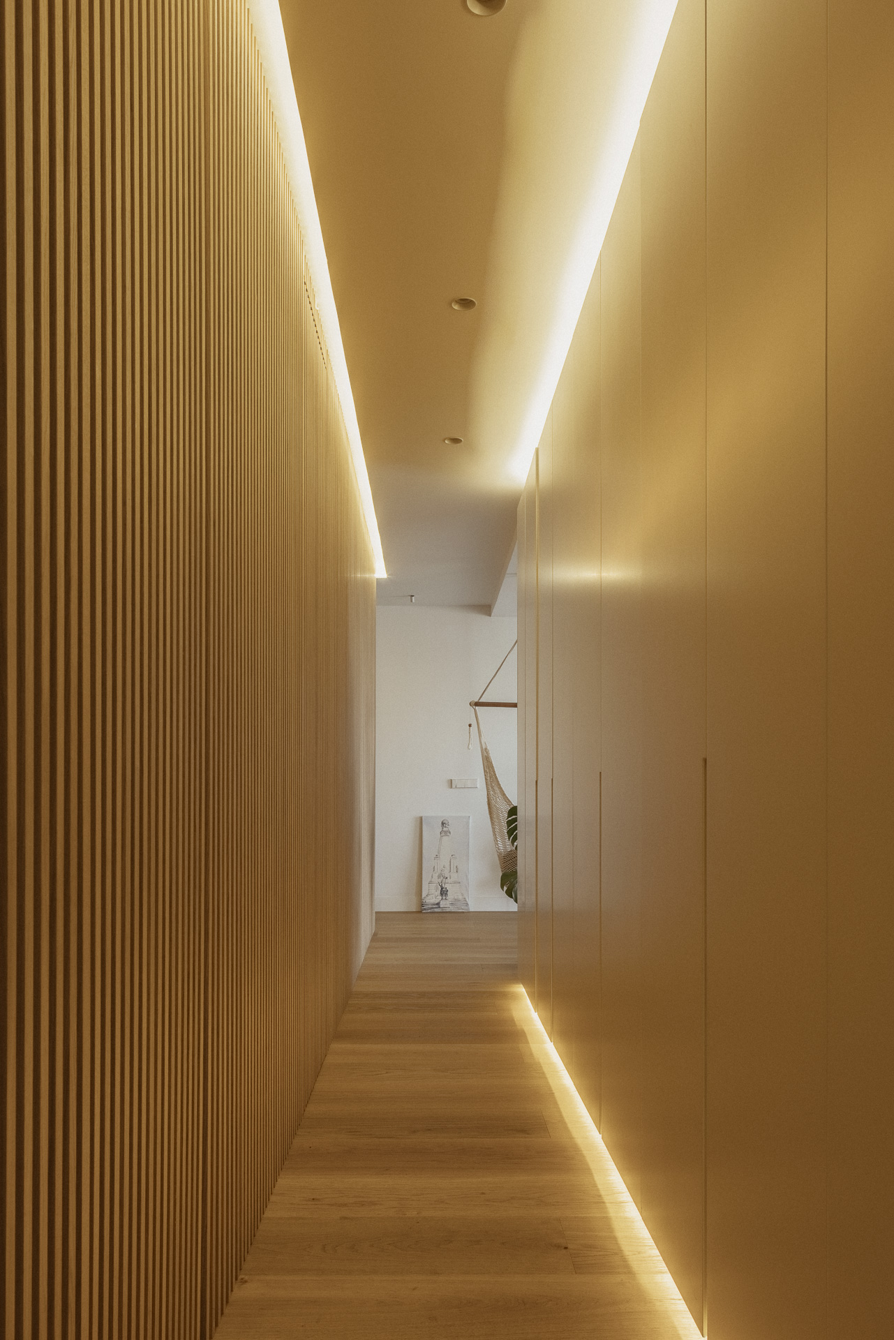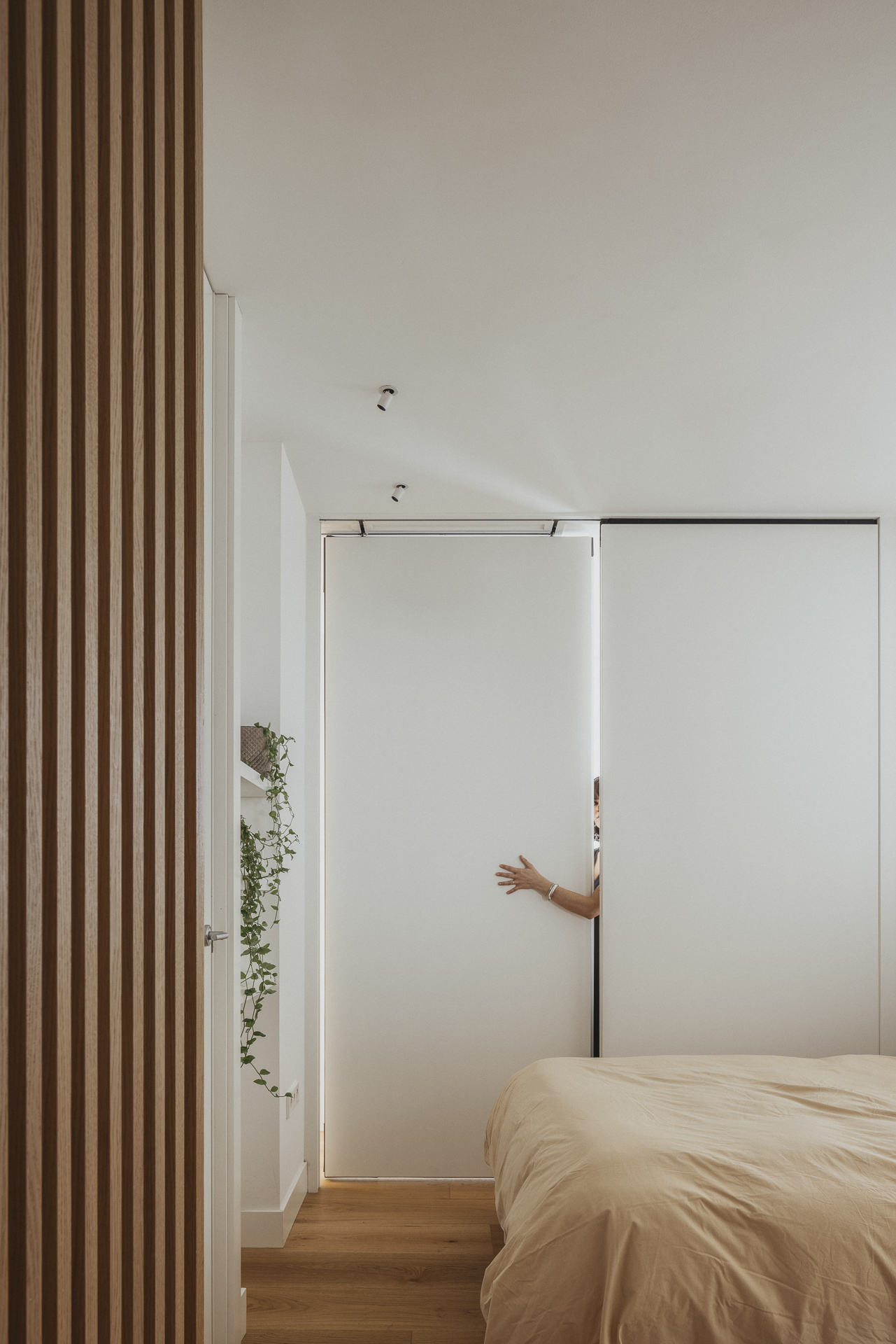 La nueva distribución elimina pasillos innecesarios, priorizando una circulación fluida y espacios continuos. Uno de los recursos más singulares es la transformación del pasillo en un vestidor oculto: gracias a armarios integrados y puertas revestidas en madera, se genera una envolvente cálida y continua que une funcionalidad y estética con sutileza.