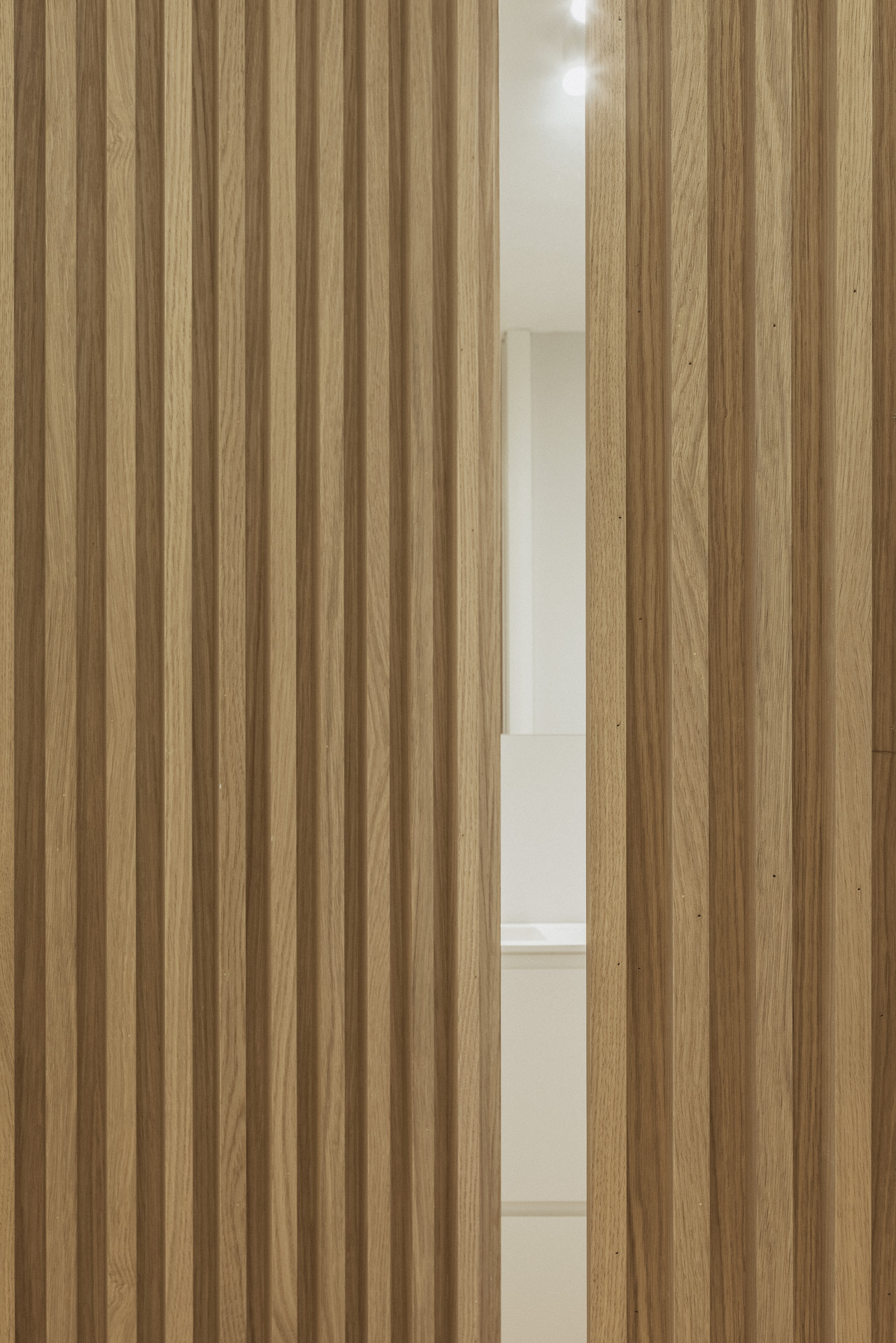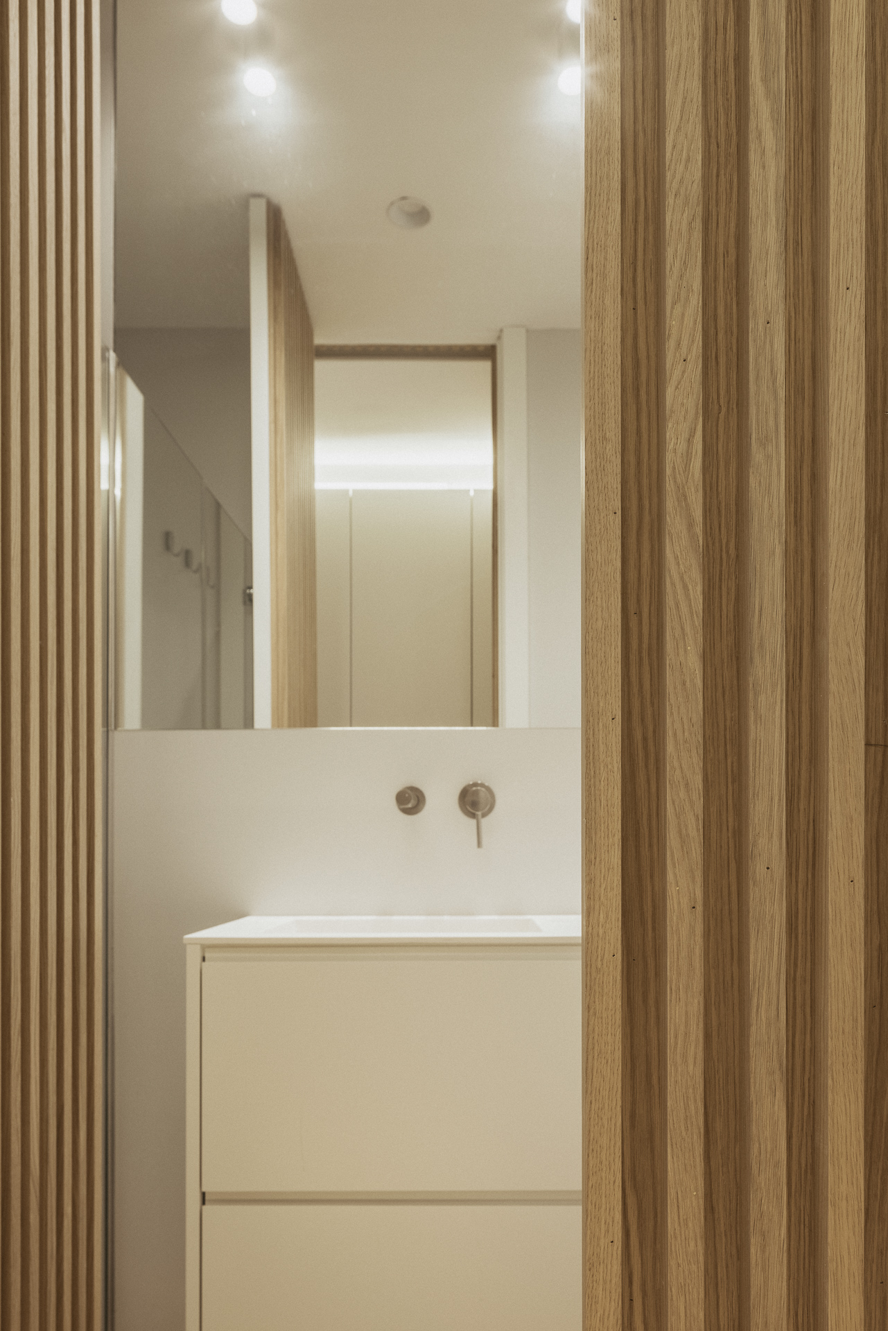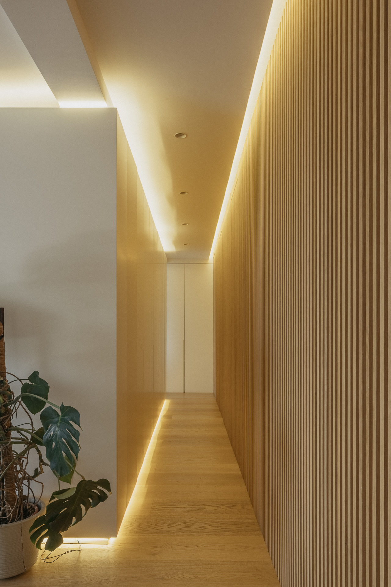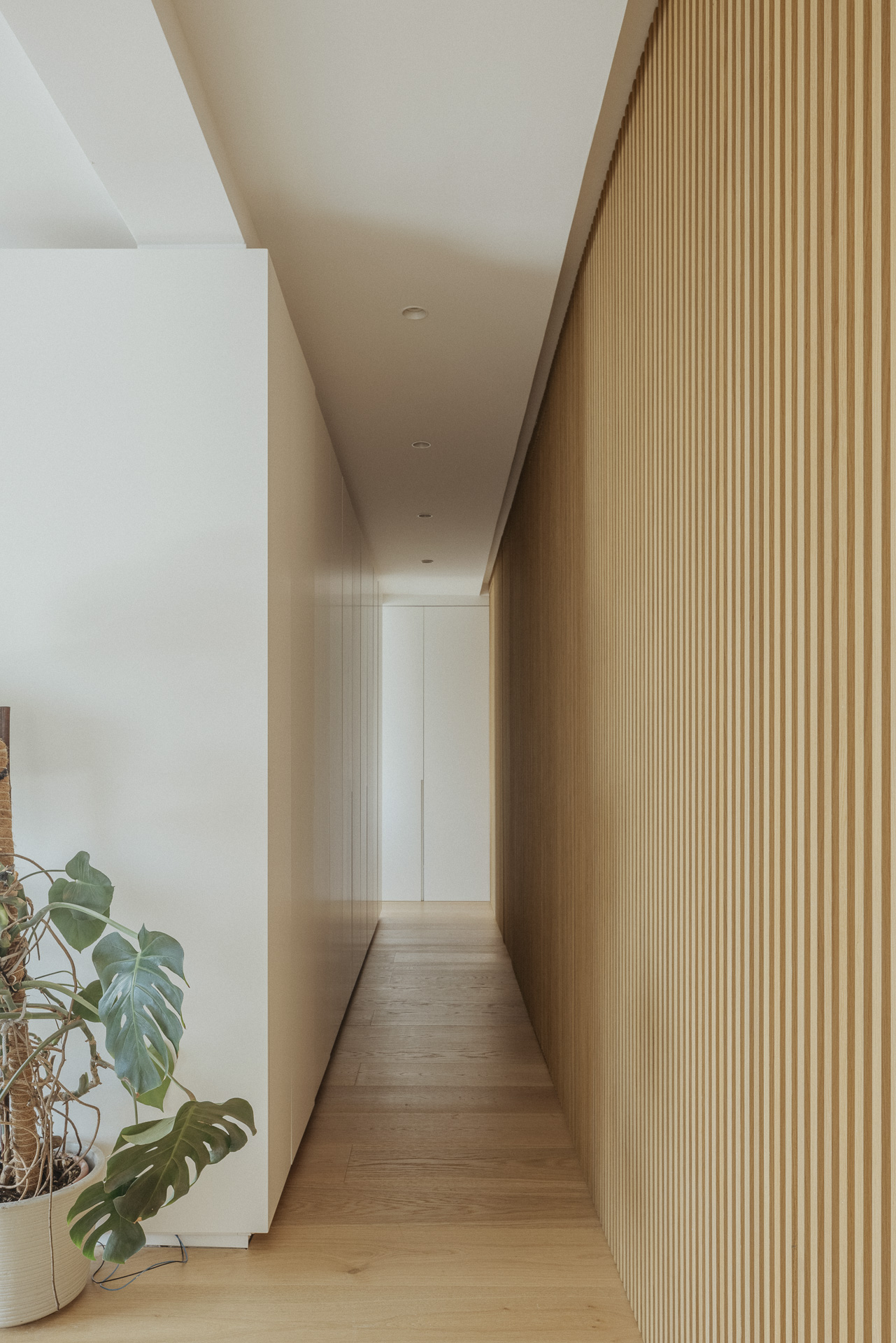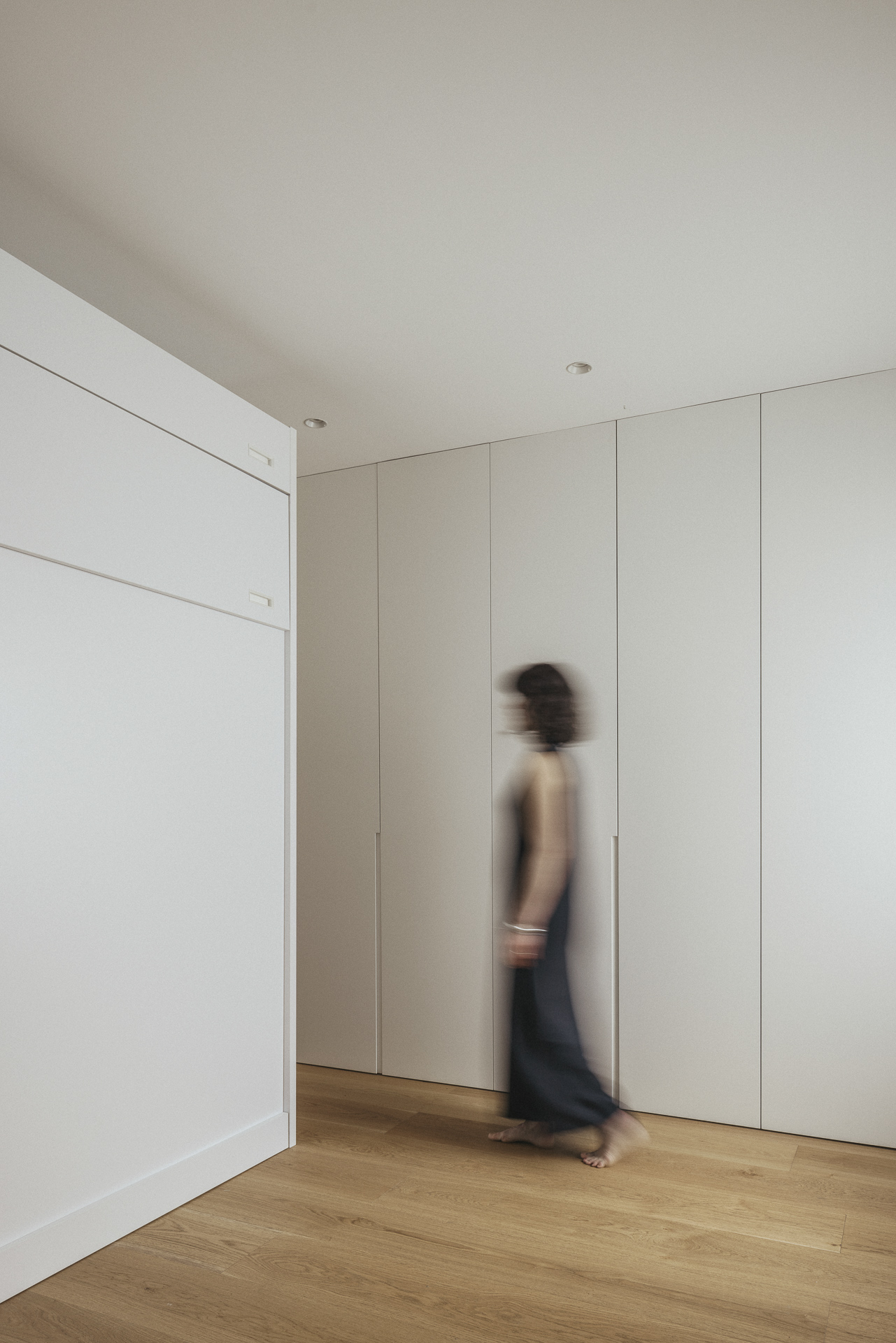 La nueva distribución elimina pasillos innecesarios, priorizando una circulación fluida y espacios continuos. Uno de los recursos más singulares es la transformación del pasillo en un vestidor oculto: gracias a armarios integrados y puertas revestidas en madera, se genera una envolvente cálida y continua que une funcionalidad y estética con sutileza.