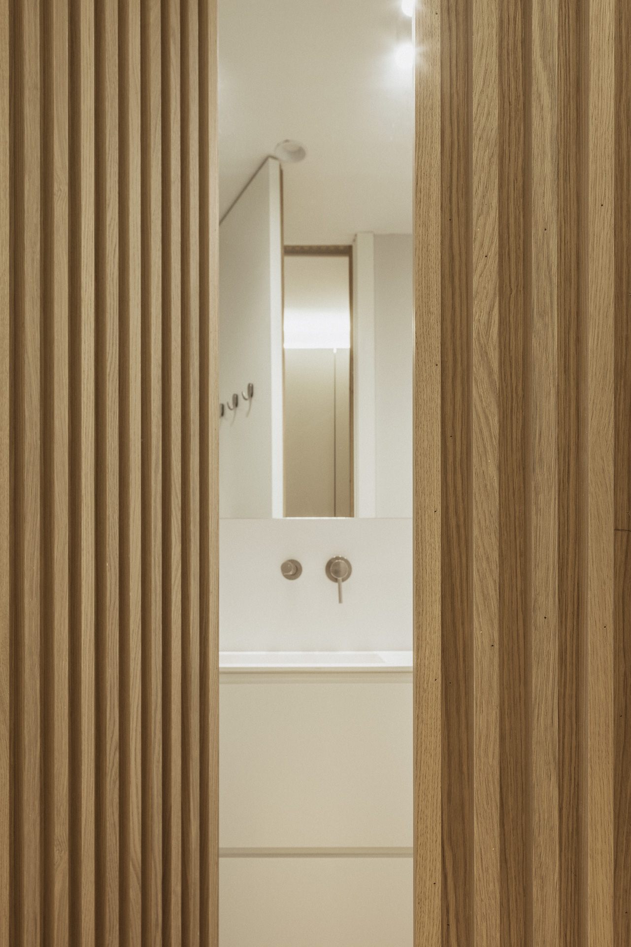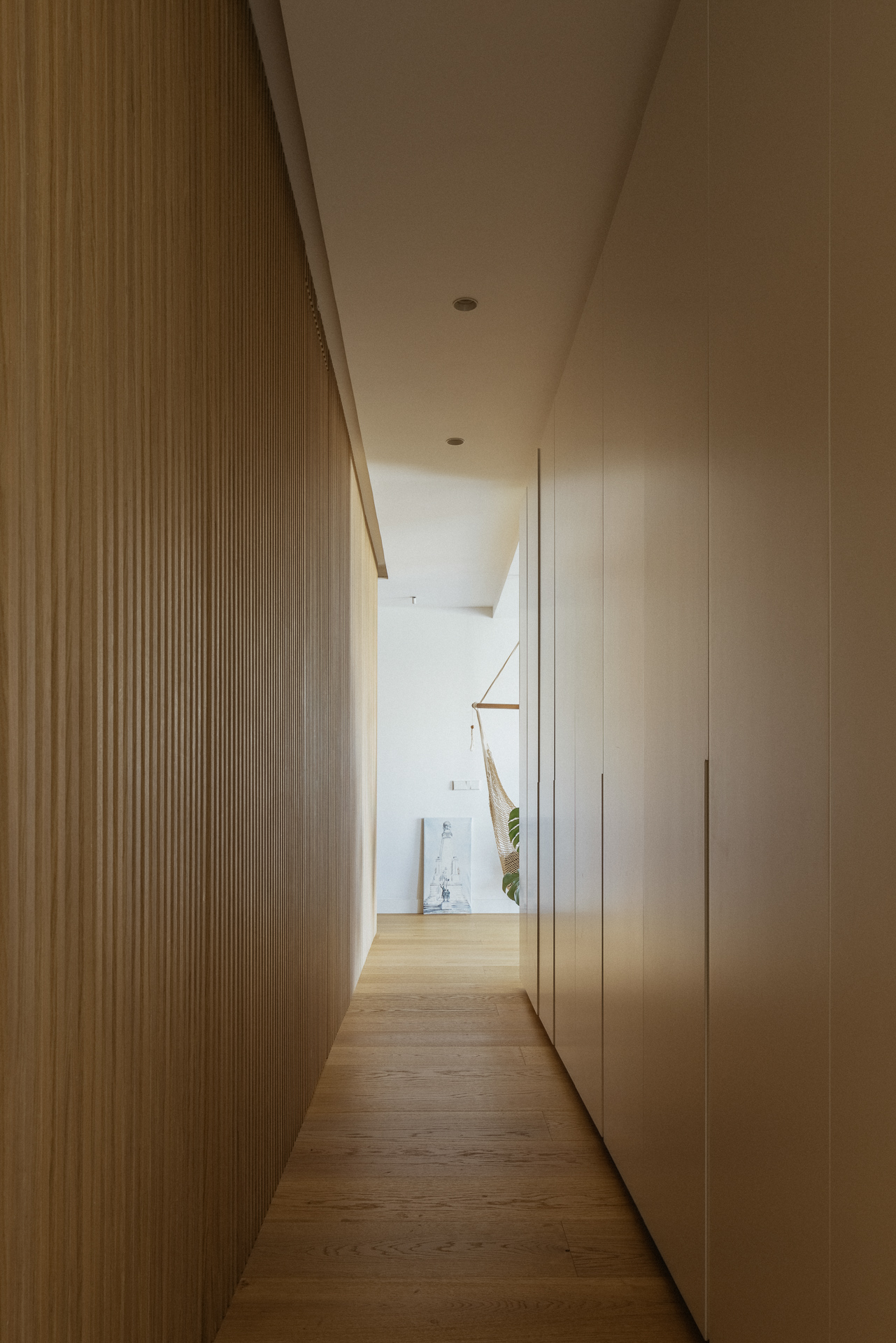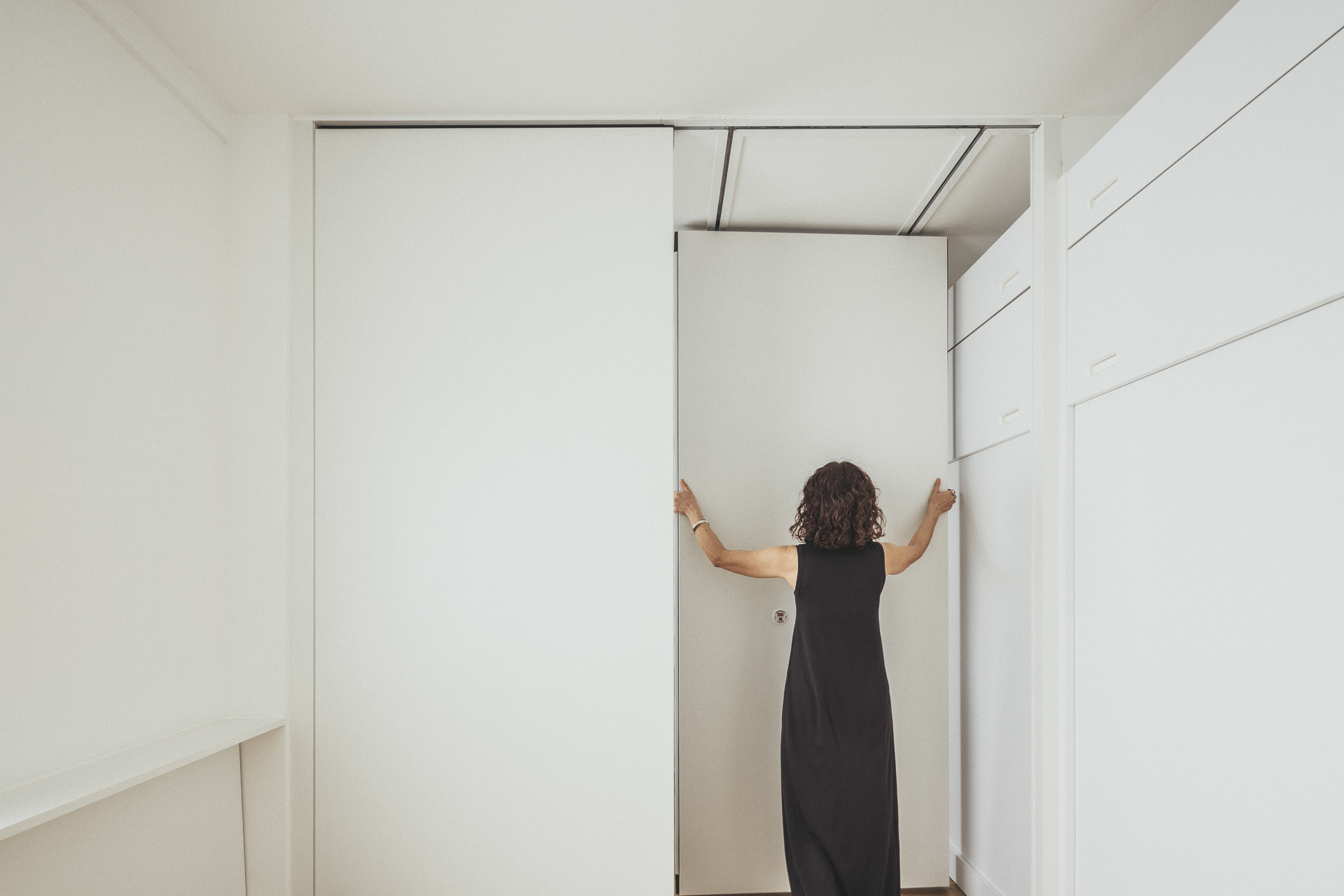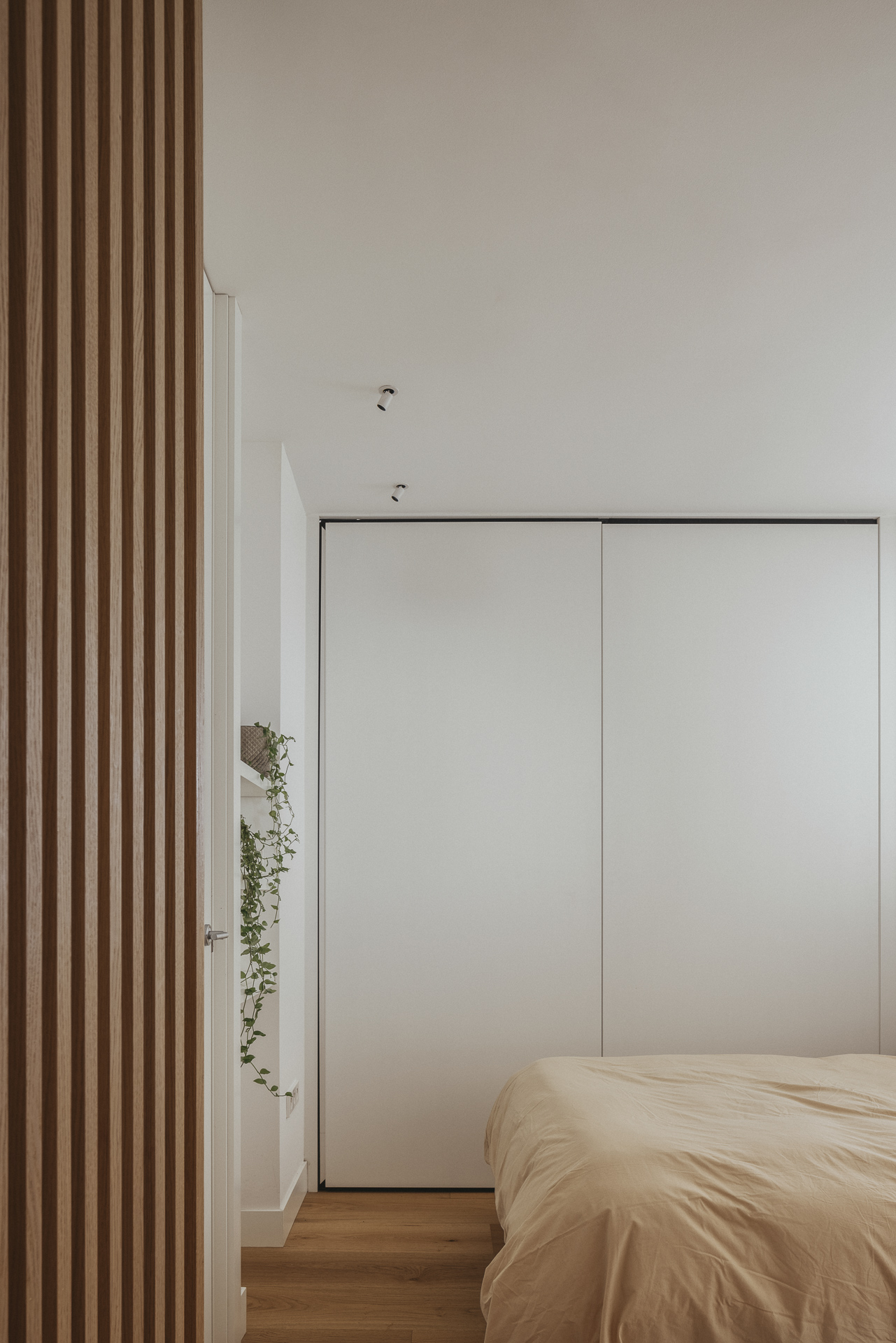 La nueva distribución elimina pasillos innecesarios, priorizando una circulación fluida y espacios continuos. Uno de los recursos más singulares es la transformación del pasillo en un vestidor oculto: gracias a armarios integrados y puertas revestidas en madera, se genera una envolvente cálida y continua que une funcionalidad y estética con sutileza.
