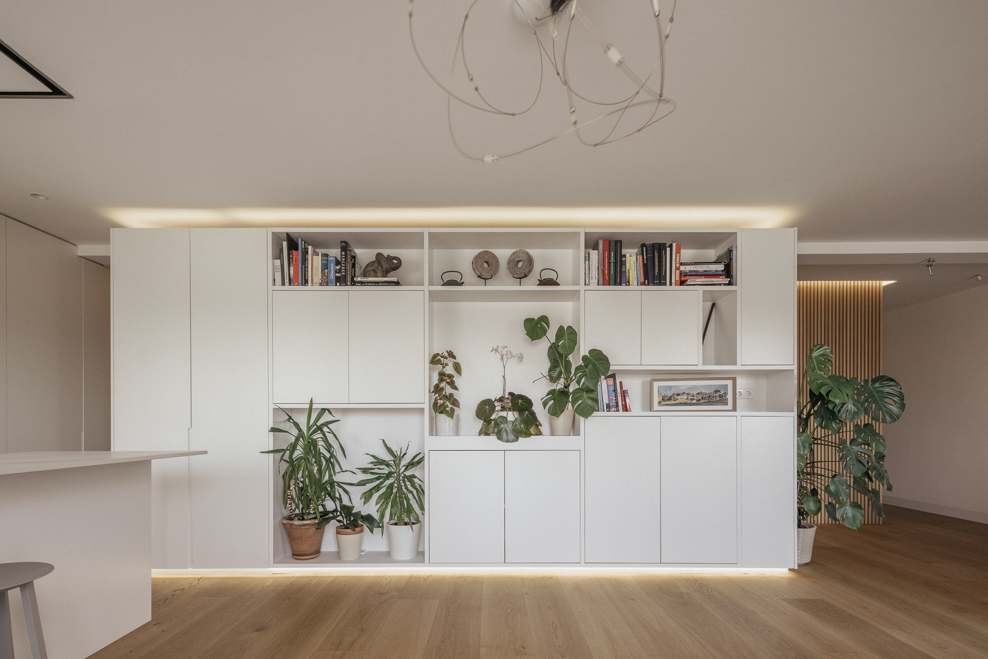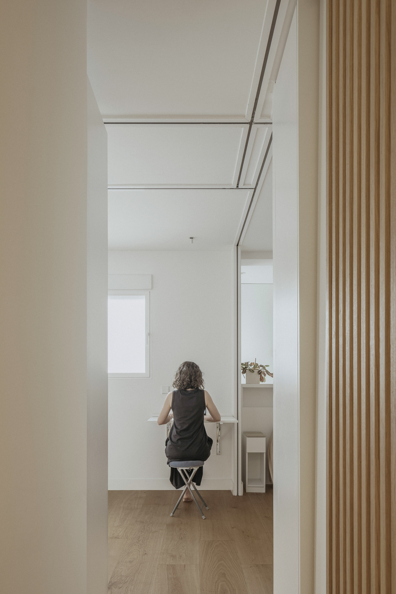 El corazón de la vivienda lo ocupa un volumen central, concebido como elemento articulador del espacio. Este núcleo, revestido en madera e inundado de luz, no solo abraza los elementos estructurales existentes, sino que también resuelve las necesidades de almacenamiento y organización: hacia la zona social se presenta como una estantería, mientras que en el área privada se transforma en un armario. Una solución que aporta continuidad visual, coherencia material y una nueva manera de entender la compartimentación sin renunciar a la amplitud ni a la claridad espacial.