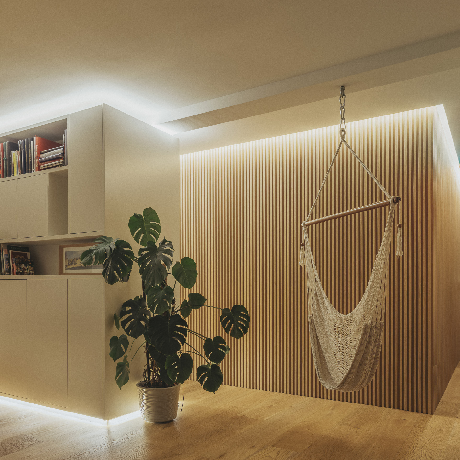 La paleta cromática (dominada por blancos, beiges y tonos naturales de la madera) crea un fondo sereno y luminoso, que potencia la presencia de la luz natural y permite que el mobiliario y los objetos personales cobren protagonismo en un entorno acogedor y armonioso.